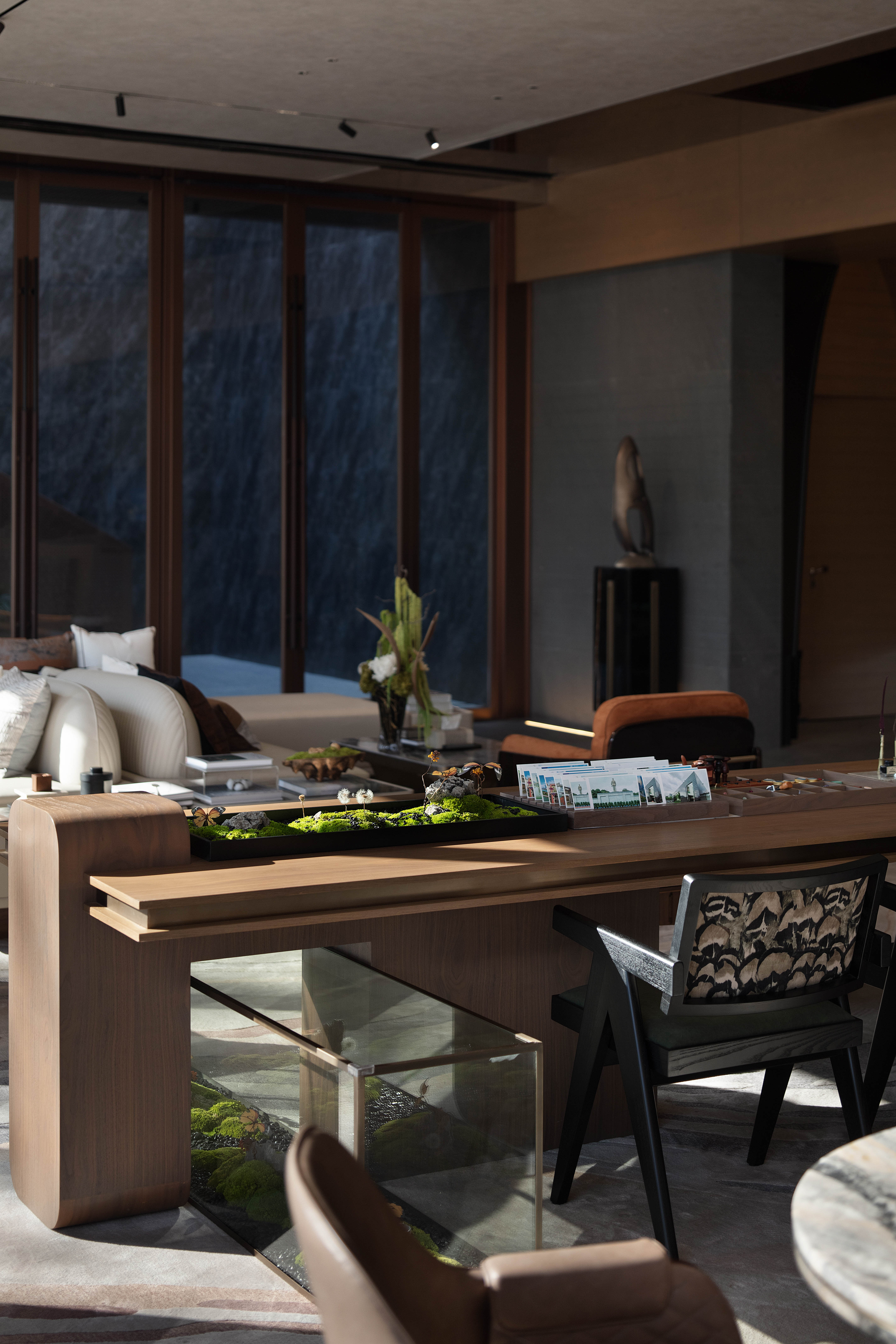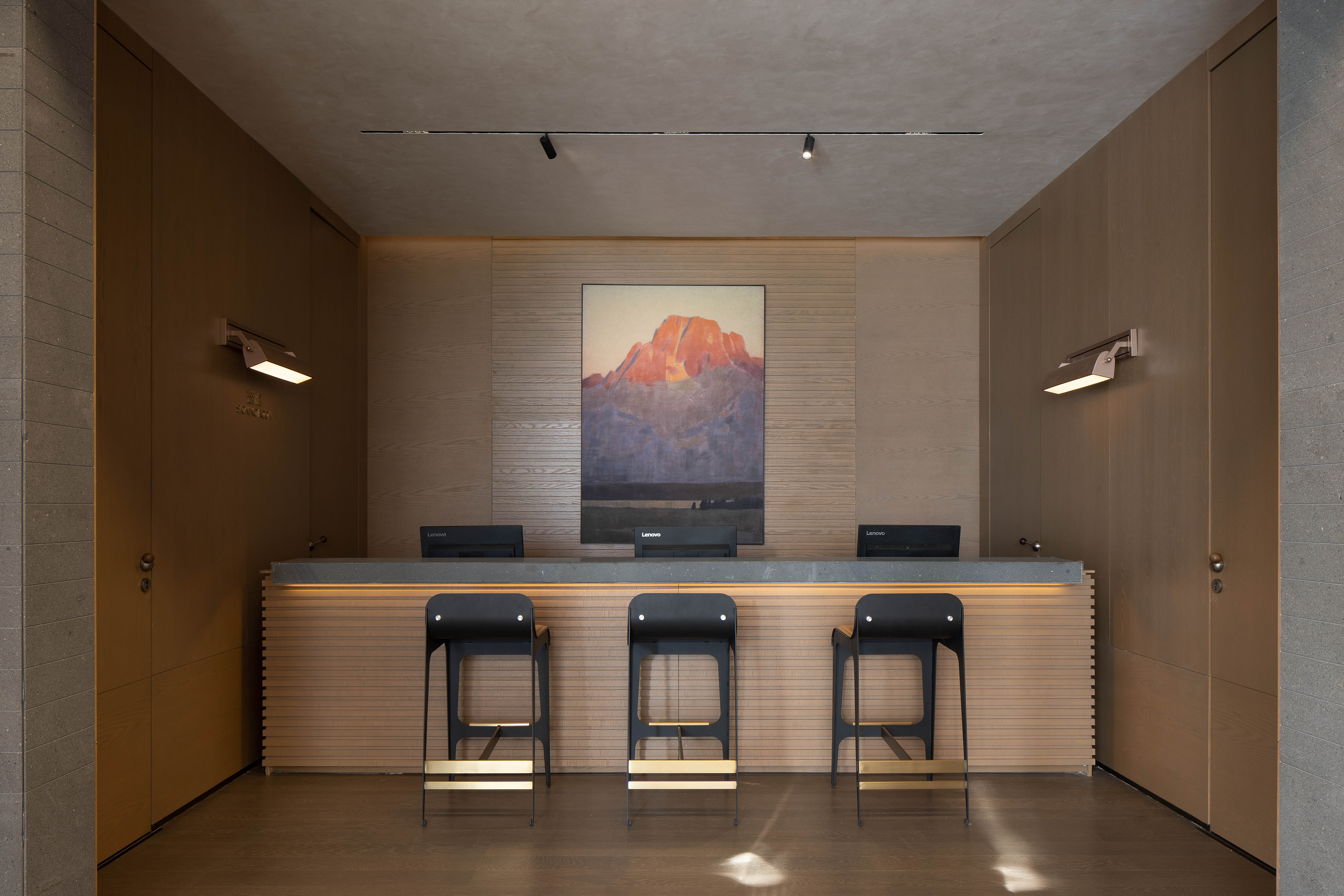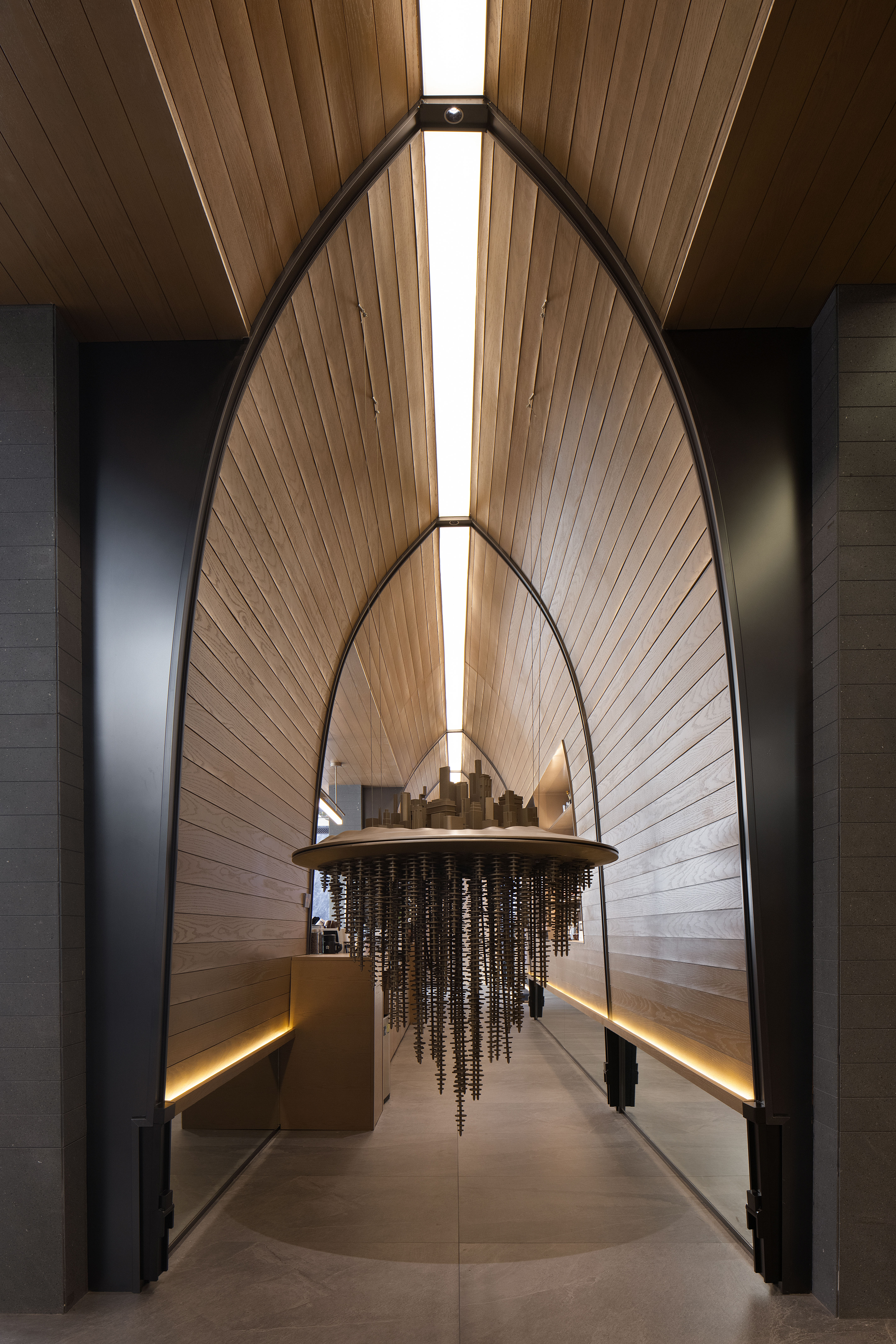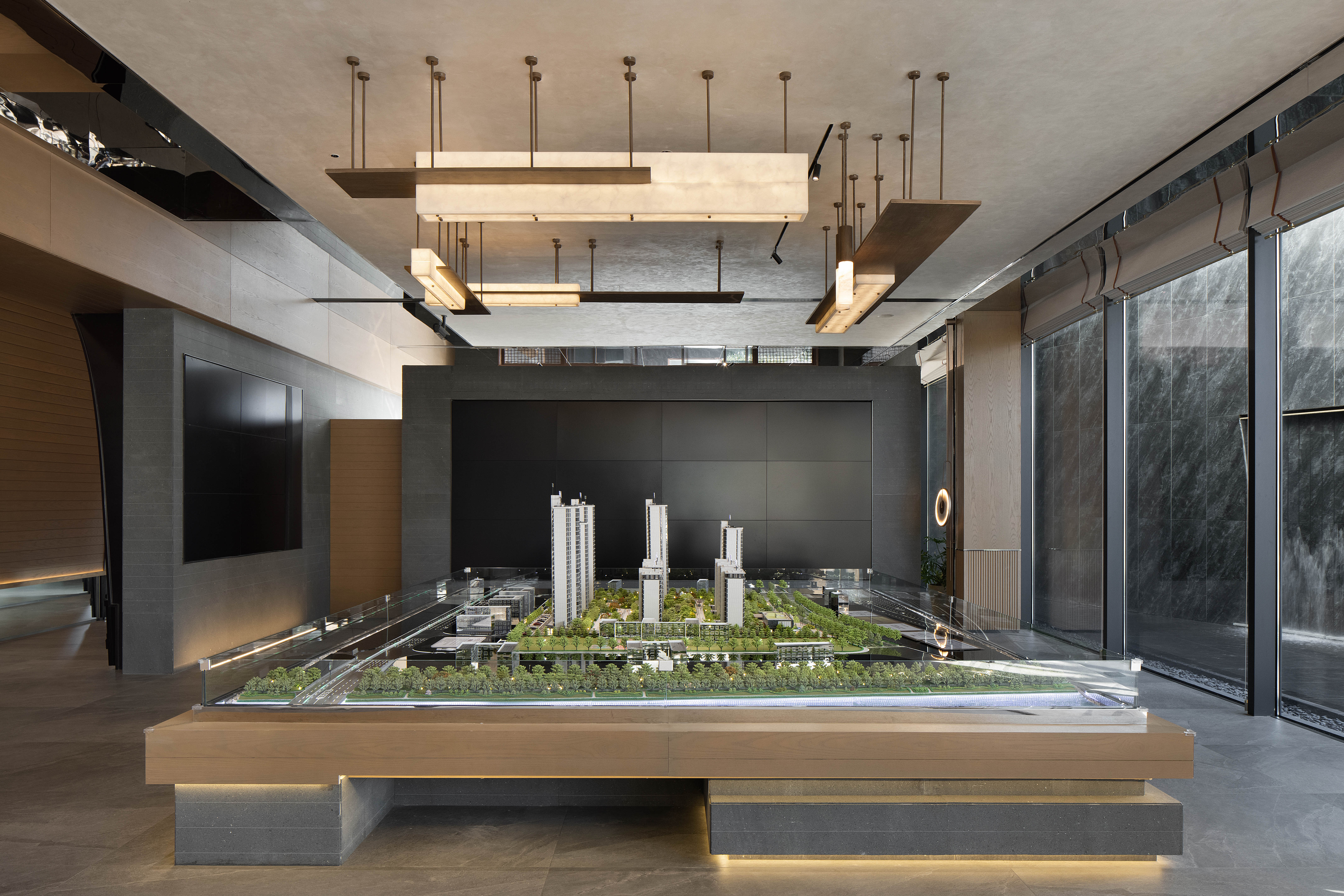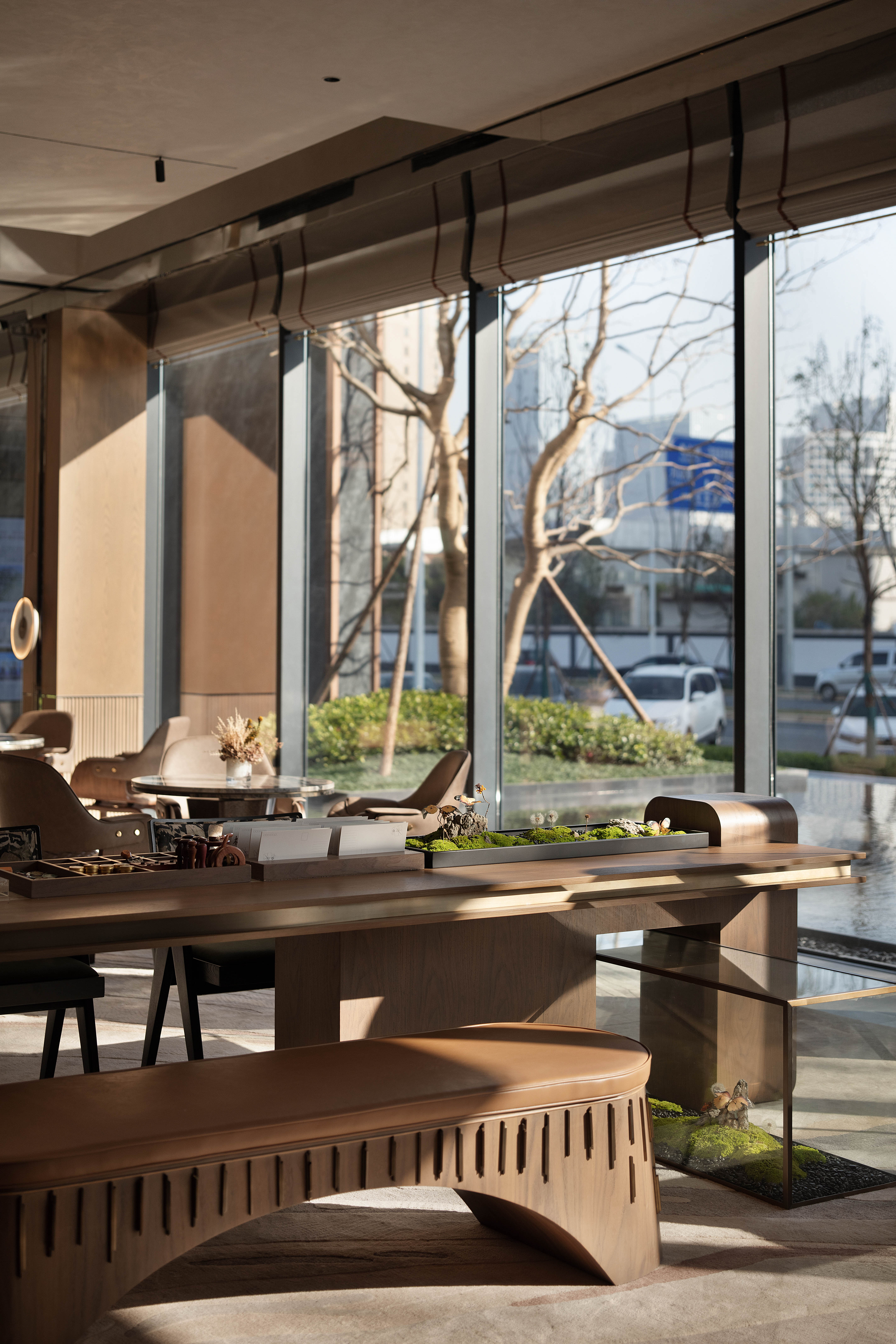 空间意境:走廊墙壁以扁舟形式,引人沉浸式步步递进,走向“城市群像”艺术装置。艺术为城市前行注入动力,不断向前求索,美学与文化的传承将生生不息。在需求越来越多样化的当下,营销中心不仅作为销售社交属性,更是一座生活体验馆。沙盘区域,设计师将视角放在空间整体协调度上,顶部层次感灯光与底部石材的堆叠互相呼应,构成统一秩序。开放式洽谈区不仅强调功能性、结构和形式的完整,设置不同组合式桌椅,满足多种形式的接待交流。并且追求材料及空间的表现深度与精确,运用最少的设计语言,表达出最深的设计内涵。我们经由颜色,感知人与自然的奇妙链接。融合自然色谱的丹桂色桌椅,天生富有厚度,赋予内心平静的疗愈力。东方墨色边桌,含蓄简约,将儒雅美学发挥到极致。