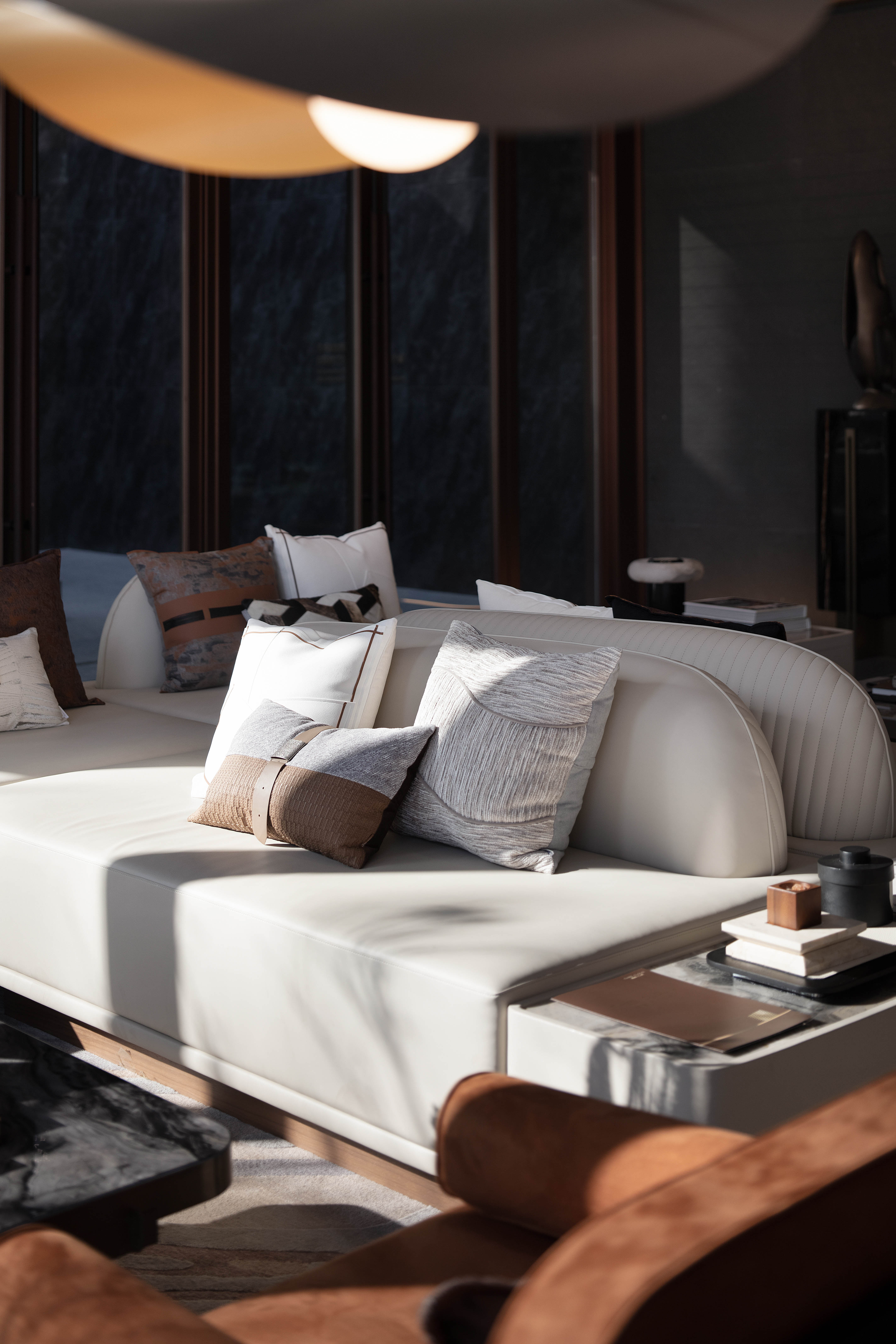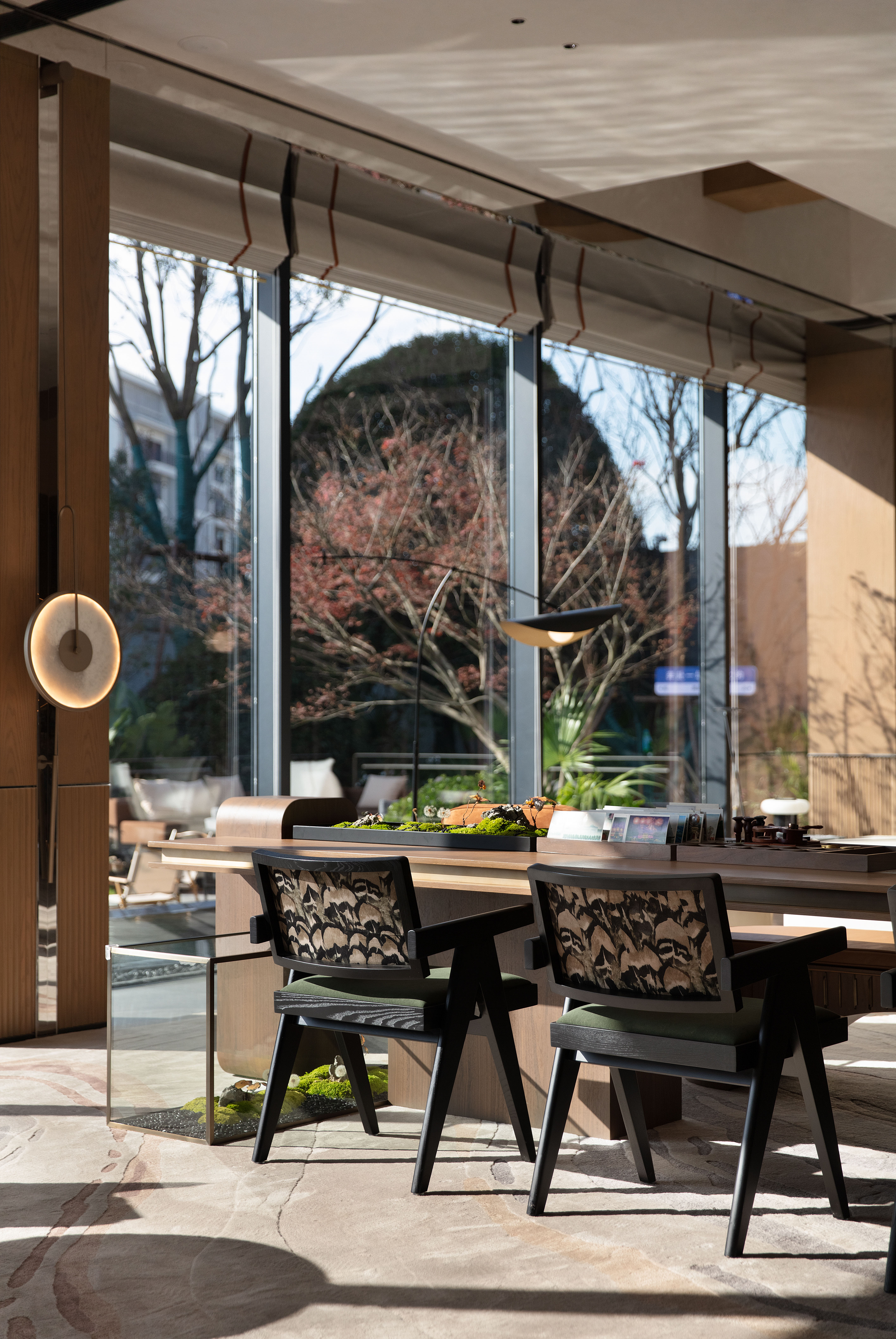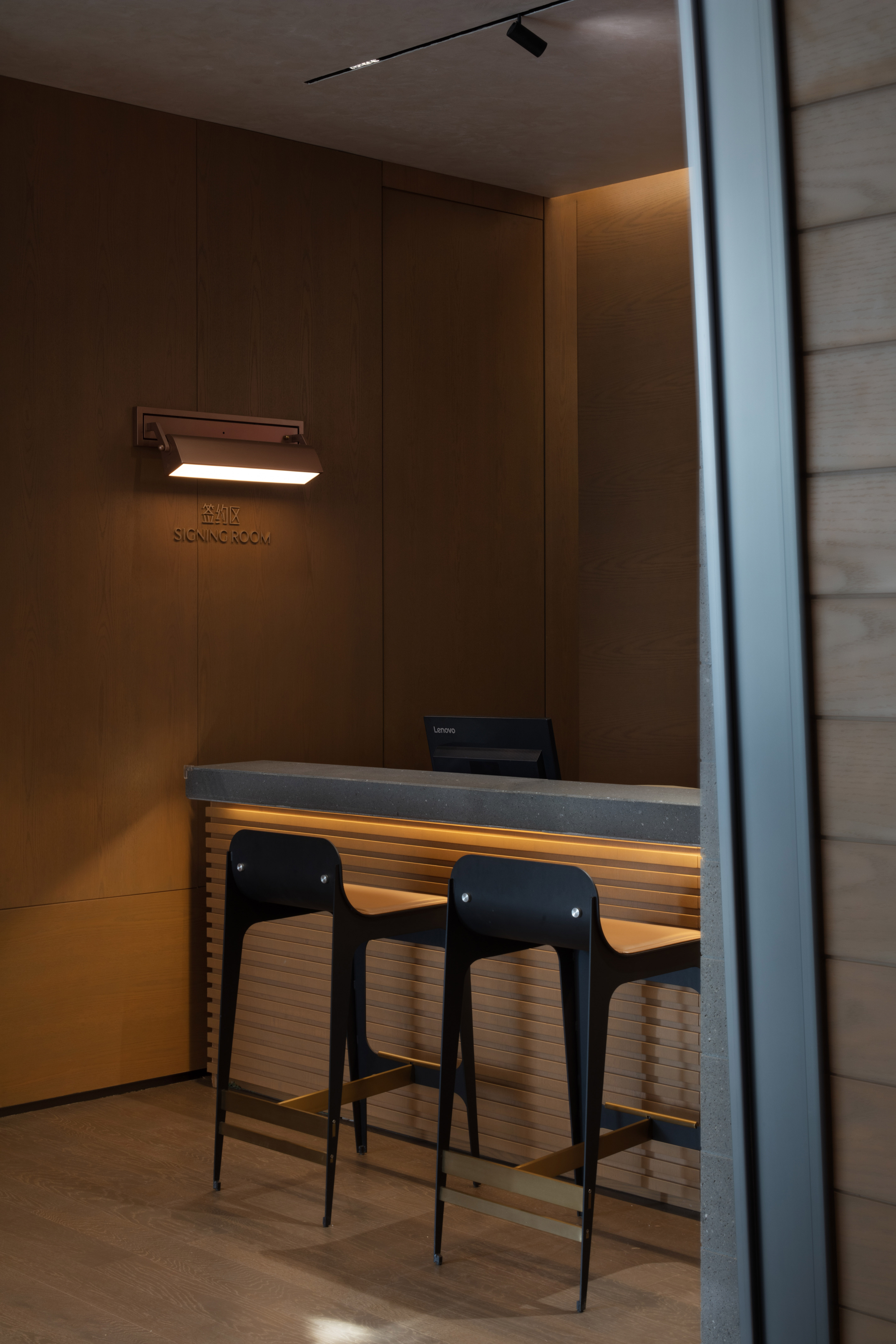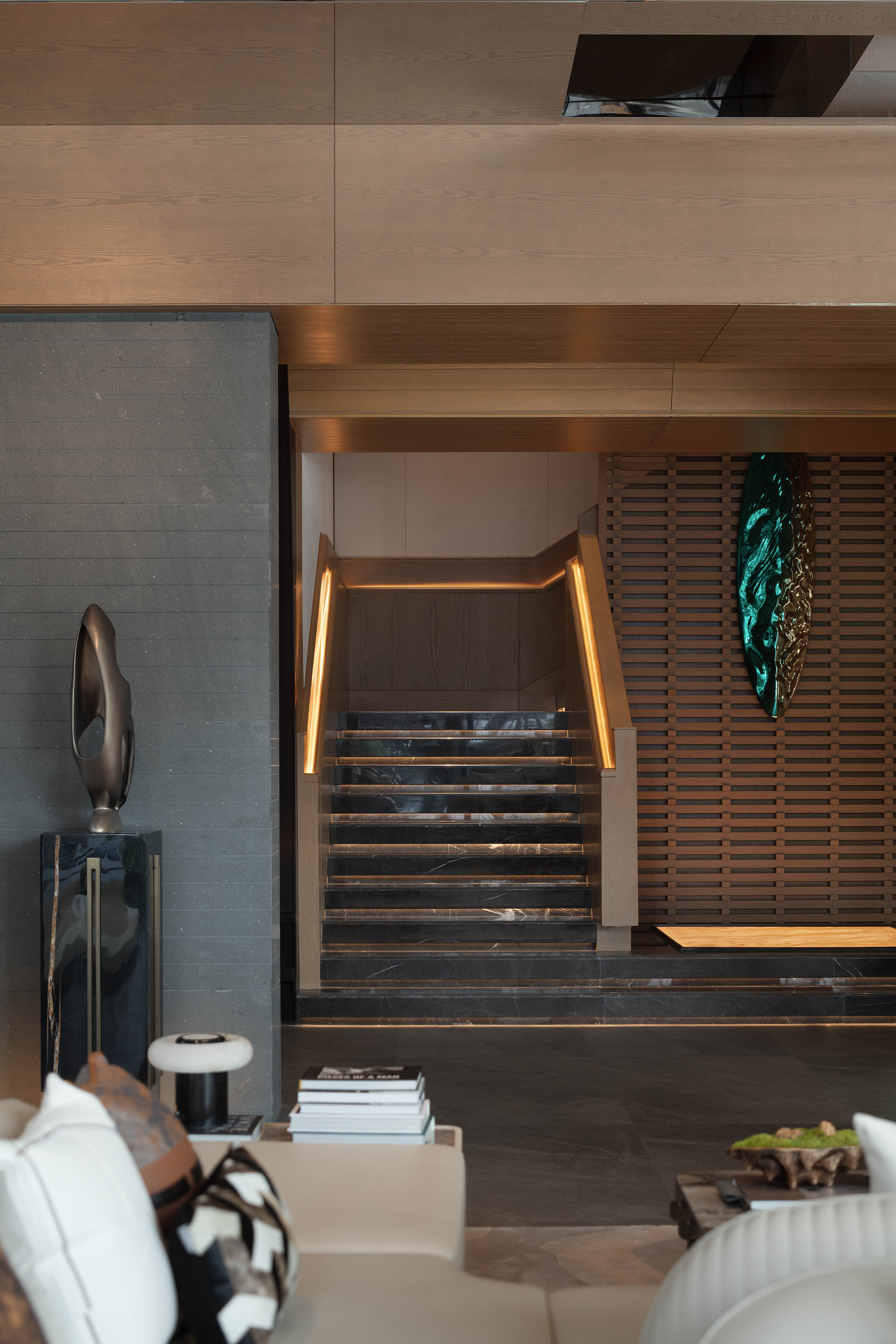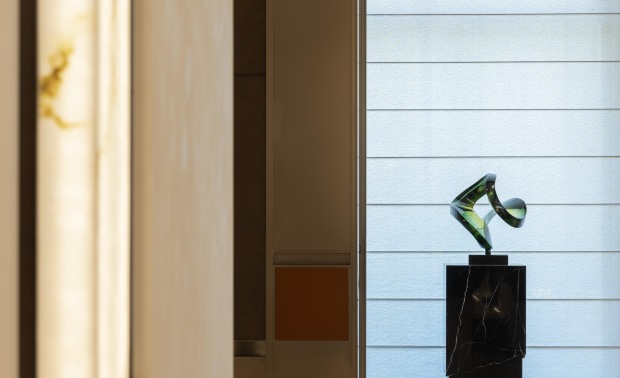 空间意境:走廊墙壁以扁舟形式,引人沉浸式步步递进,走向“城市群像”艺术装置。艺术为城市前行注入动力,不断向前求索,美学与文化的传承将生生不息。在需求越来越多样化的当下,营销中心不仅作为销售社交属性,更是一座生活体验馆。沙盘区域,设计师将视角放在空间整体协调度上,顶部层次感灯光与底部石材的堆叠互相呼应,构成统一秩序。开放式洽谈区不仅强调功能性、结构和形式的完整,设置不同组合式桌椅,满足多种形式的接待交流。并且追求材料及空间的表现深度与精确,运用最少的设计语言,表达出最深的设计内涵。我们经由颜色,感知人与自然的奇妙链接。融合自然色谱的丹桂色桌椅,天生富有厚度,赋予内心平静的疗愈力。东方墨色边桌,含蓄简约,将儒雅美学发挥到极致。