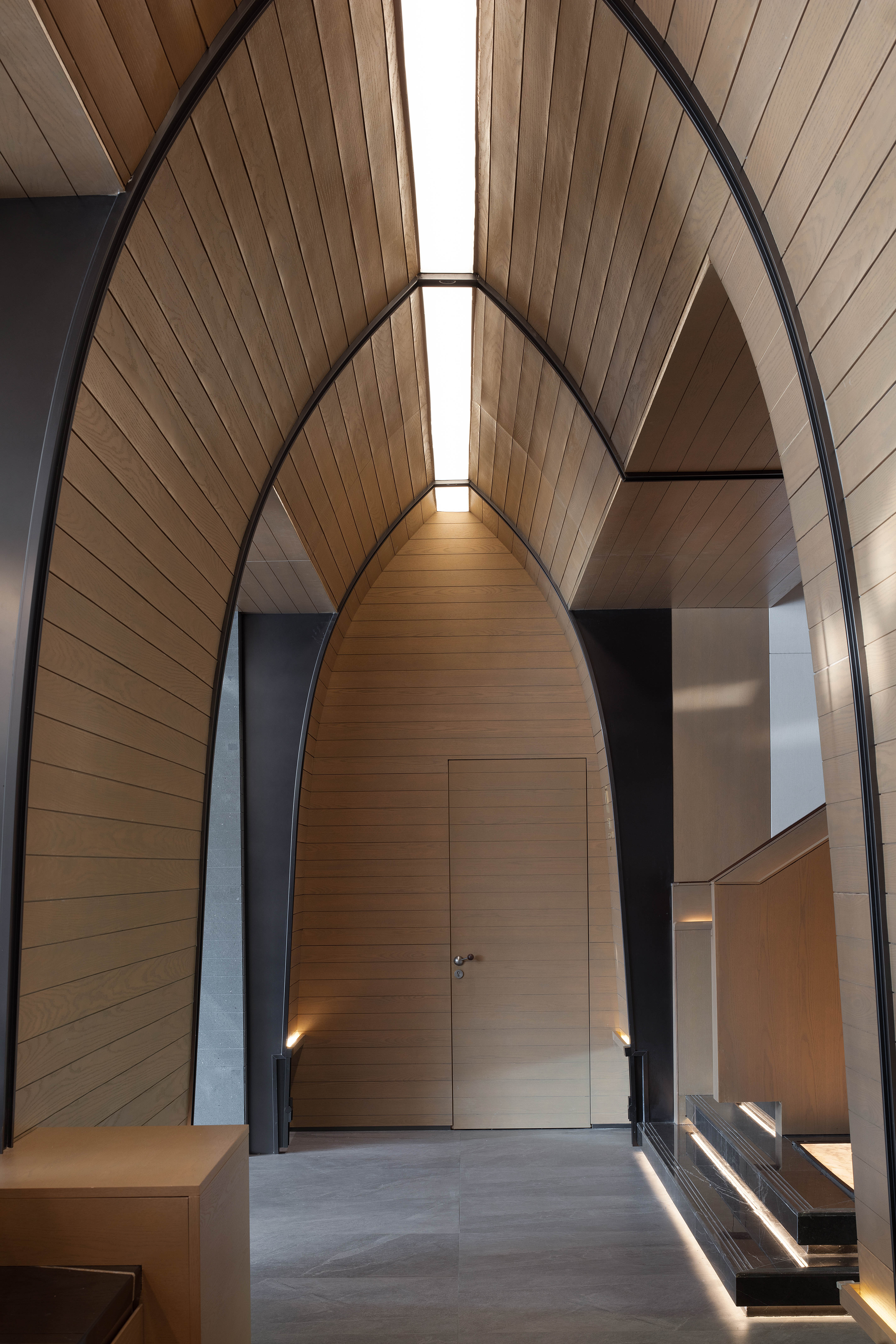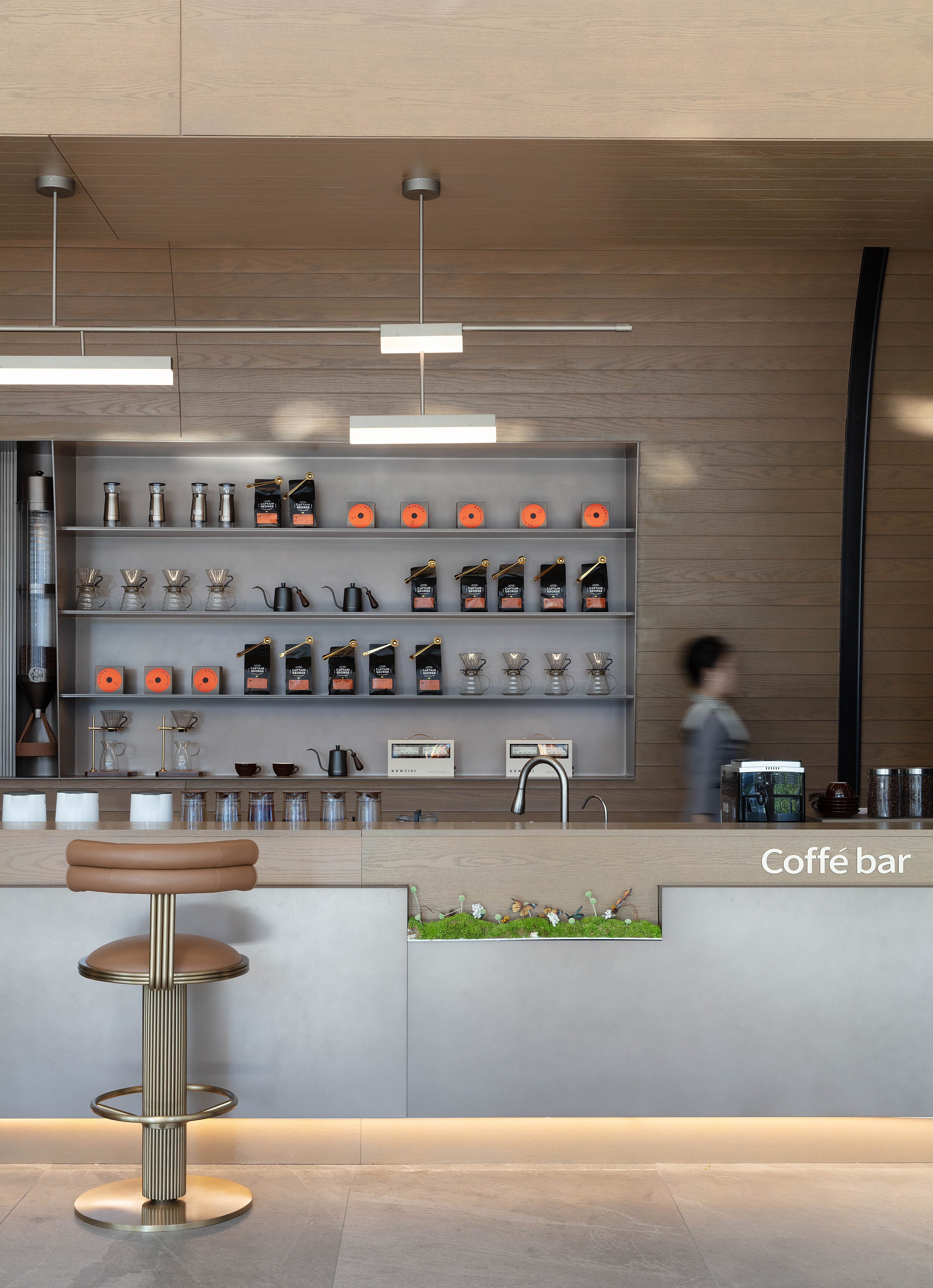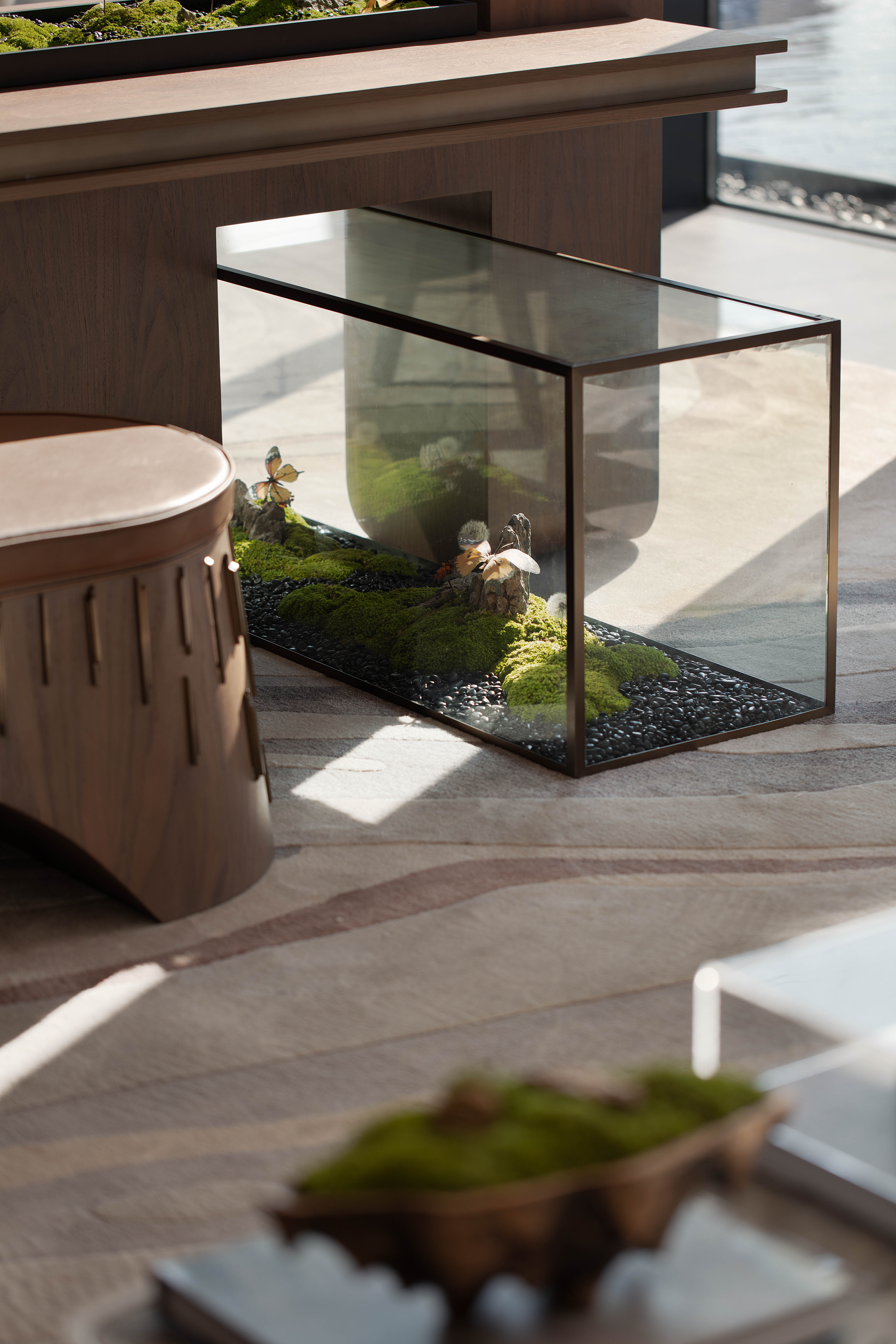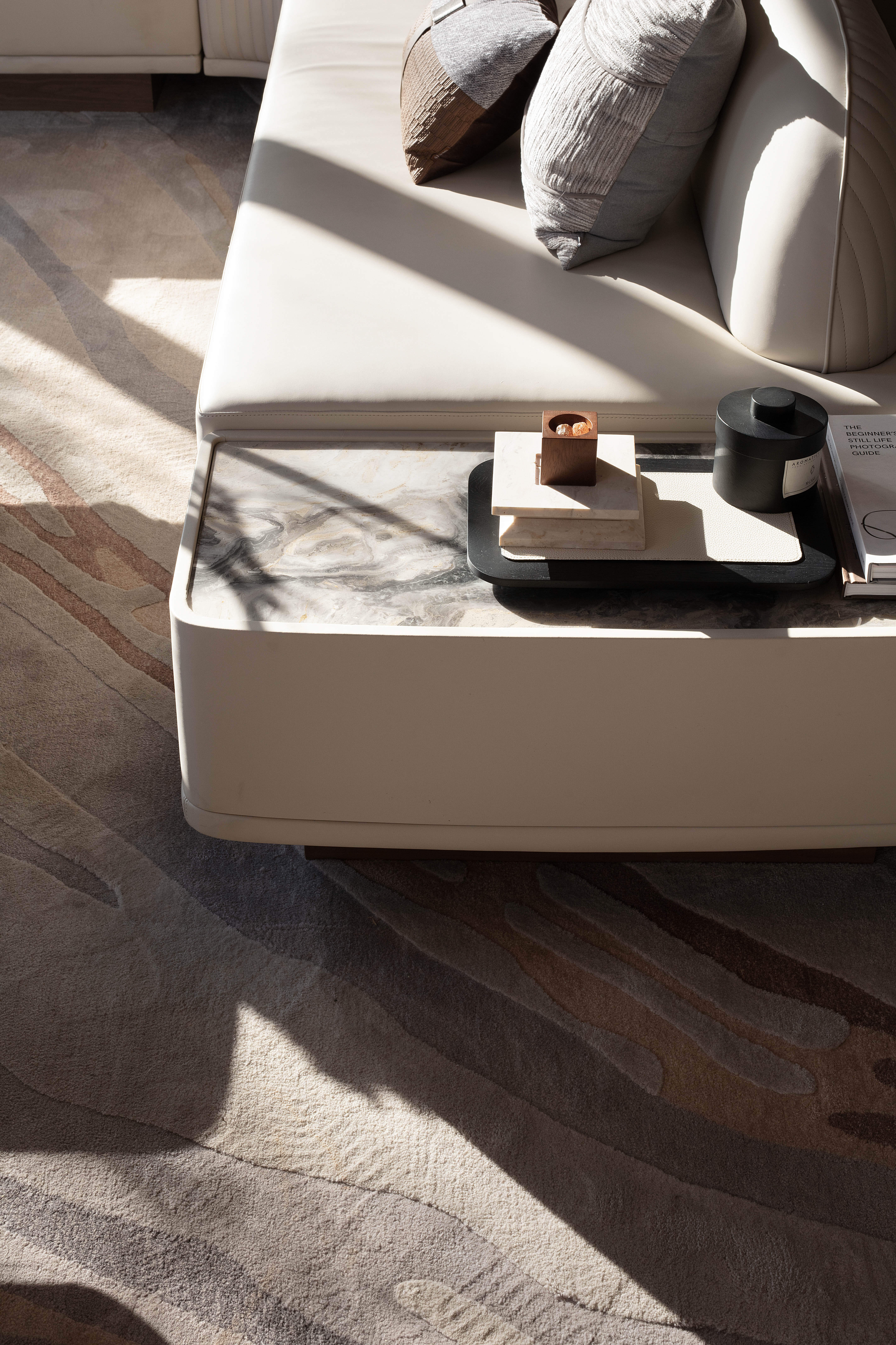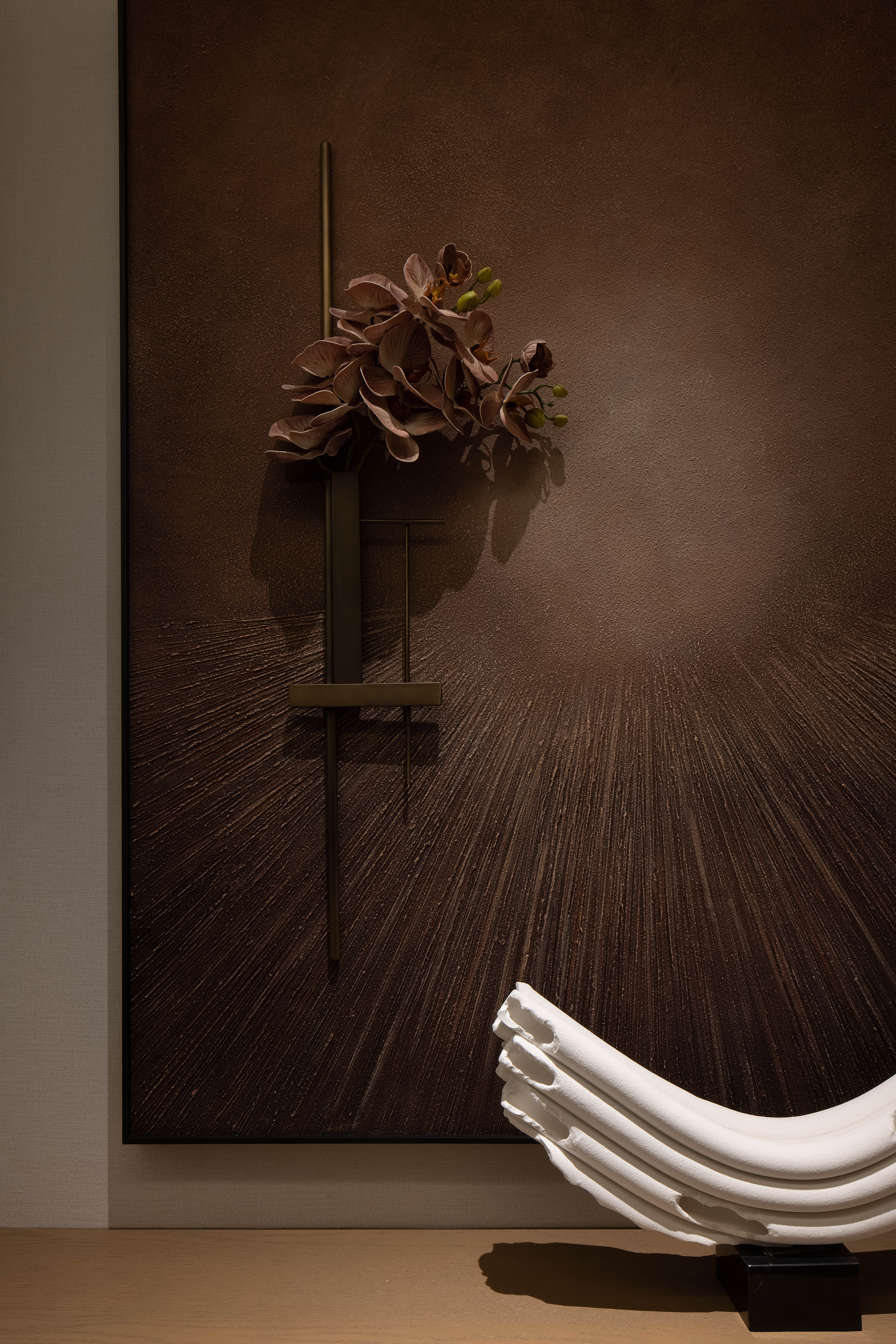空间意境:走廊墙壁以扁舟形式,引人沉浸式步步递进,走向“城市群像”艺术装置。艺术为城市前行注入动力,不断向前求索,美学与文化的传承将生生不息。在需求越来越多样化的当下,营销中心不仅作为销售社交属性,更是一座生活体验馆。沙盘区域,设计师将视角放在空间整体协调度上,顶部层次感灯光与底部石材的堆叠互相呼应,构成统一秩序。开放式洽谈区不仅强调功能性、结构和形式的完整,设置不同组合式桌椅,满足多种形式的接待交流。并且追求材料及空间的表现深度与精确,运用最少的设计语言,表达出最深的设计内涵。我们经由颜色,感知人与自然的奇妙链接。融合自然色谱的丹桂色桌椅,天生富有厚度,赋予内心平静的疗愈力。东方墨色边桌,含蓄简约,将儒雅美学发挥到极致。