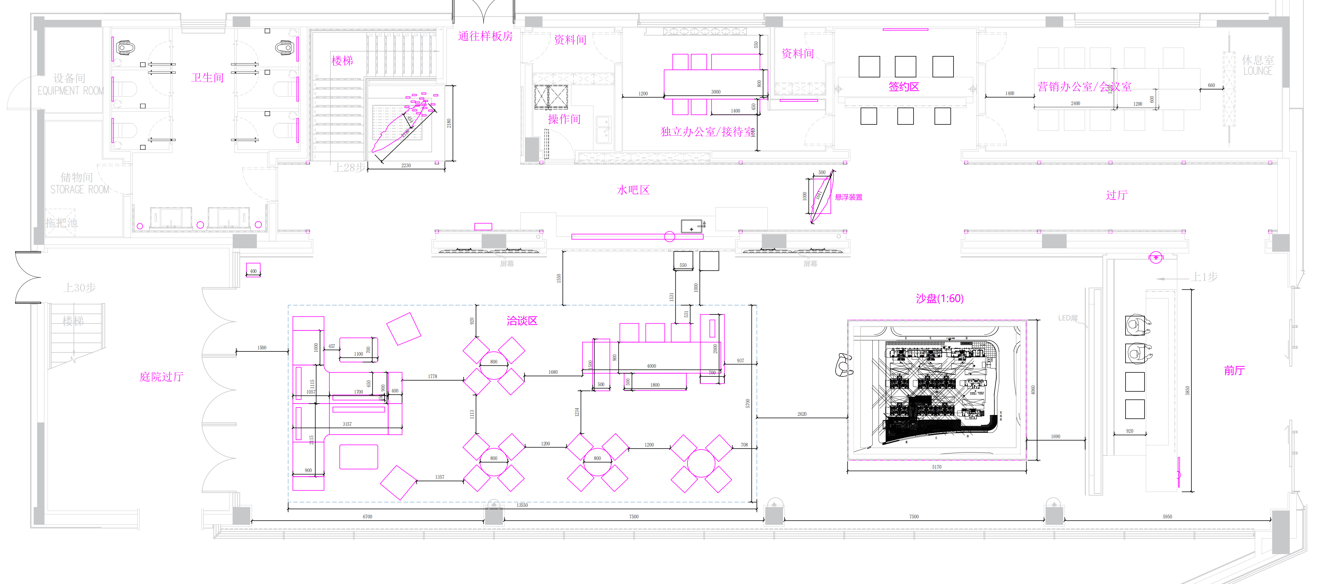 空间布局:不利用墙面区隔不同空间,所有功能都呈现在眼前,空间利用最大化,满足售楼处多重属性。