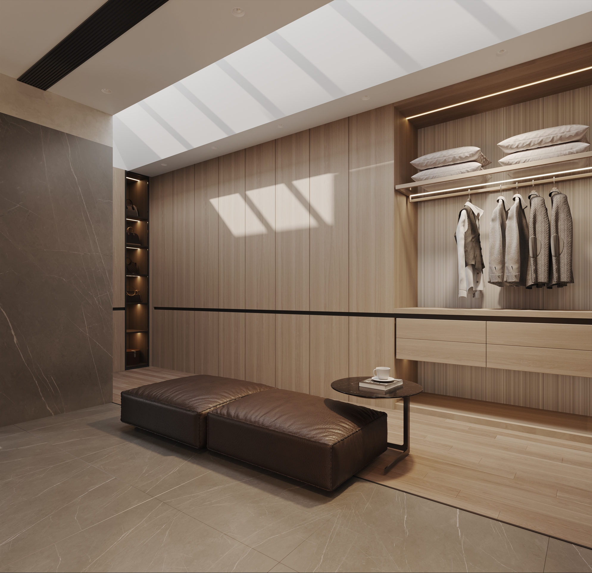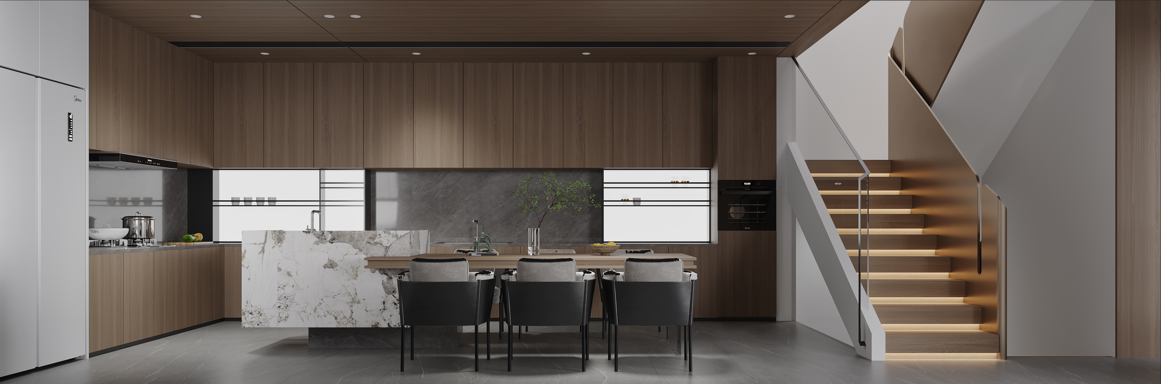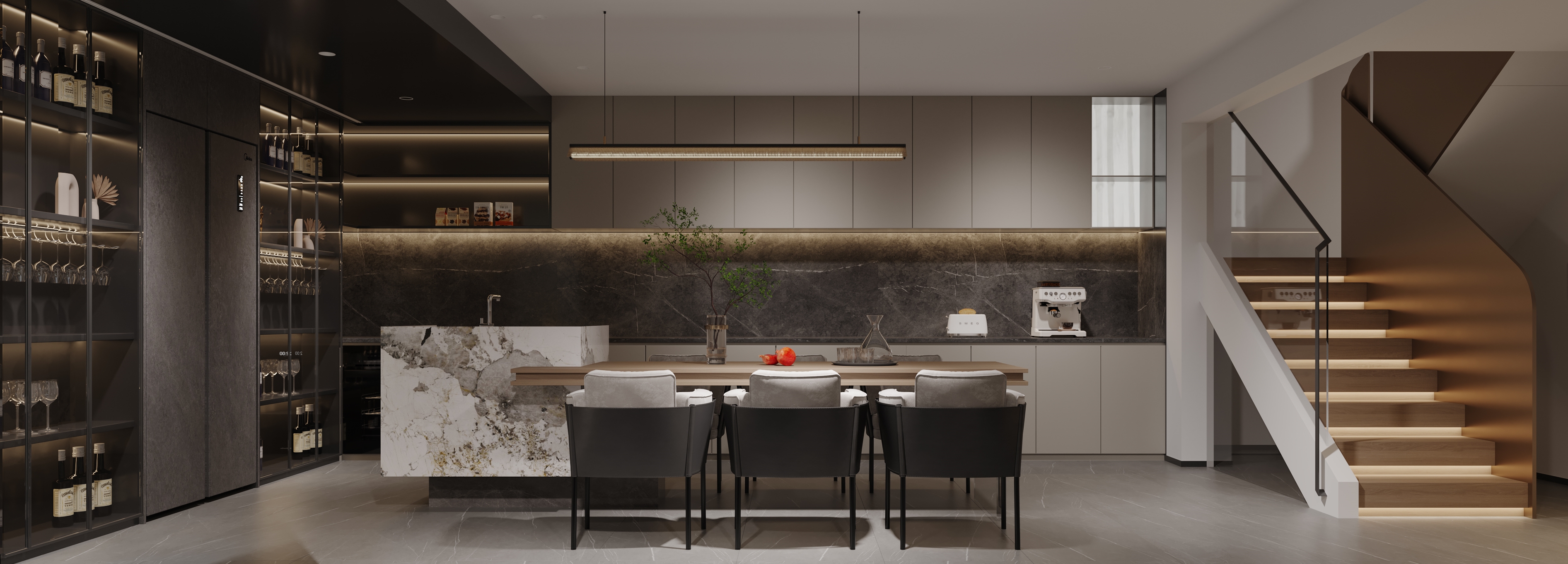设计选材:以岩板、木饰面为主,让空间干净利落,但是不堆砌,点到位置,改留白的地方留白。