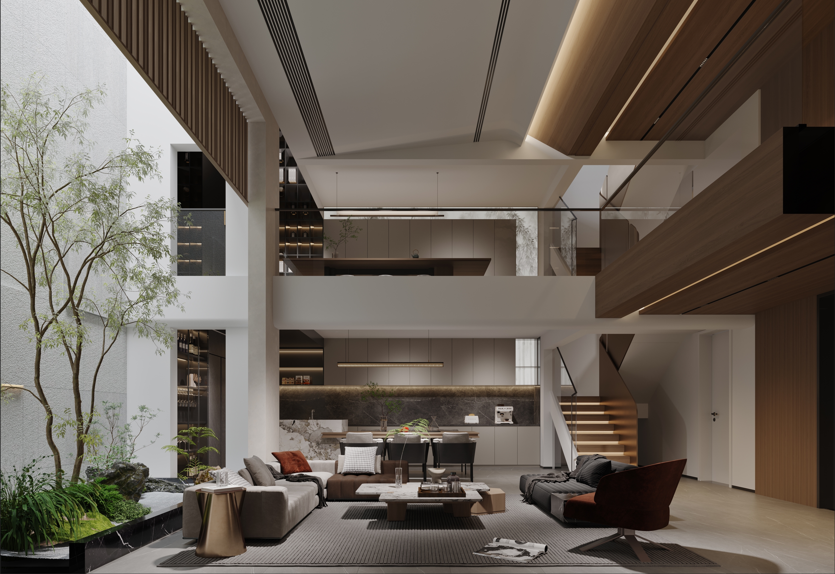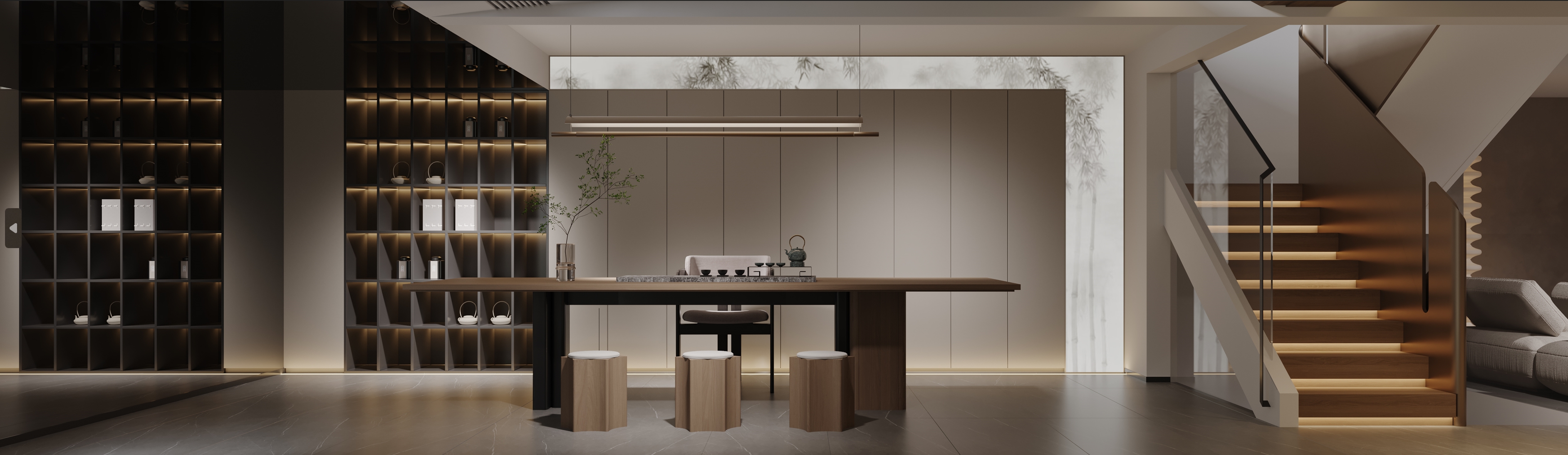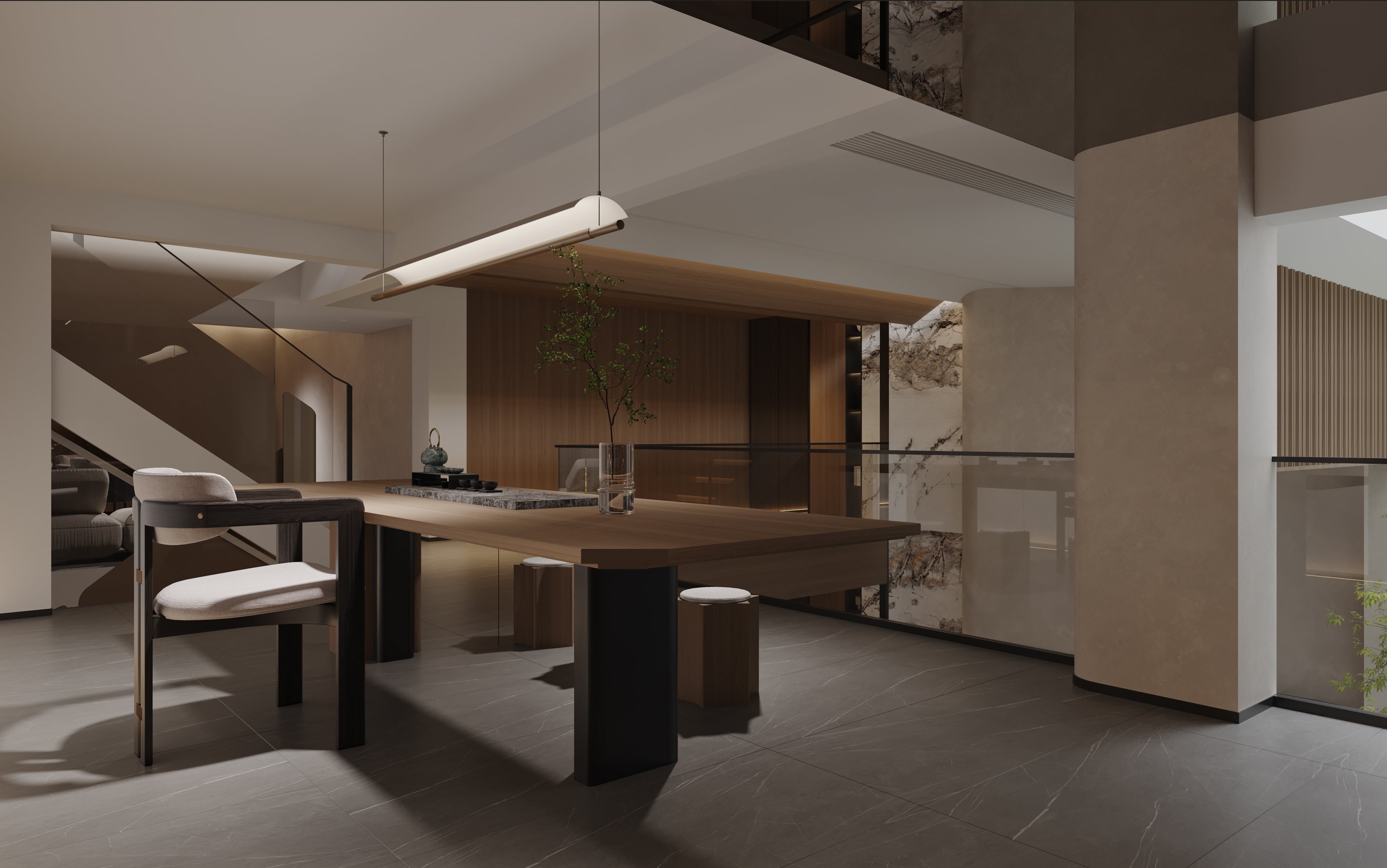 空间意境:空间在现代商务感的基础上,结合一些中式的元素和手法,进行一些结合和写意的创作。