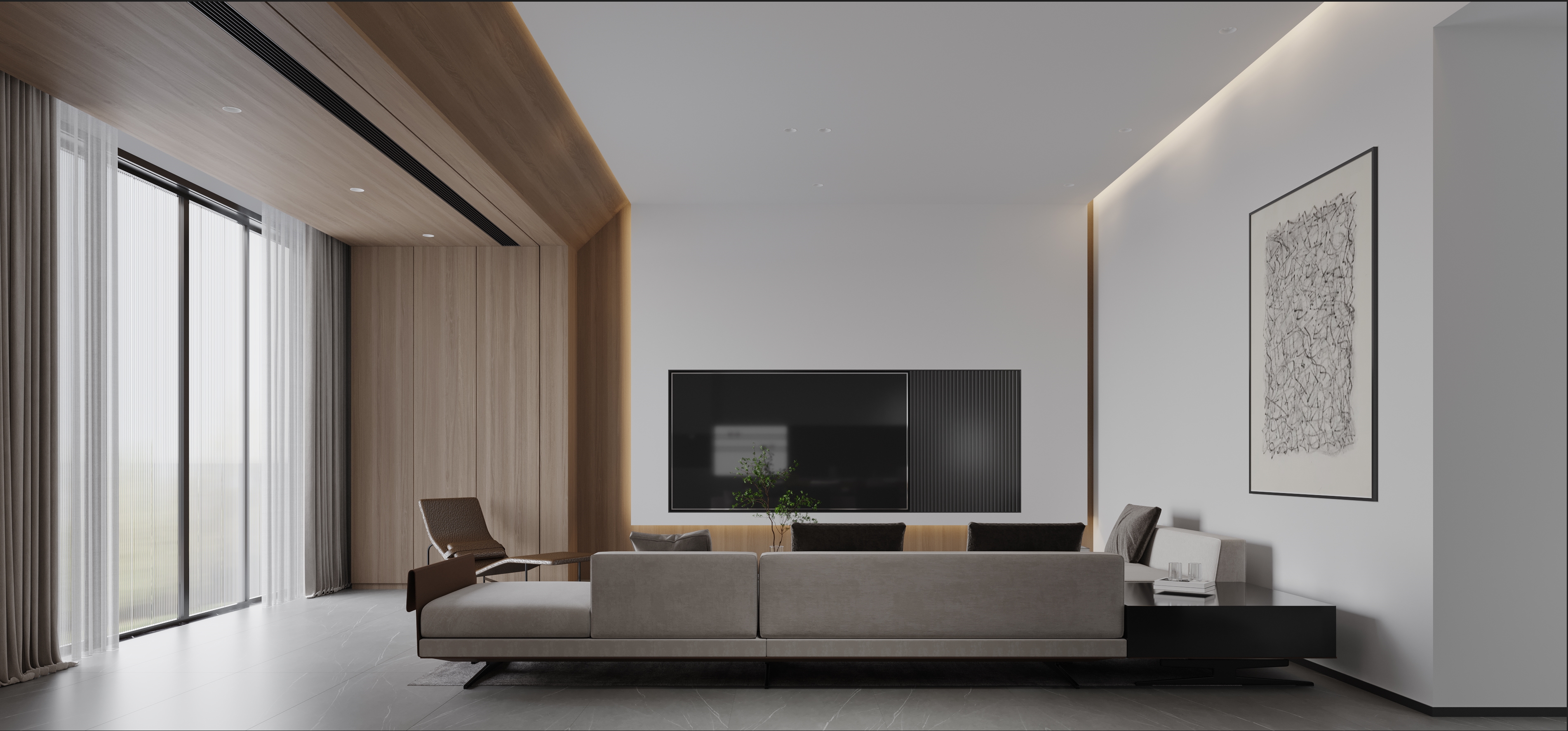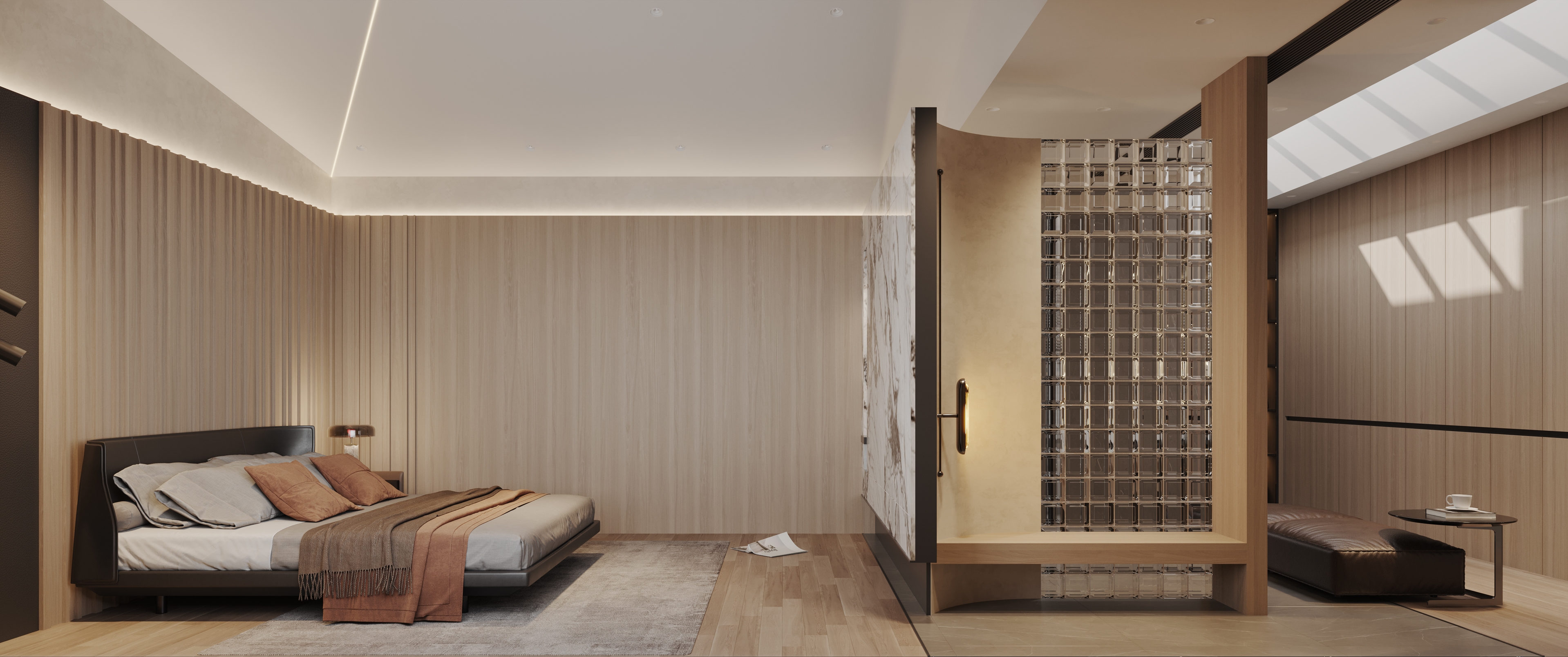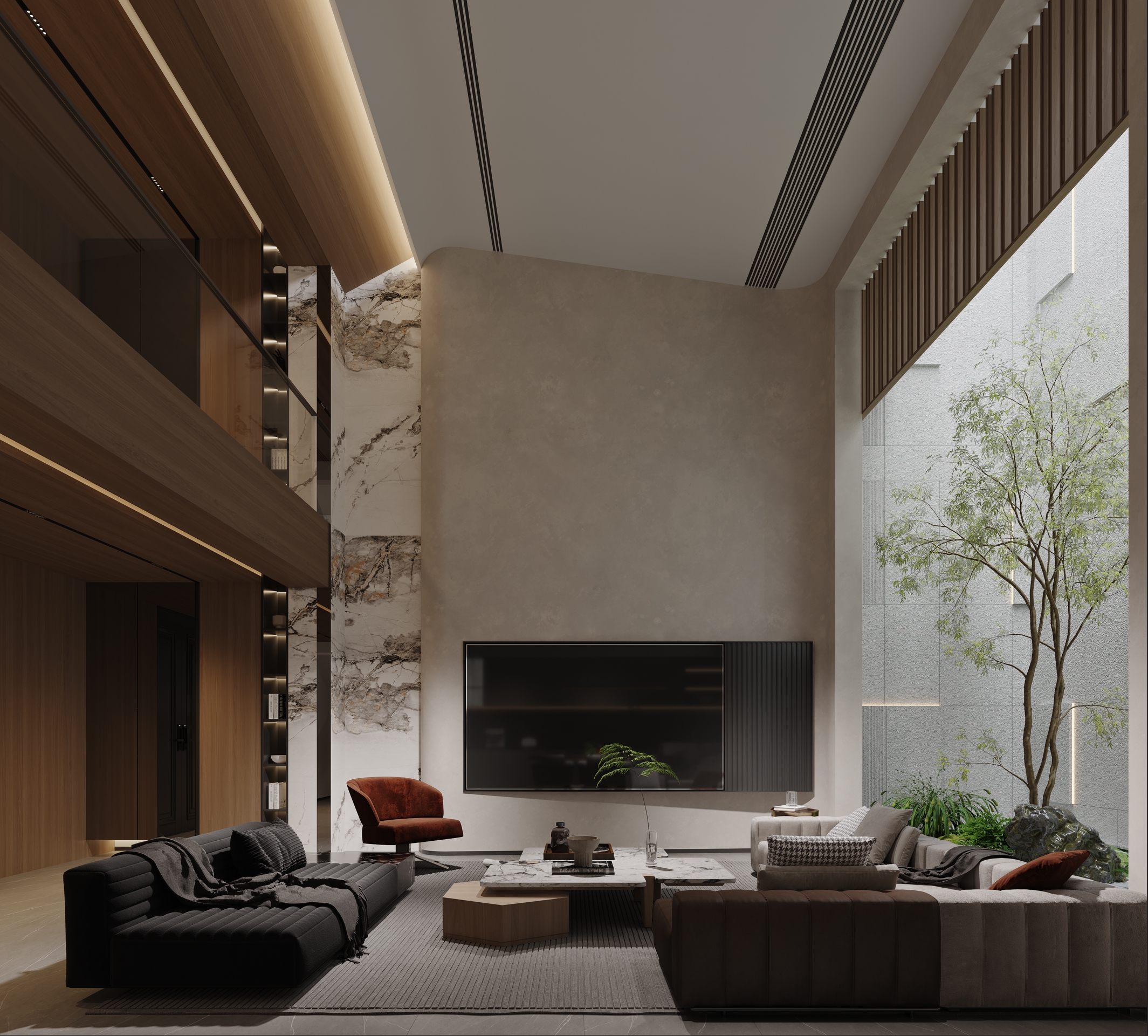 空间意境:空间在现代商务感的基础上,结合一些中式的元素和手法,进行一些结合和写意的创作。