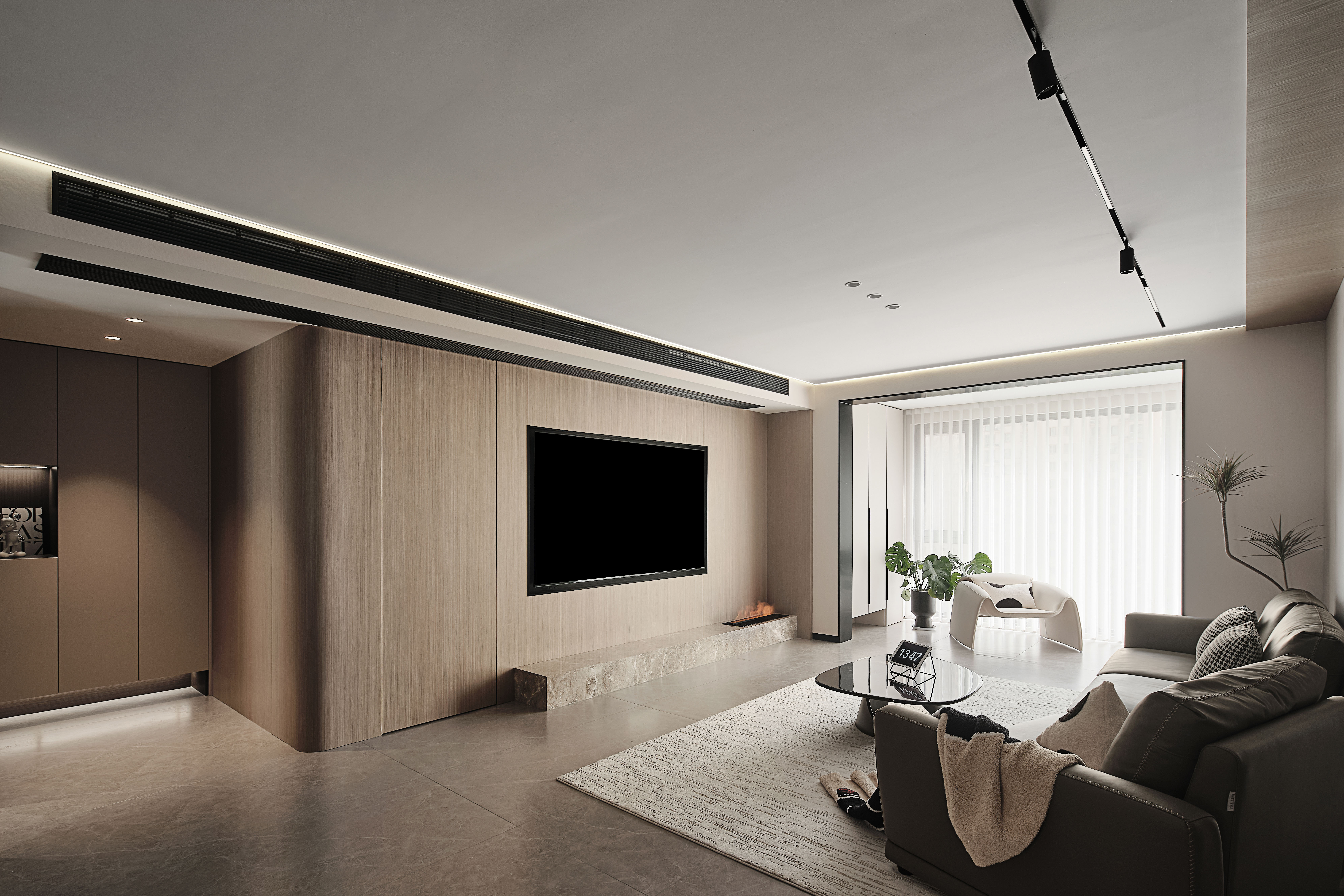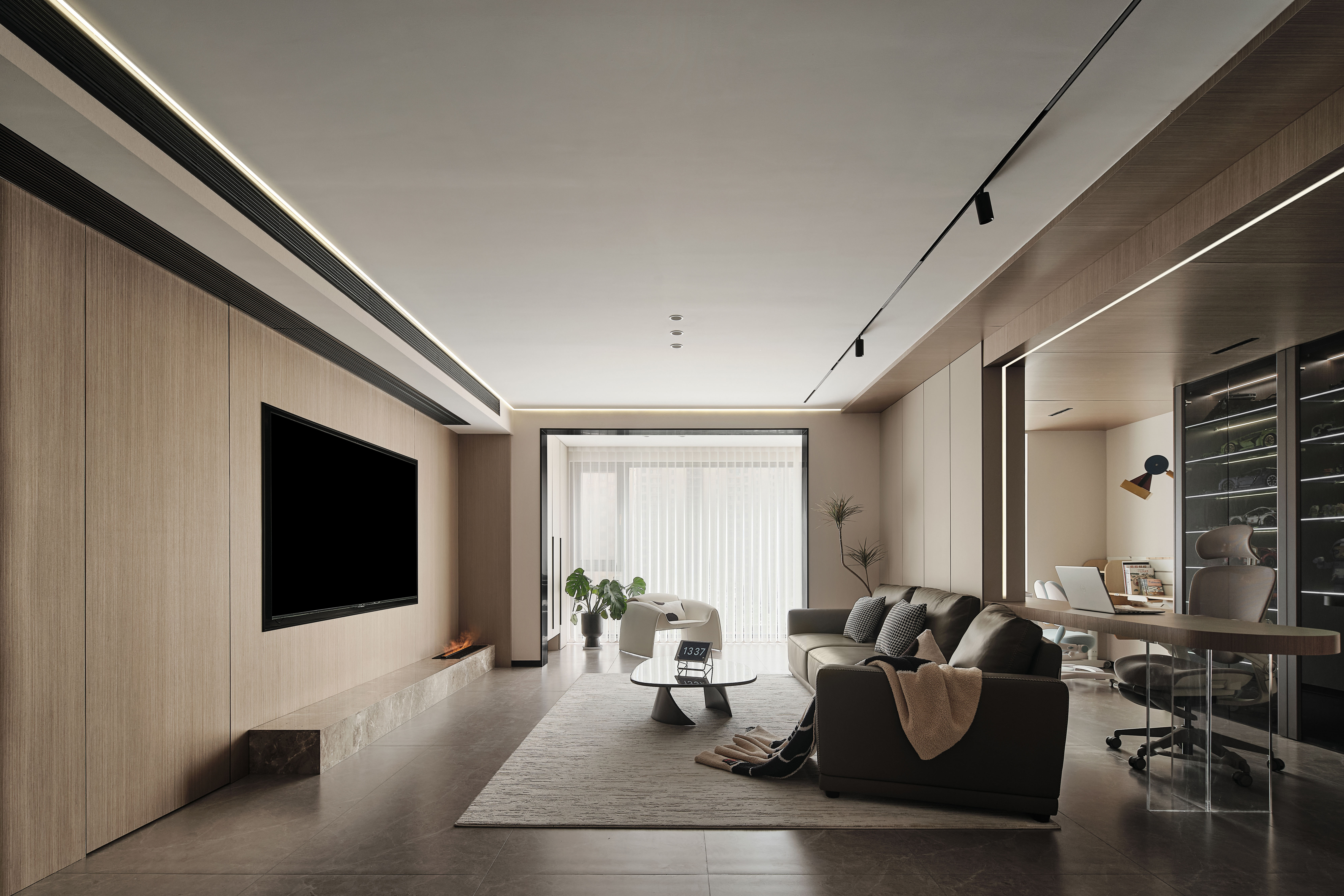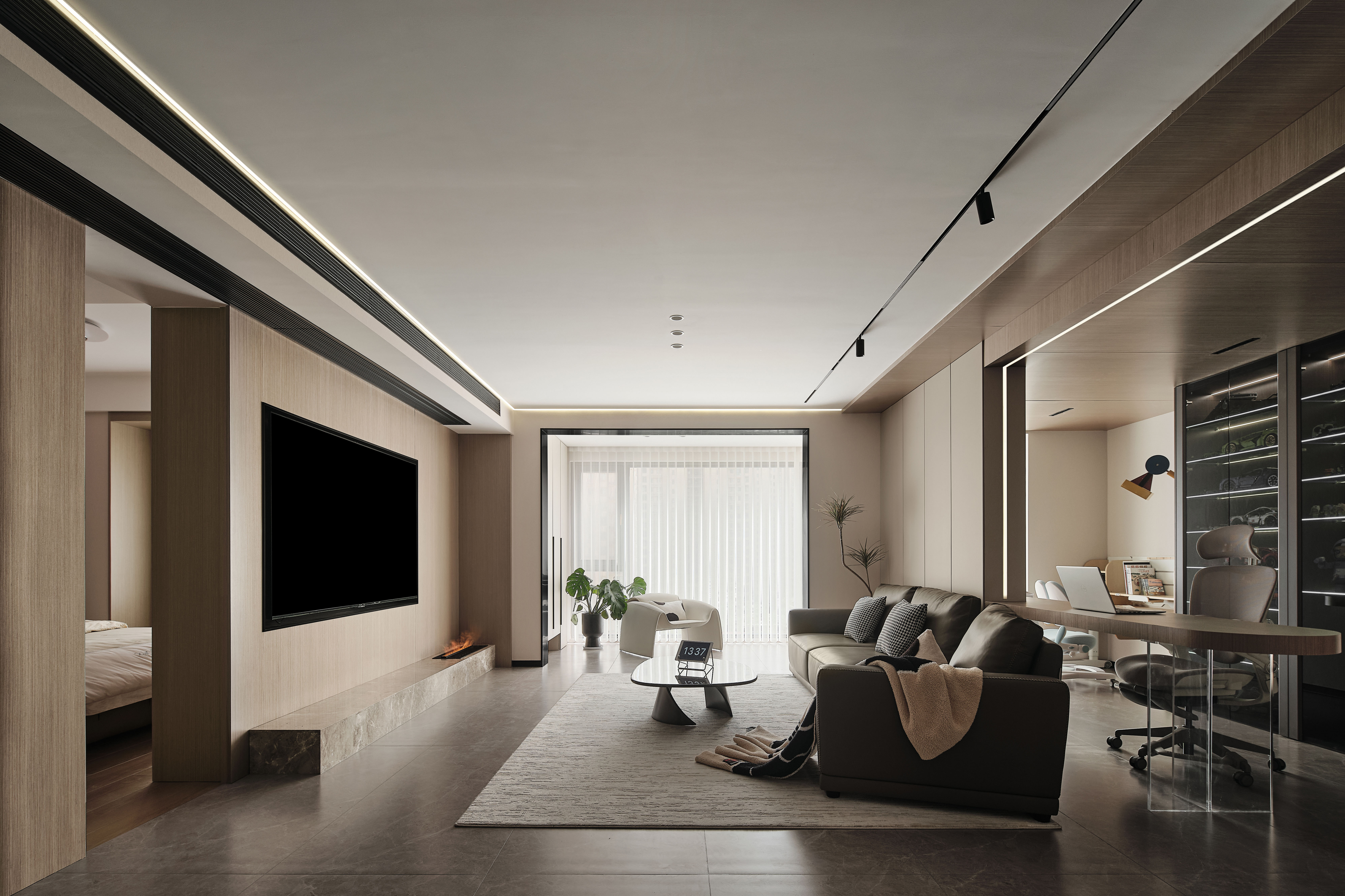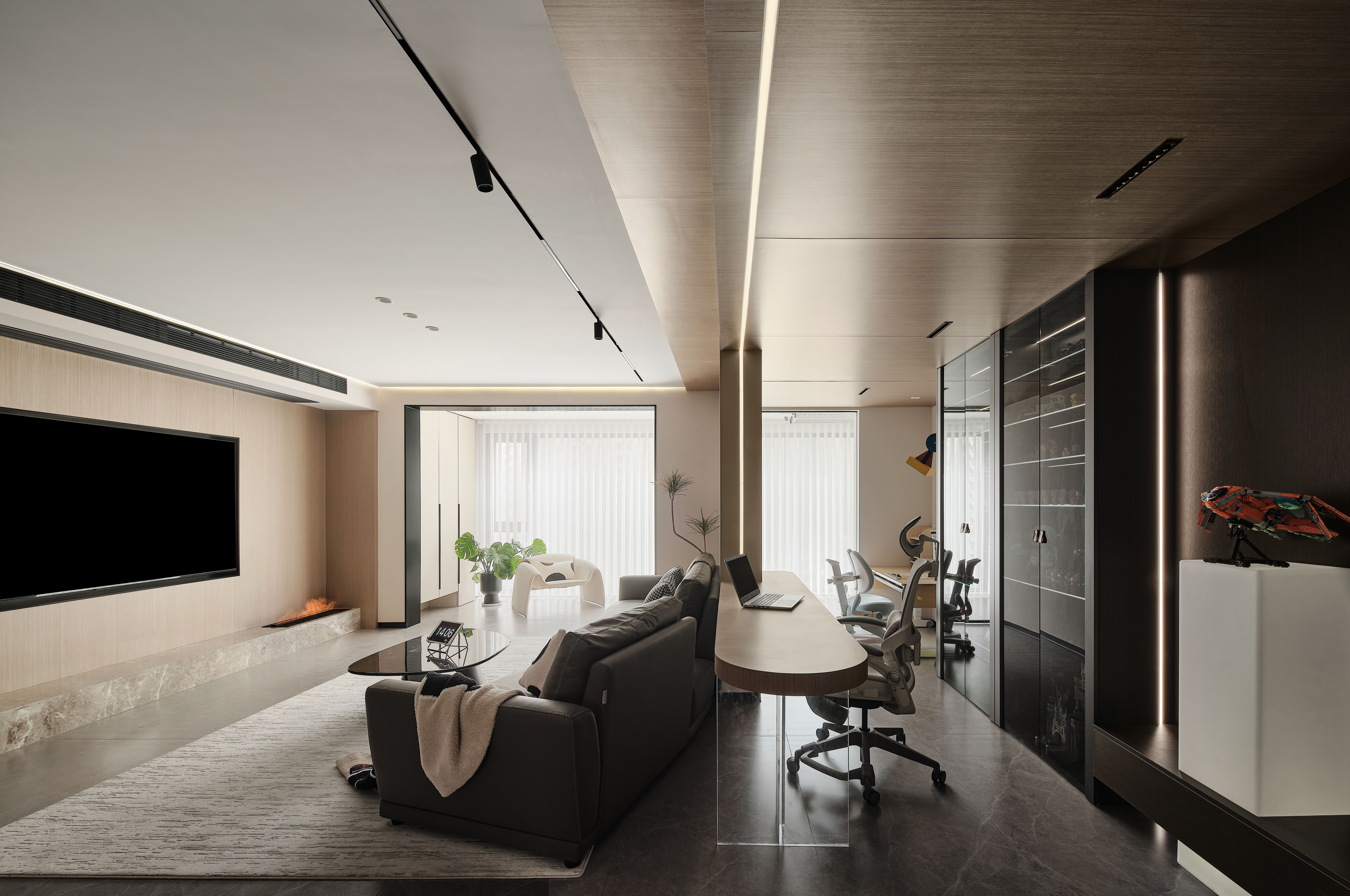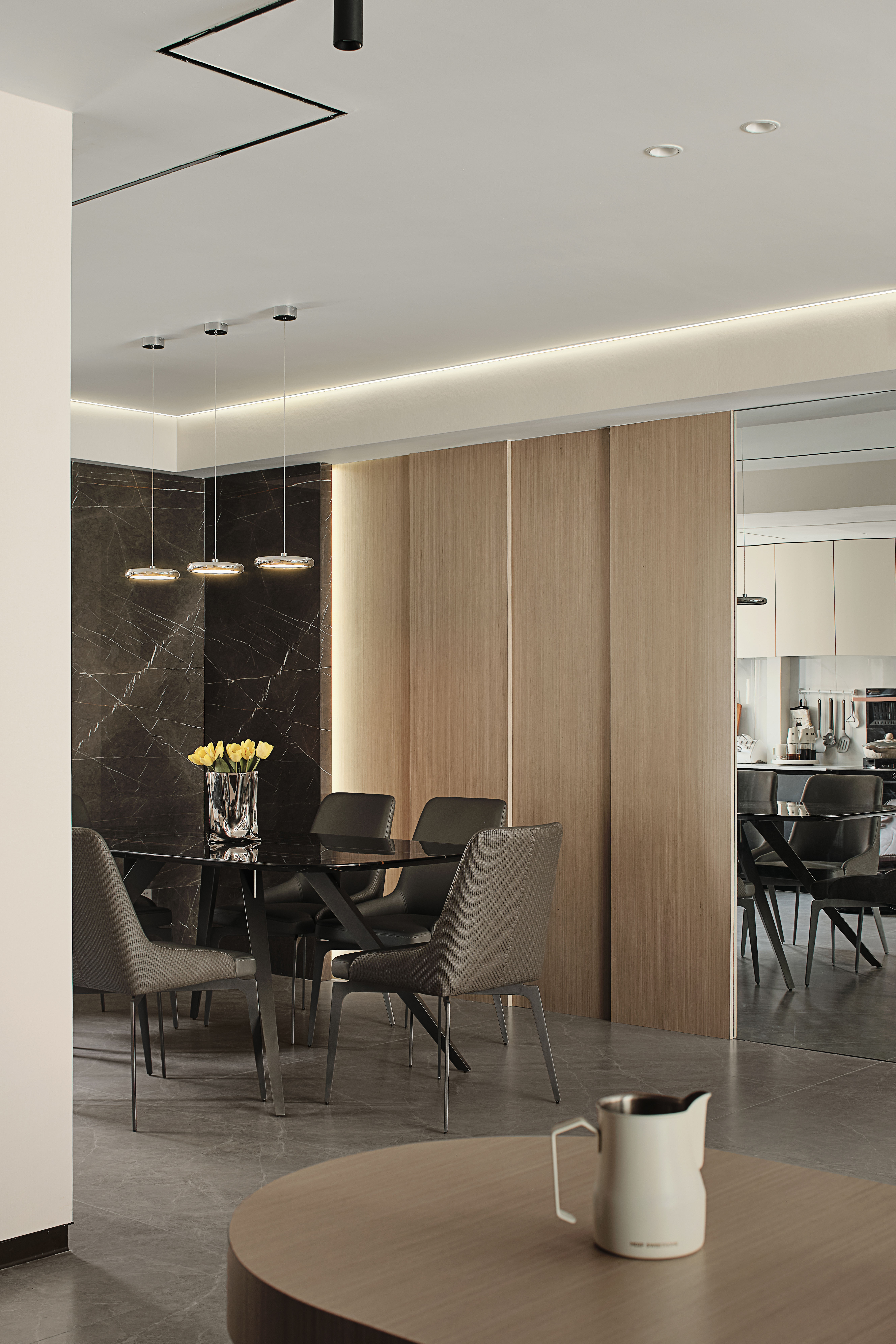 本案设计将客餐厅分别连接主脉络两端,南北窗相互穿透,自由游走于宽阔的空间场景,围合出情感聚集的能量,促进家人之间交流与互动。开放式餐厨搭建自由连贯的交流场景烹饪,就餐,闲聚,为空间赋予无限生动的变量,跟随日常形态切换动态电影,共创生活风云。