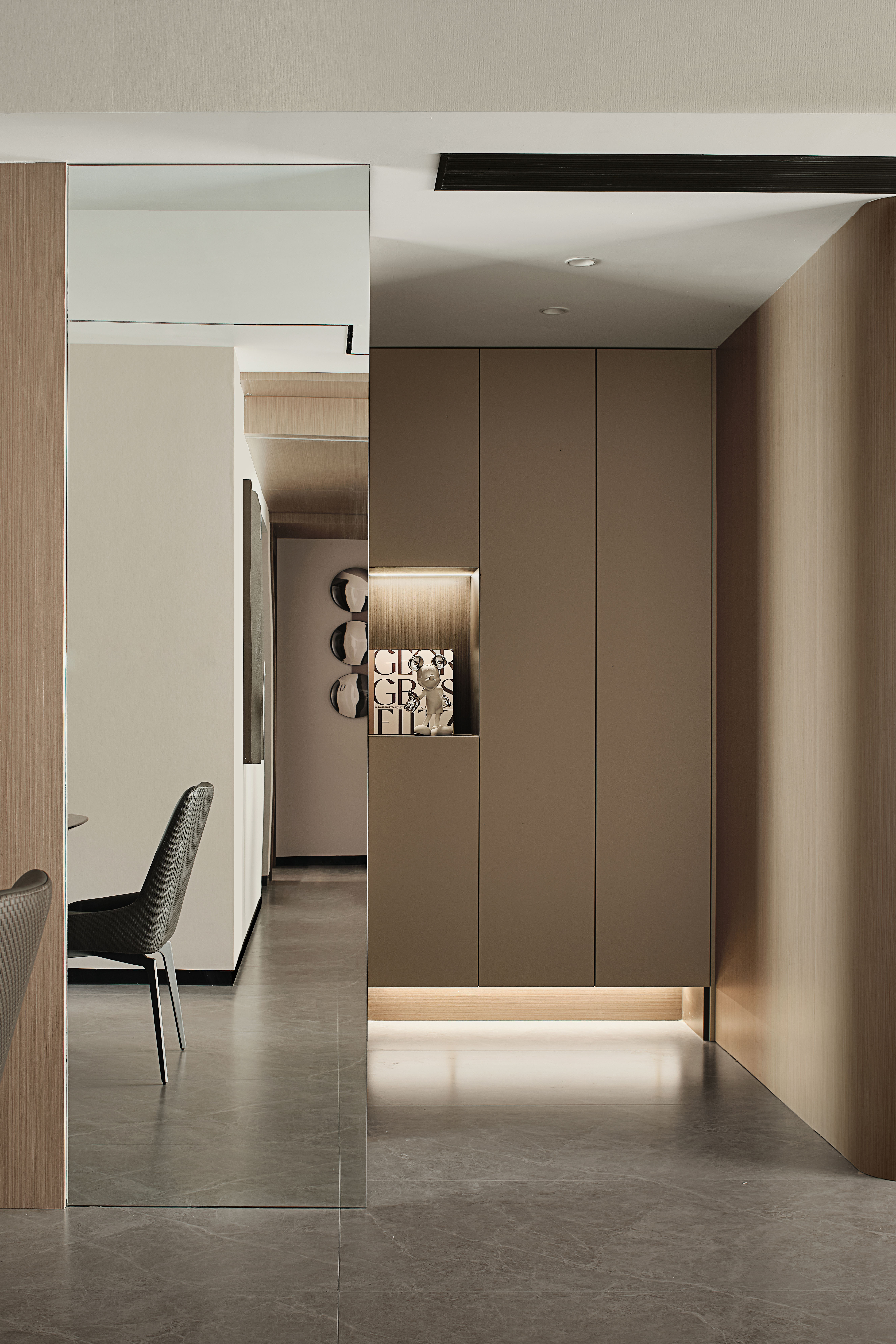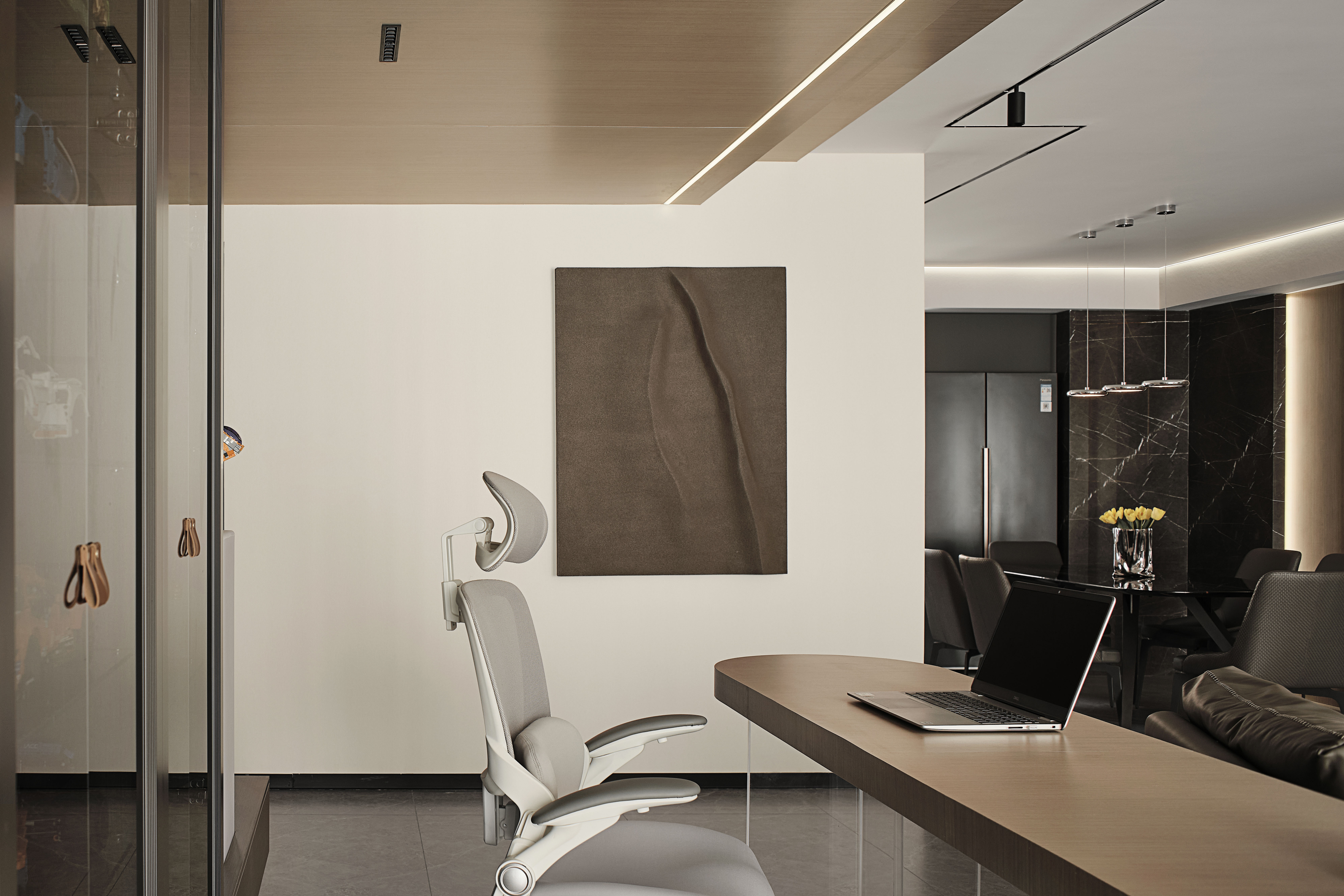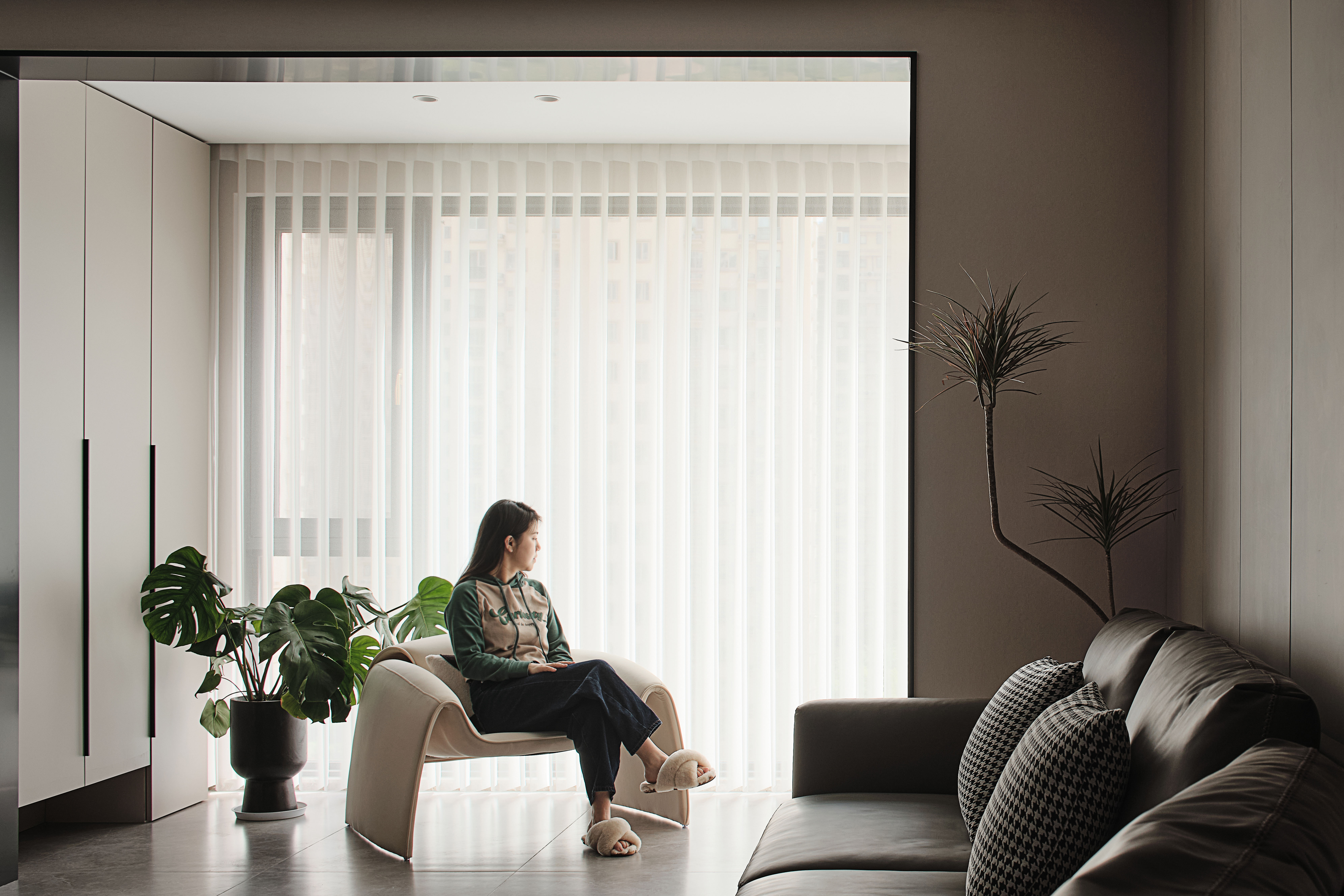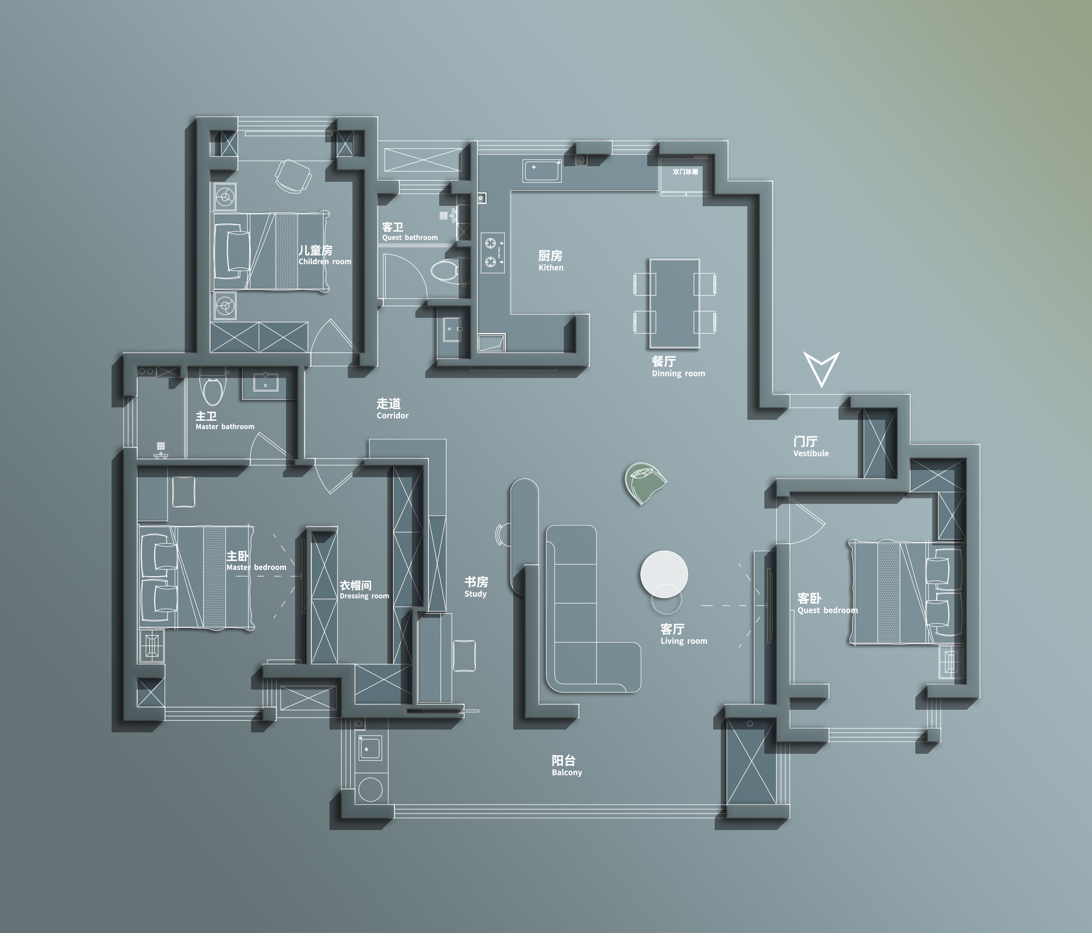 本案设计将客餐厅分别连接主脉络两端,南北窗相互穿透,自由游走于宽阔的空间场景,围合出情感聚集的能量,促进家人之间交流与互动。开放式餐厨搭建自由连贯的交流场景烹饪,就餐,闲聚,为空间赋予无限生动的变量,跟随日常形态切换动态电影,共创生活风云。