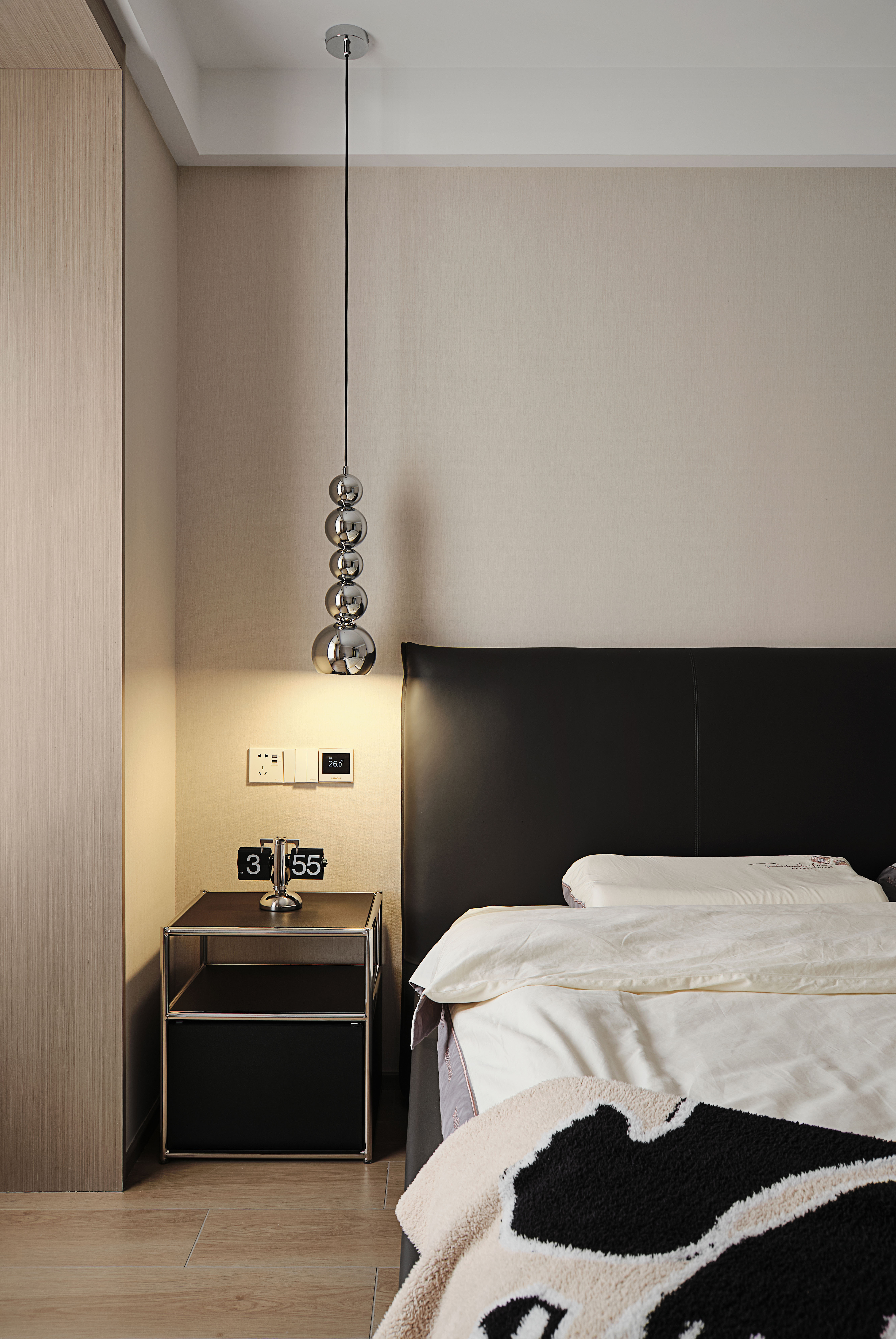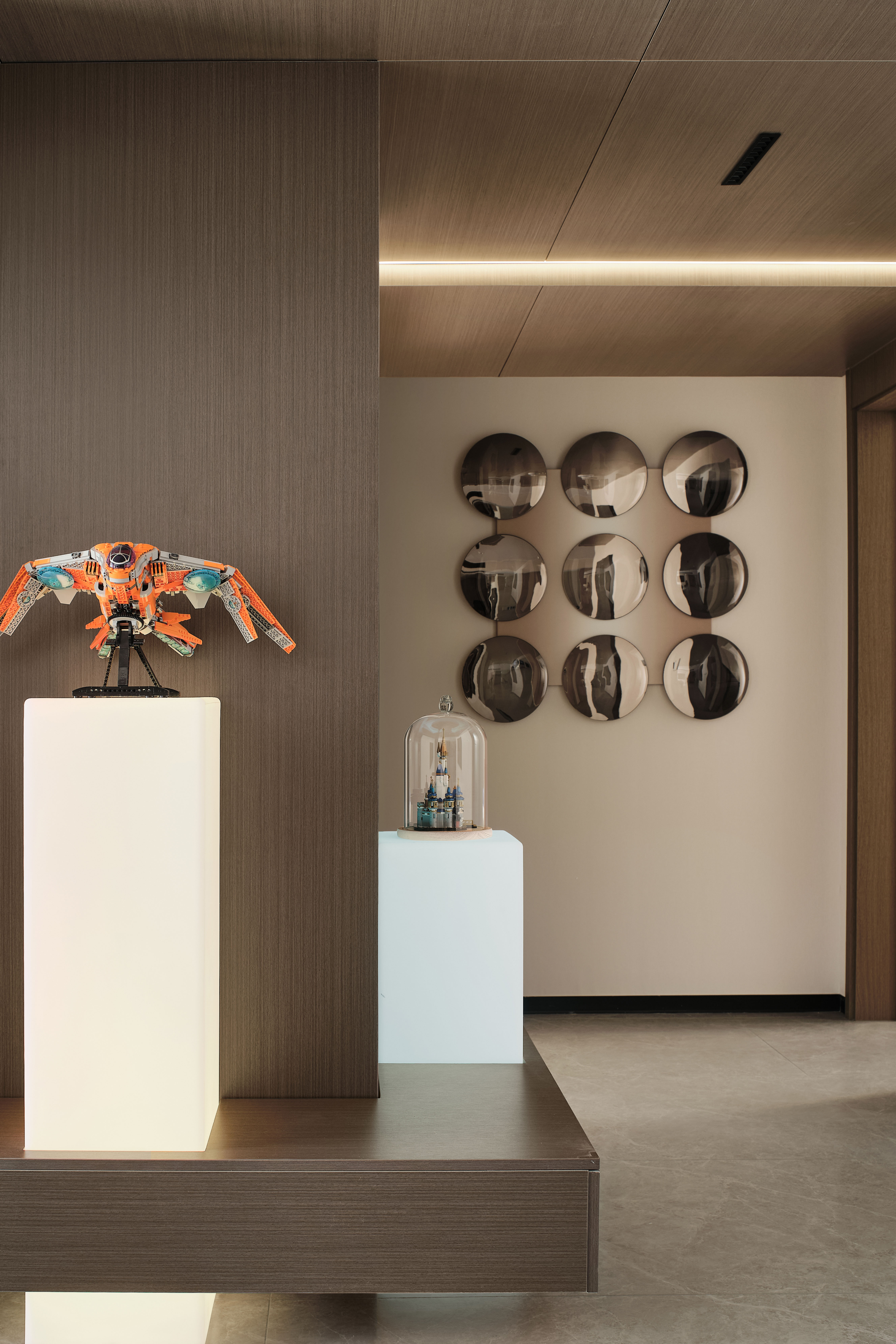 空间整体配色选择了非常低调的中性色彩,饱和度相对较低,呈现出的主色调都是自然而温和的,软装上则展现出主人童真的一面,不同颜色的乐高顿时给空间注入了轻快,明媚的活力与生气。
