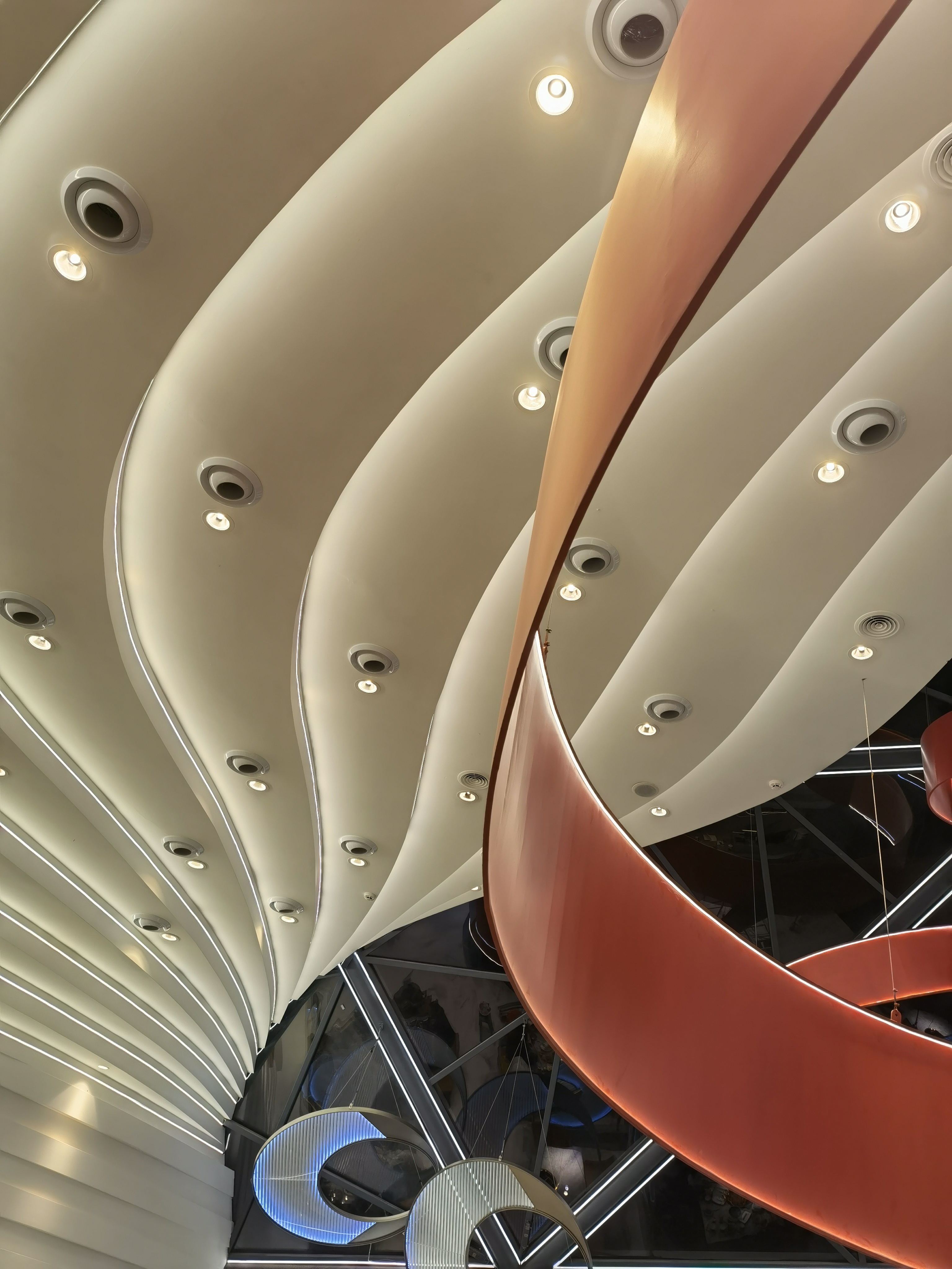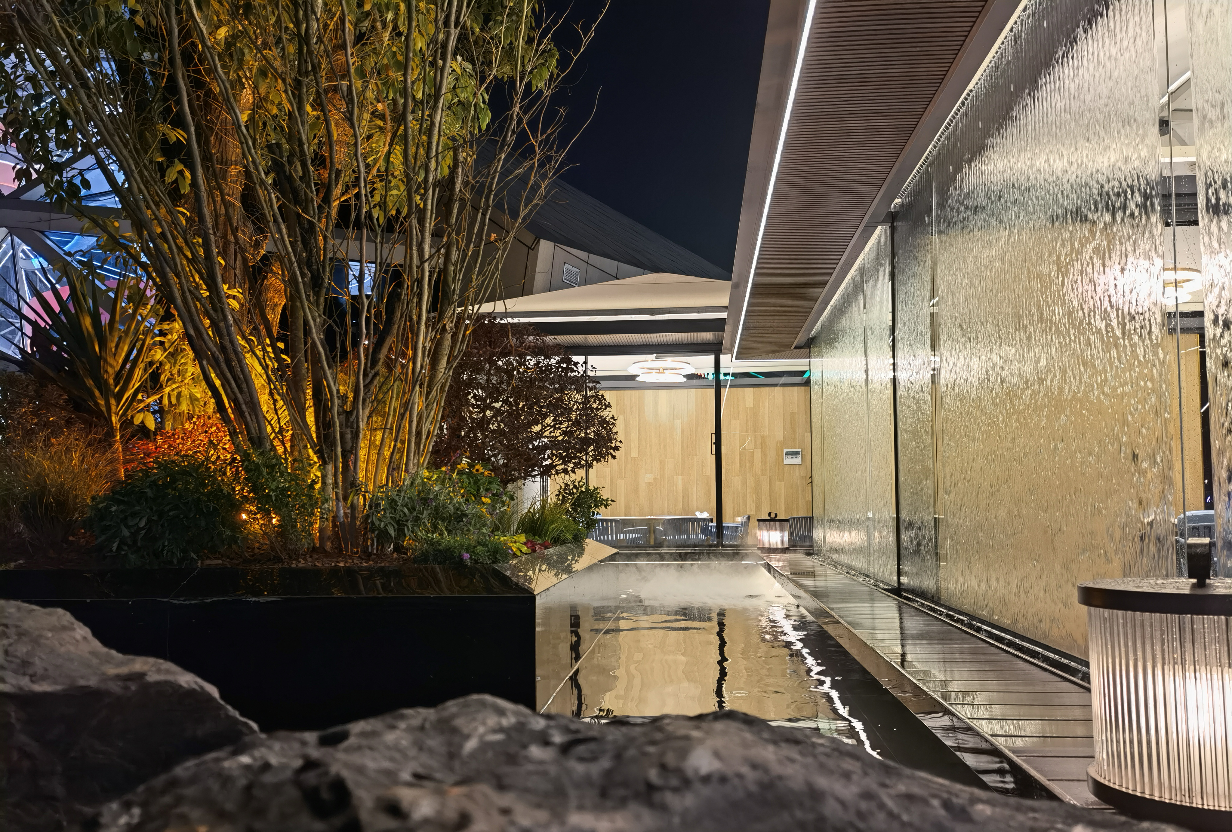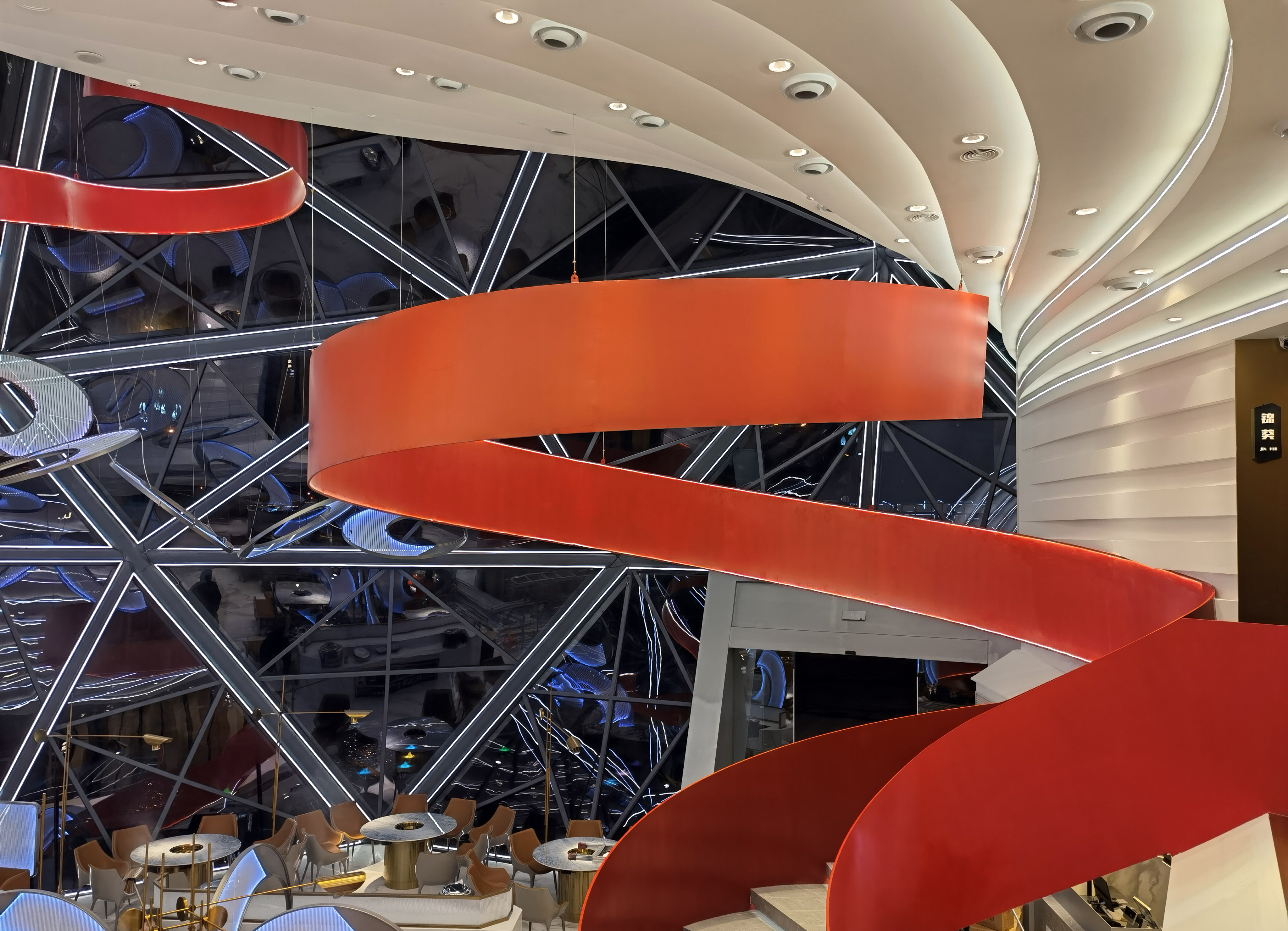 利用原有建筑的特殊性,通过多层次弧形结构来结合,用多个花瓣隔断作为空间辅助,让这个异形空间独特而极具魅力,主体空间制造热闹而炫酷的气氛,充分吸引消费者眼球,后场的水上花园包间则充分利用自然环境,自由而自在。整体动线明细,动静相宜。