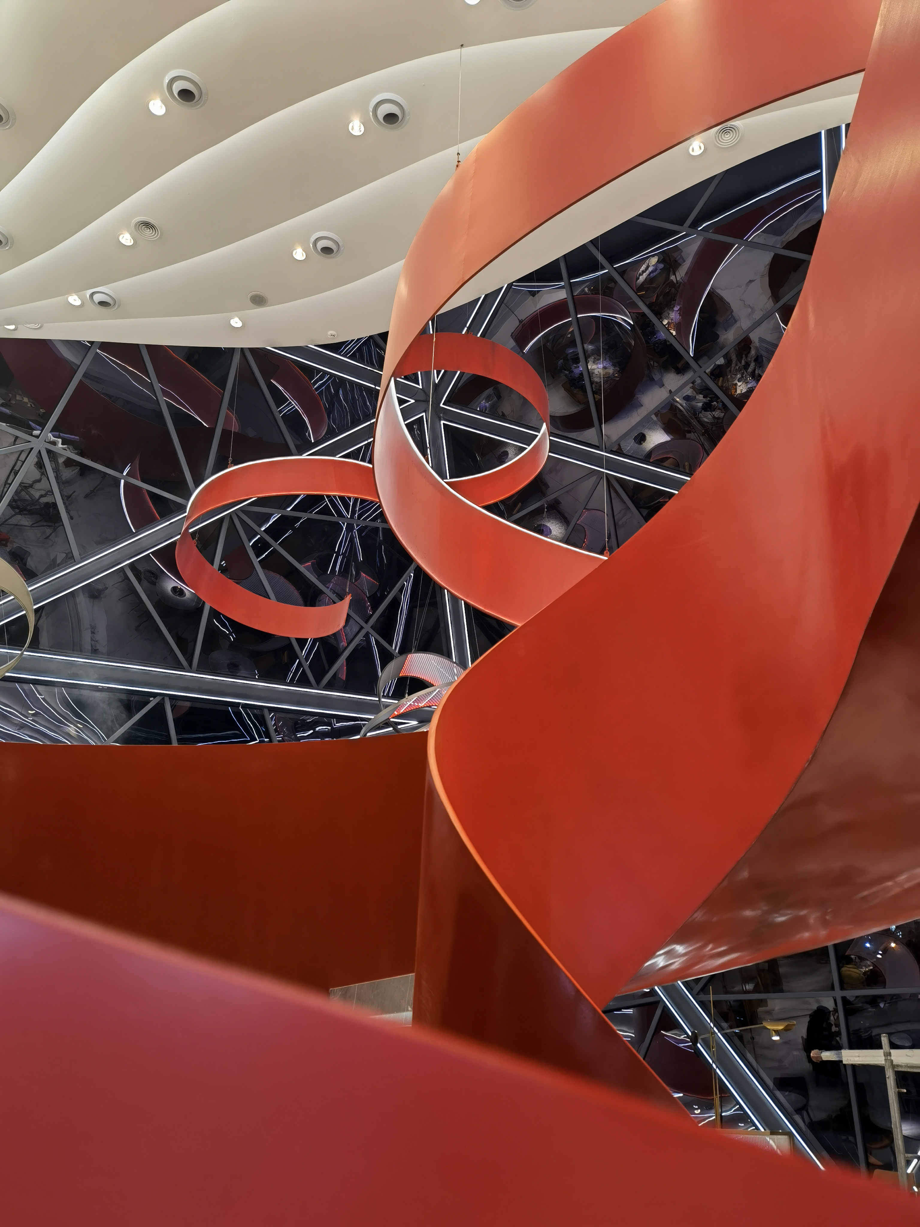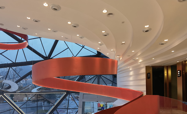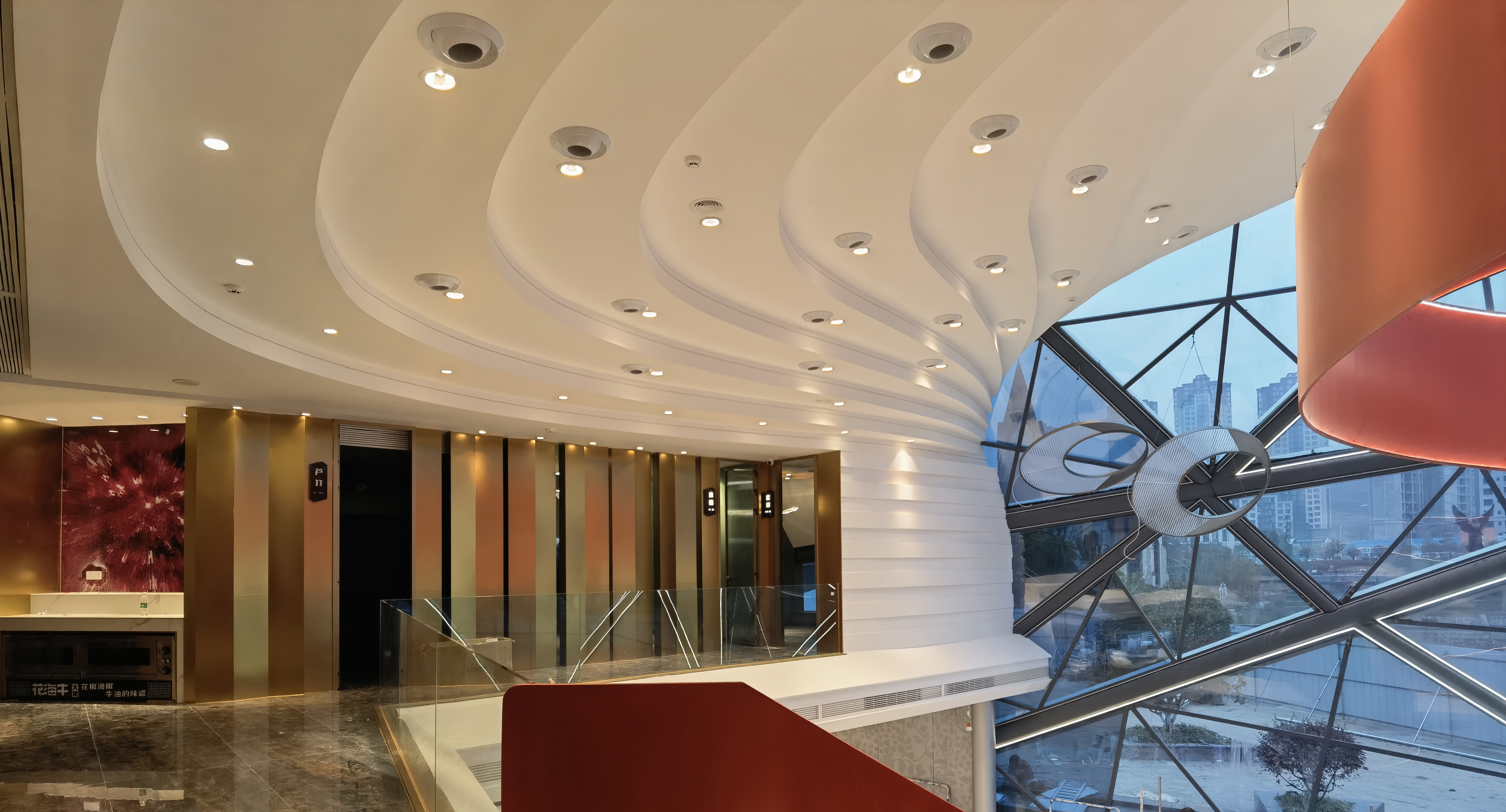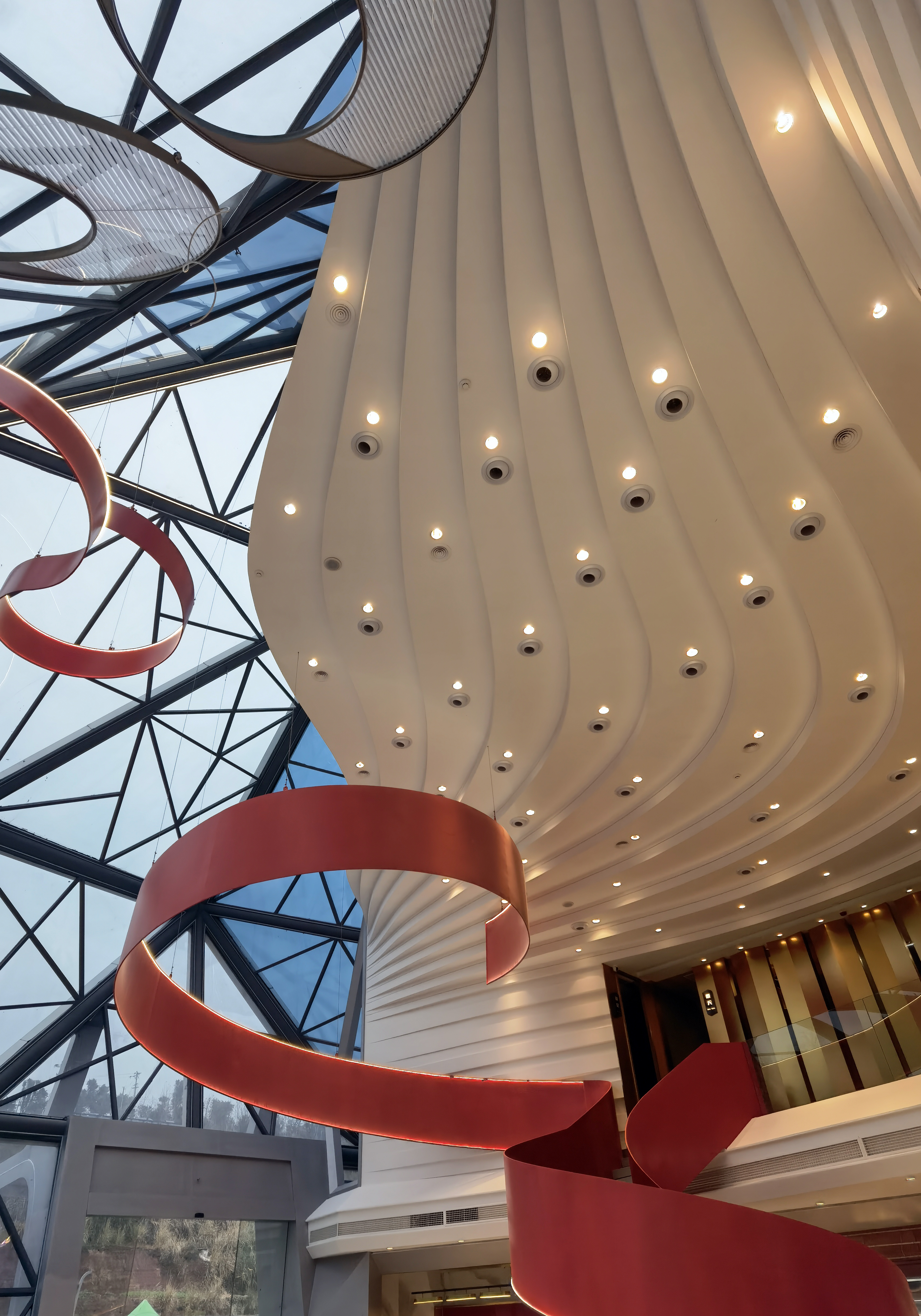 利用原有建筑的特殊性,通过多层次弧形结构来结合,用多个花瓣隔断作为空间辅助,让这个异形空间独特而极具魅力,主体空间制造热闹而炫酷的气氛,充分吸引消费者眼球,后场的水上花园包间则充分利用自然环境,自由而自在。整体动线明细,动静相宜。