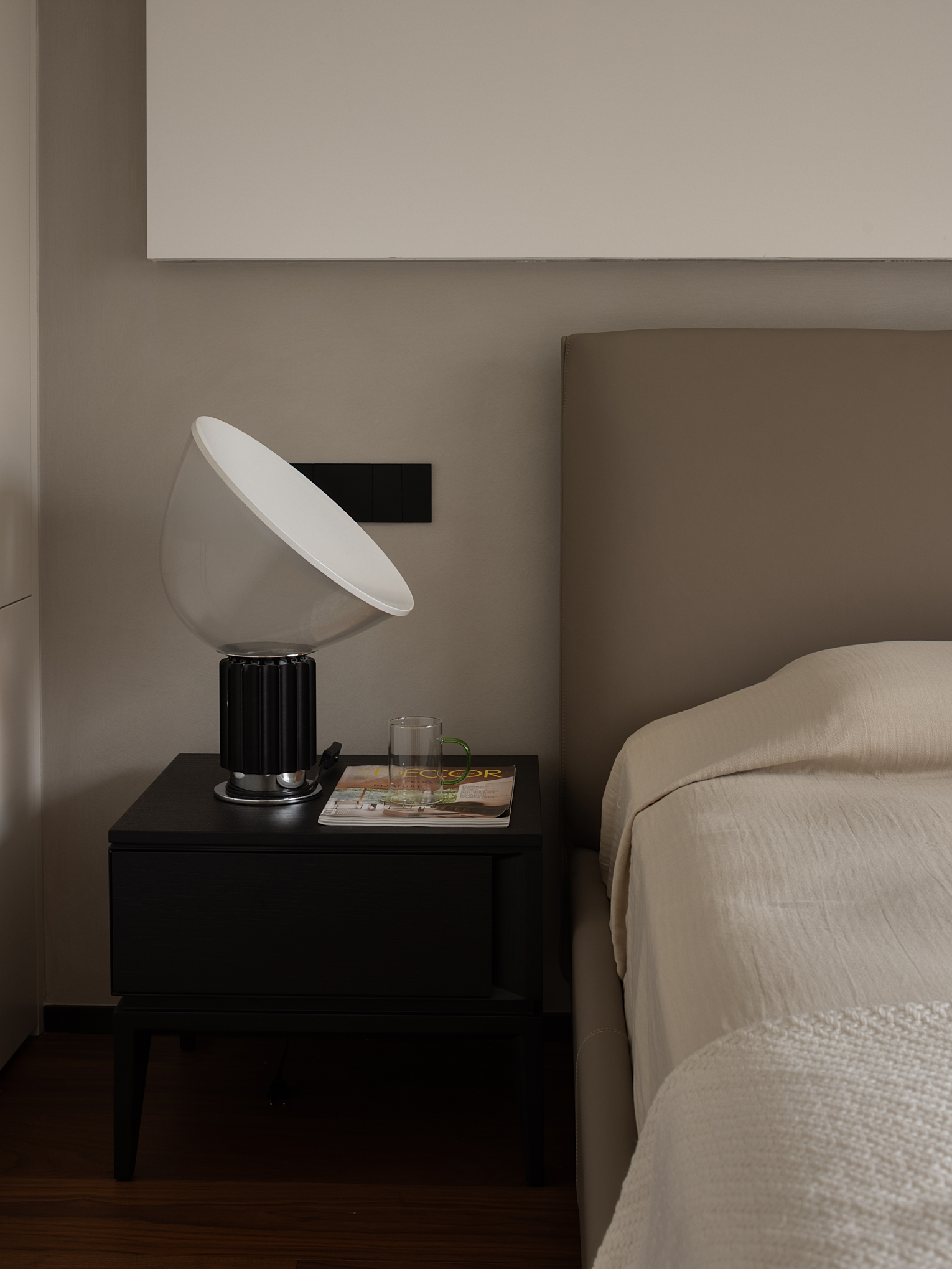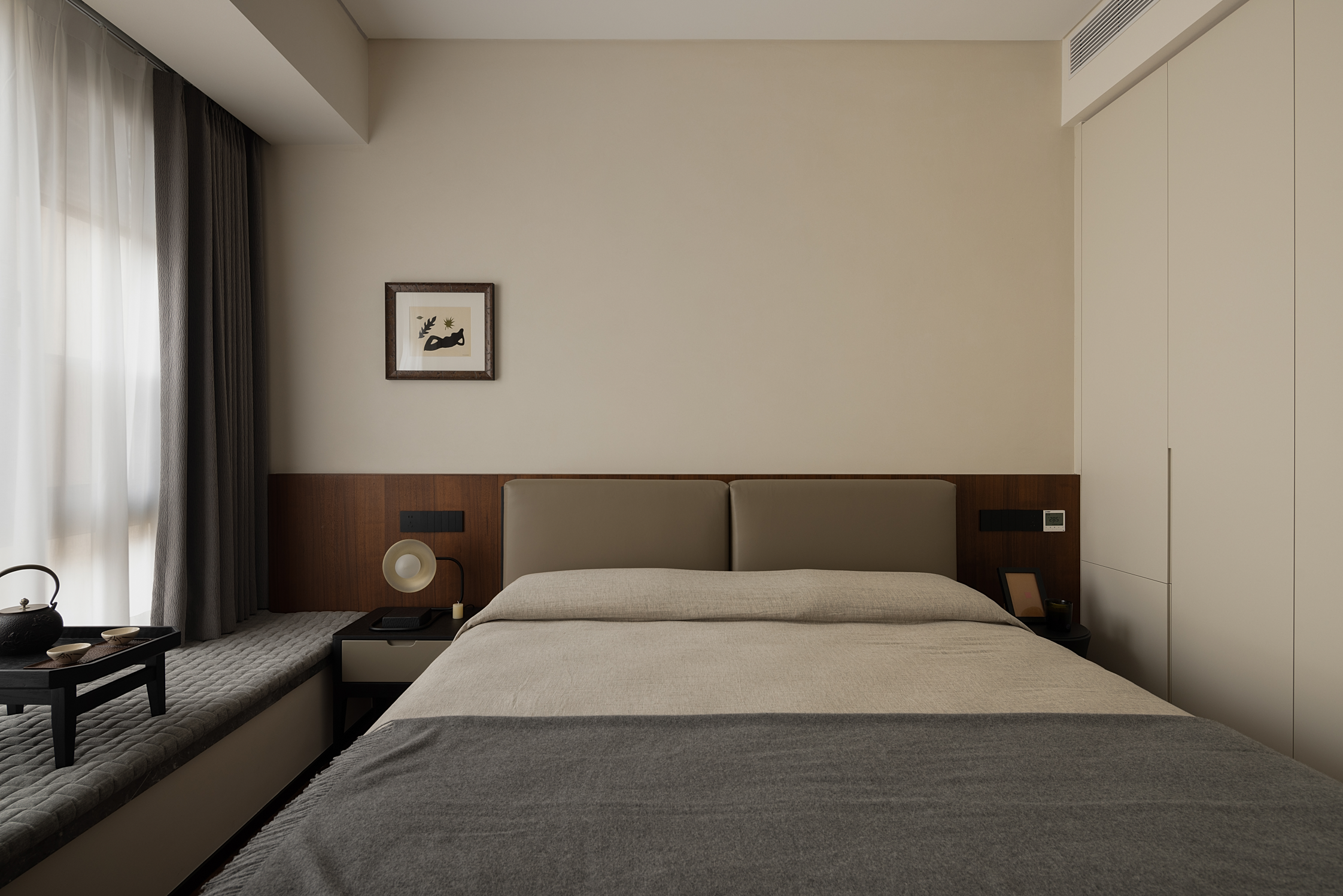 主卧空间,选择了温暖的大地色系,米白、浅棕...营造出宁静的氛围,增强空间温馨感。围合式大玻璃窗引光入室,将卧室映照的通透明亮,清晨的第一缕阳光透过纱帘,轻抚每一寸空间:地板、床品、桌上的油画,轻轻地唤醒沉睡的梦想。
