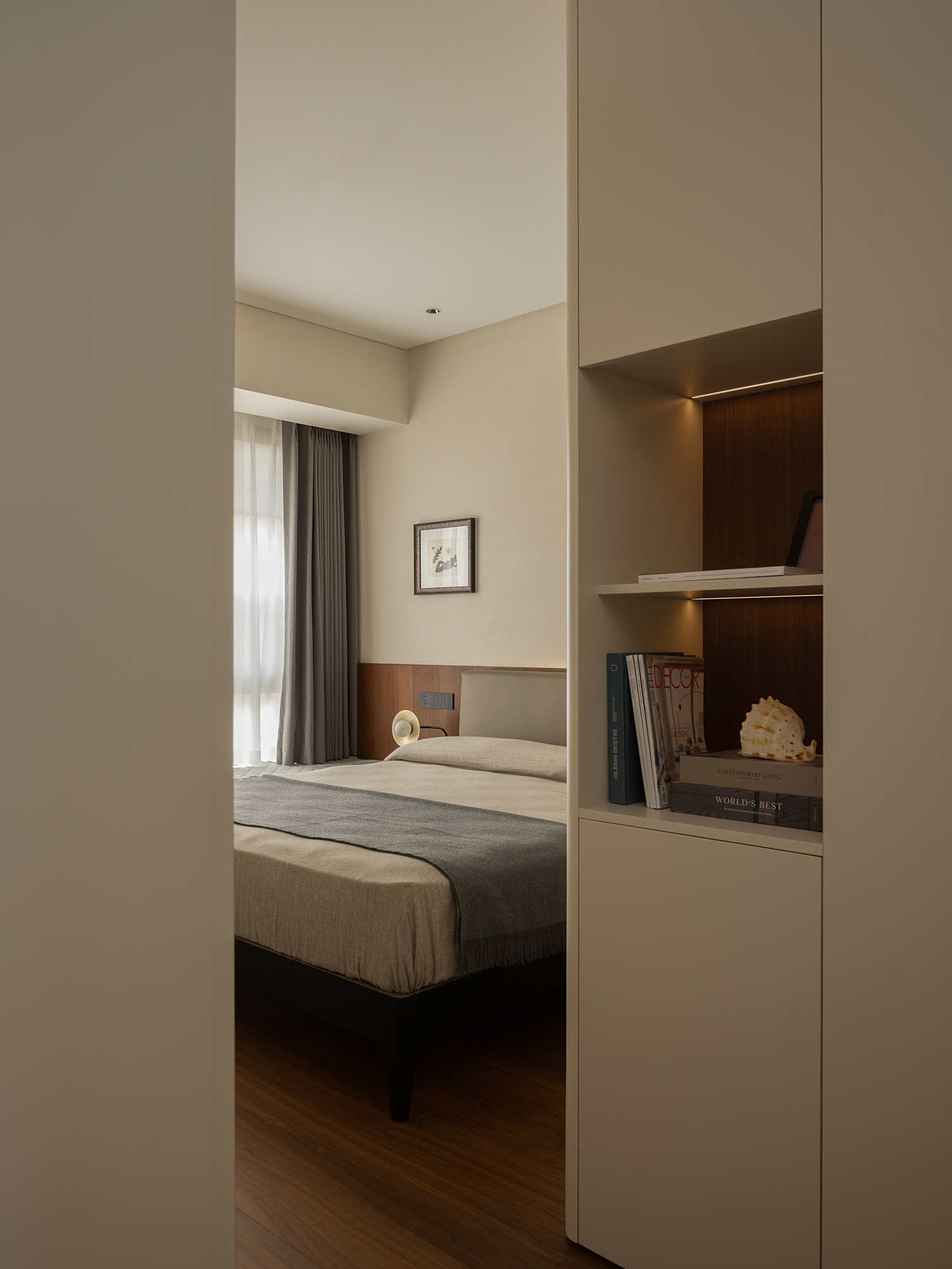 次卧则多了些许禅意,设置了一个小型的茶区。纱帘柔和地过滤阳光,静下心来泡一壶好茶,茶香飘逸在小天地间,品味茶的甘甜,感受生活的宁静。棉麻的床品、木质的装饰品,带来一种回归自然的本真感受。