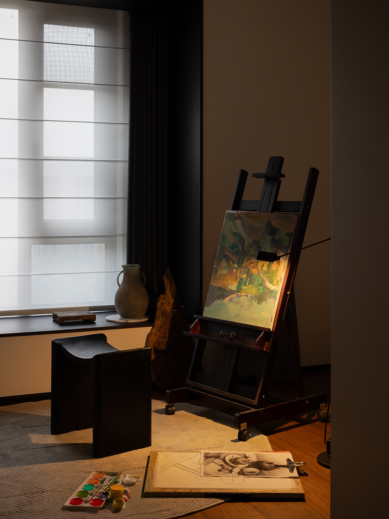 书房中每一个细节都体现了居者对文艺生活的热爱。丰富的色彩、抽象的色块,油画为空间注入焦点。精选的手工编织地毯为冷硬的地板带来柔和的质感,一盏温暖的灯光照亮居者的内心世界。