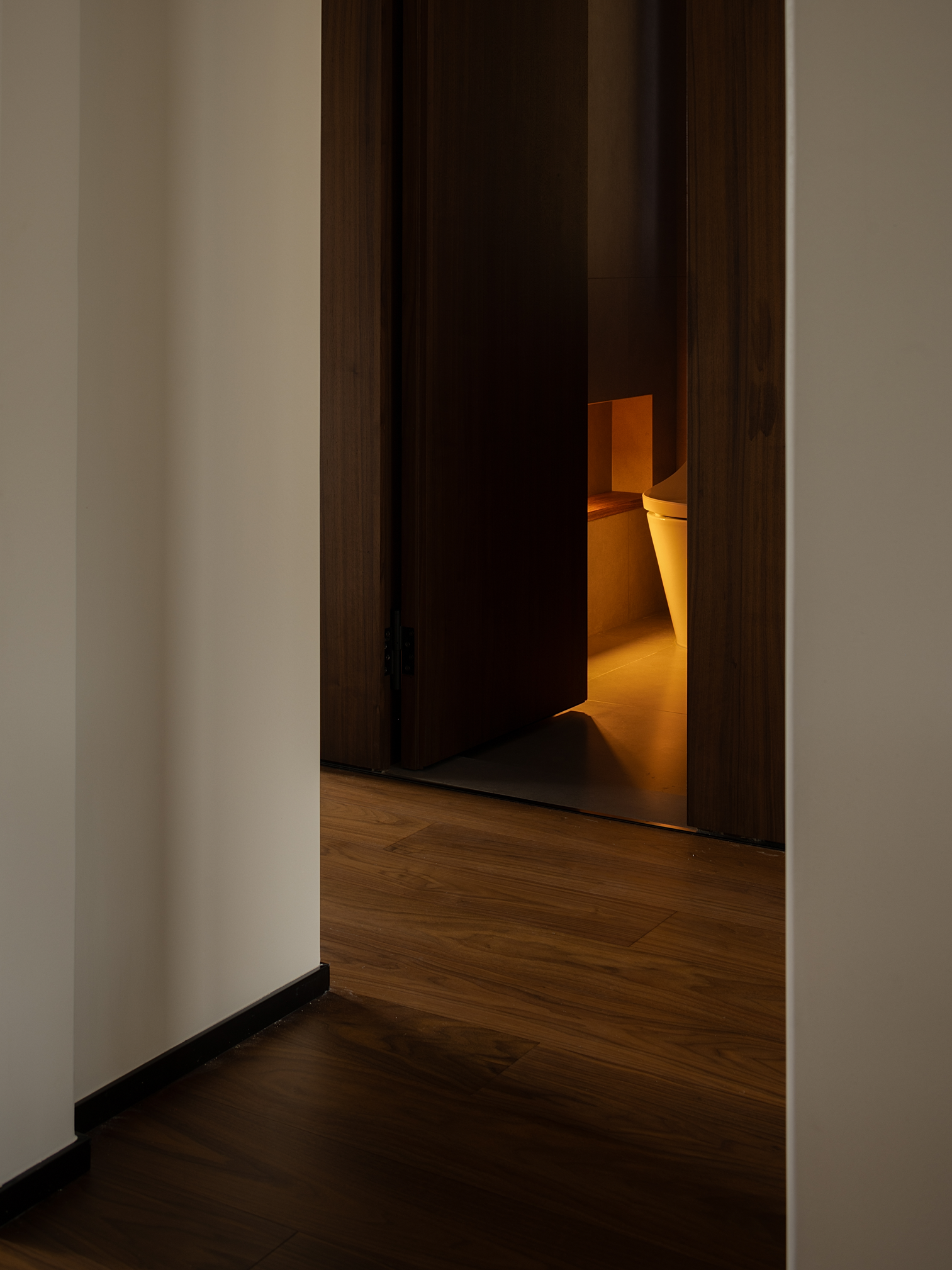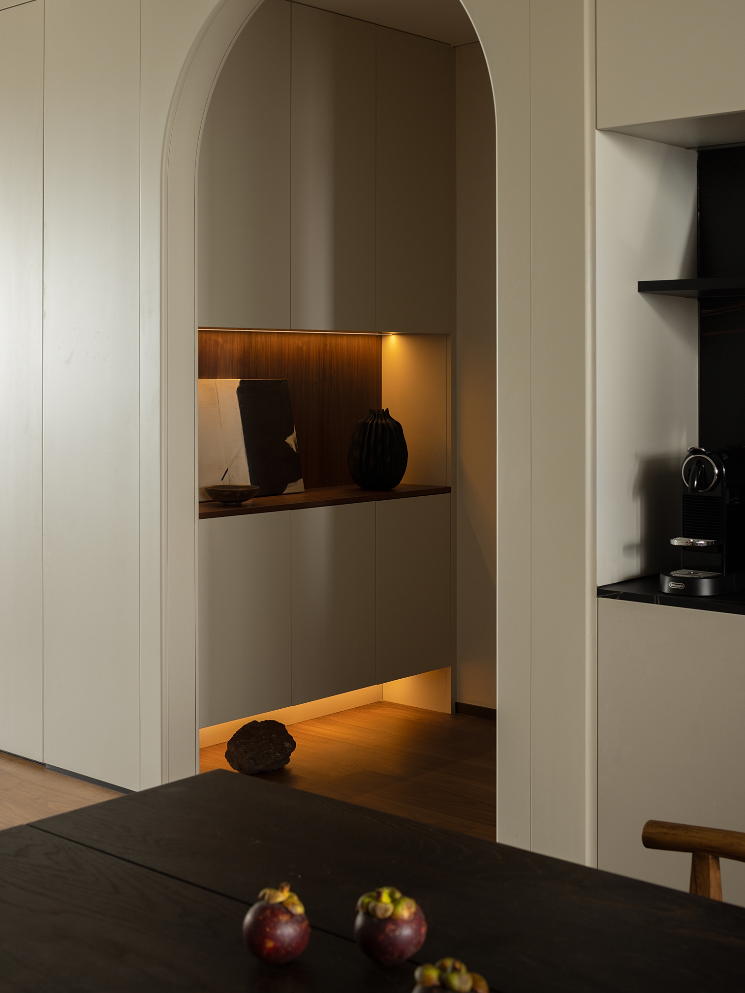 空间强调开放性和流动性,打破客厅与餐厨界限,让居者自由地移动与呼吸。大面积的落地推拉窗,让自然光线和微风形成对流,自然延伸至家中的每一个角落。