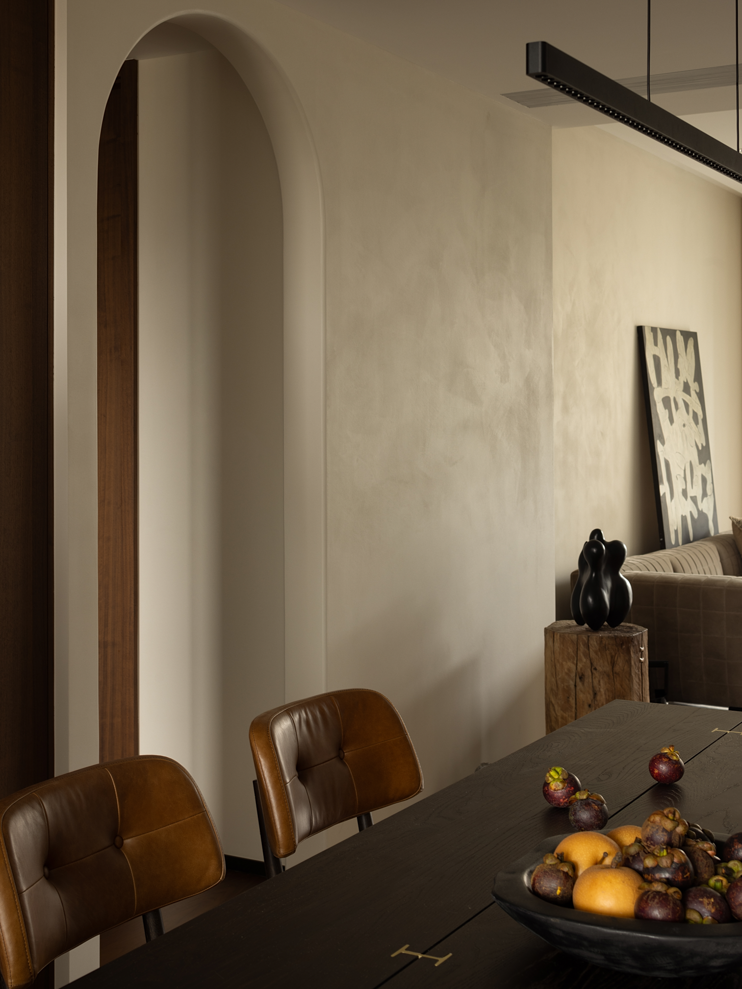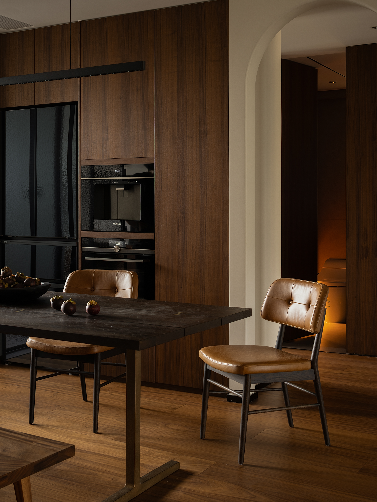 张精心打造的原木餐桌,成为餐厅的主角。每一块木板都诉说着树木生长的故事,每一次触摸都能感受到大自然的气息,搭配皮质餐椅雅致兼顾。水波纹推拉门巧妙分隔空间,阳光透过,形成斑驳的光影,感受空间延展。