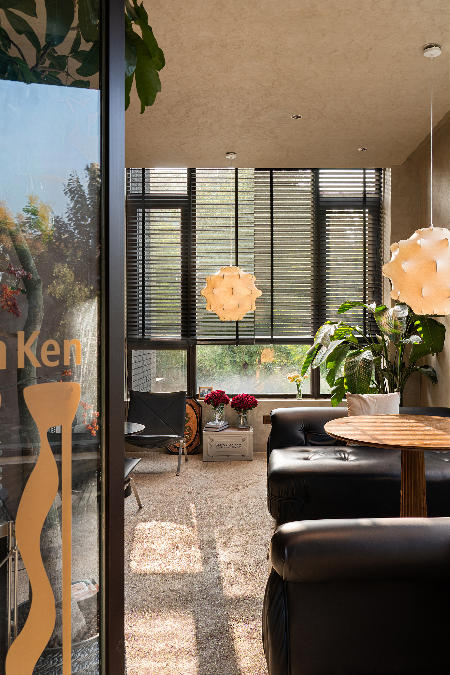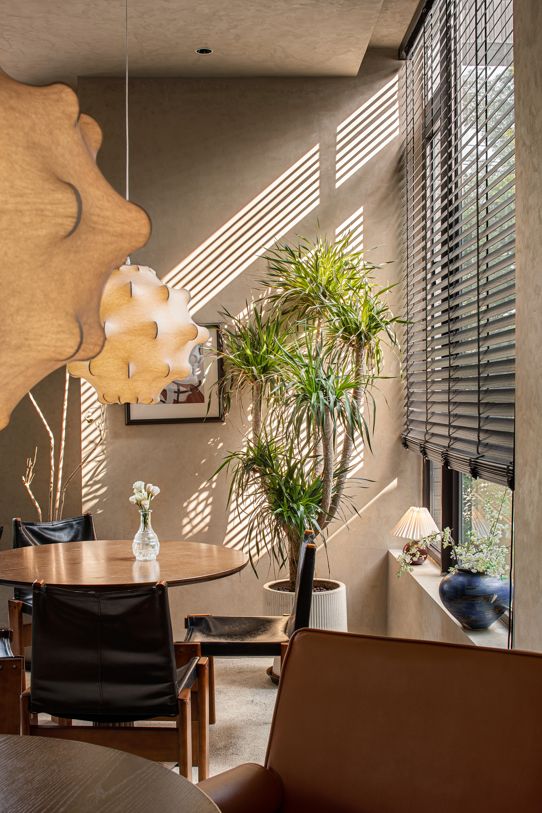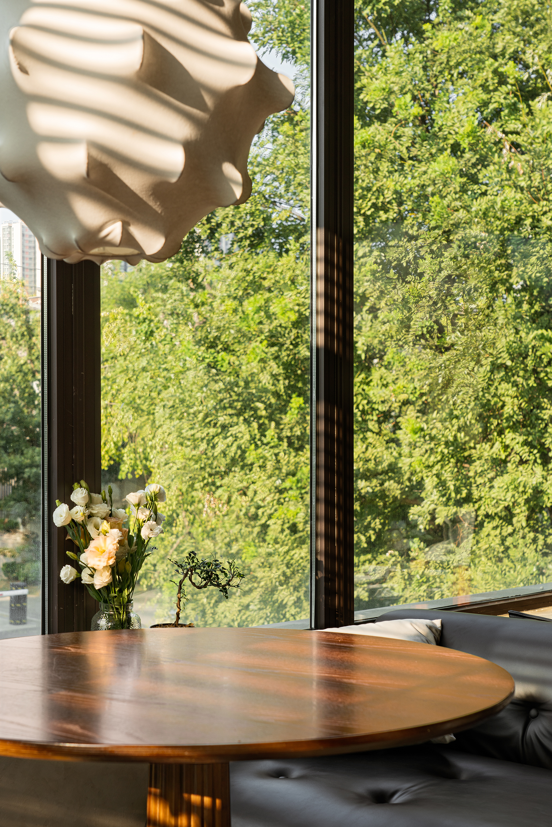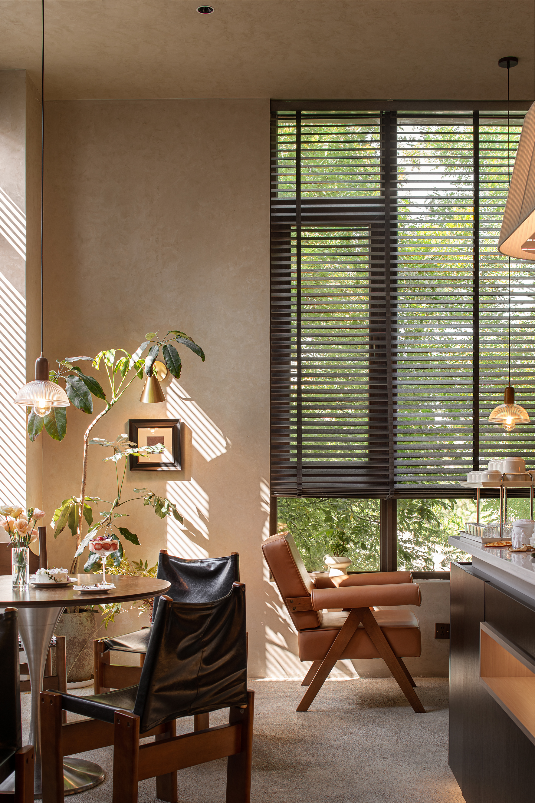 落地窗与百叶帘结合,斑驳的光影照亮宁静的午后。从窗外望去,满眼都是绿色。与好友说说笑笑,仿佛回到年少时光。