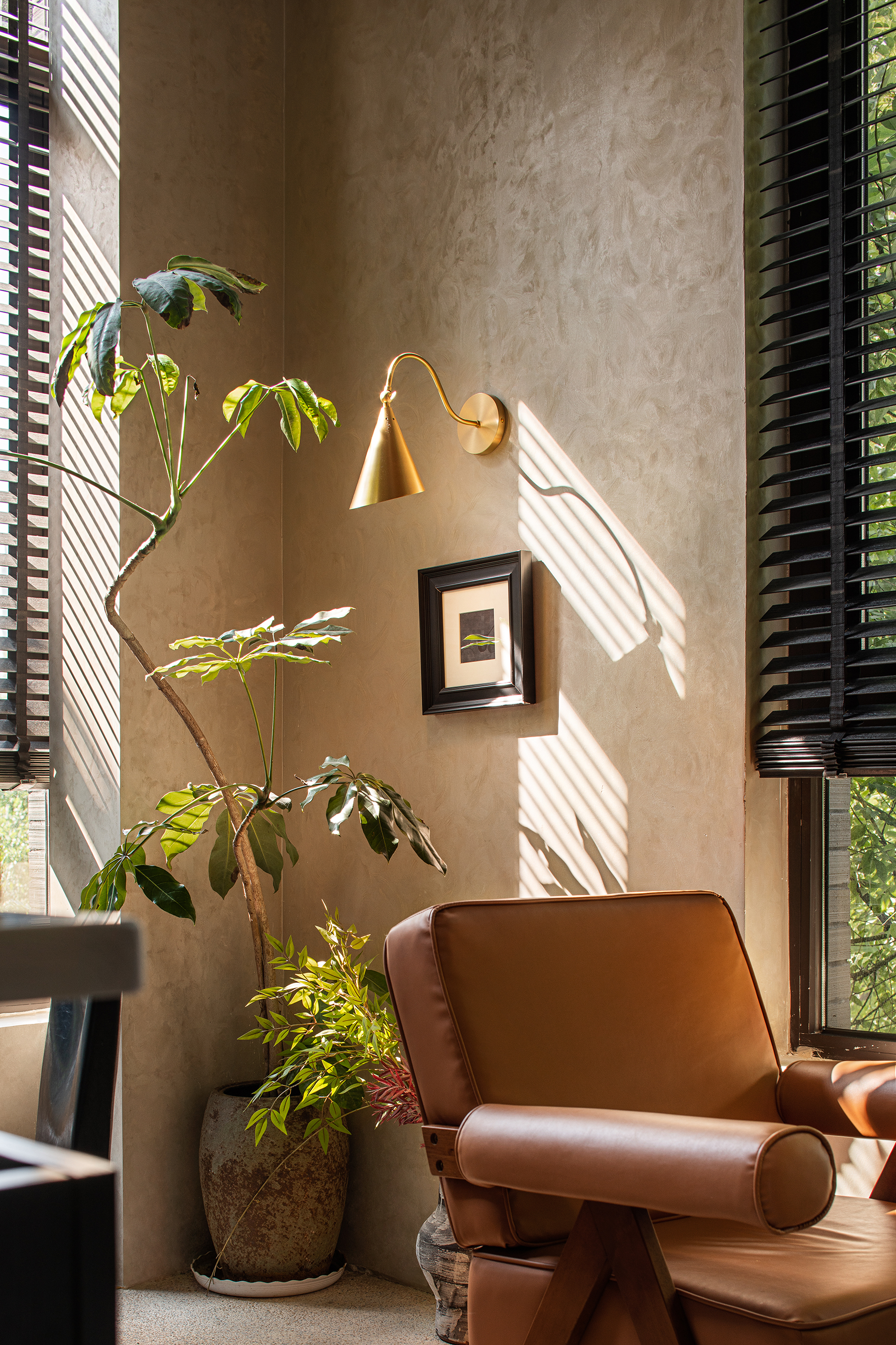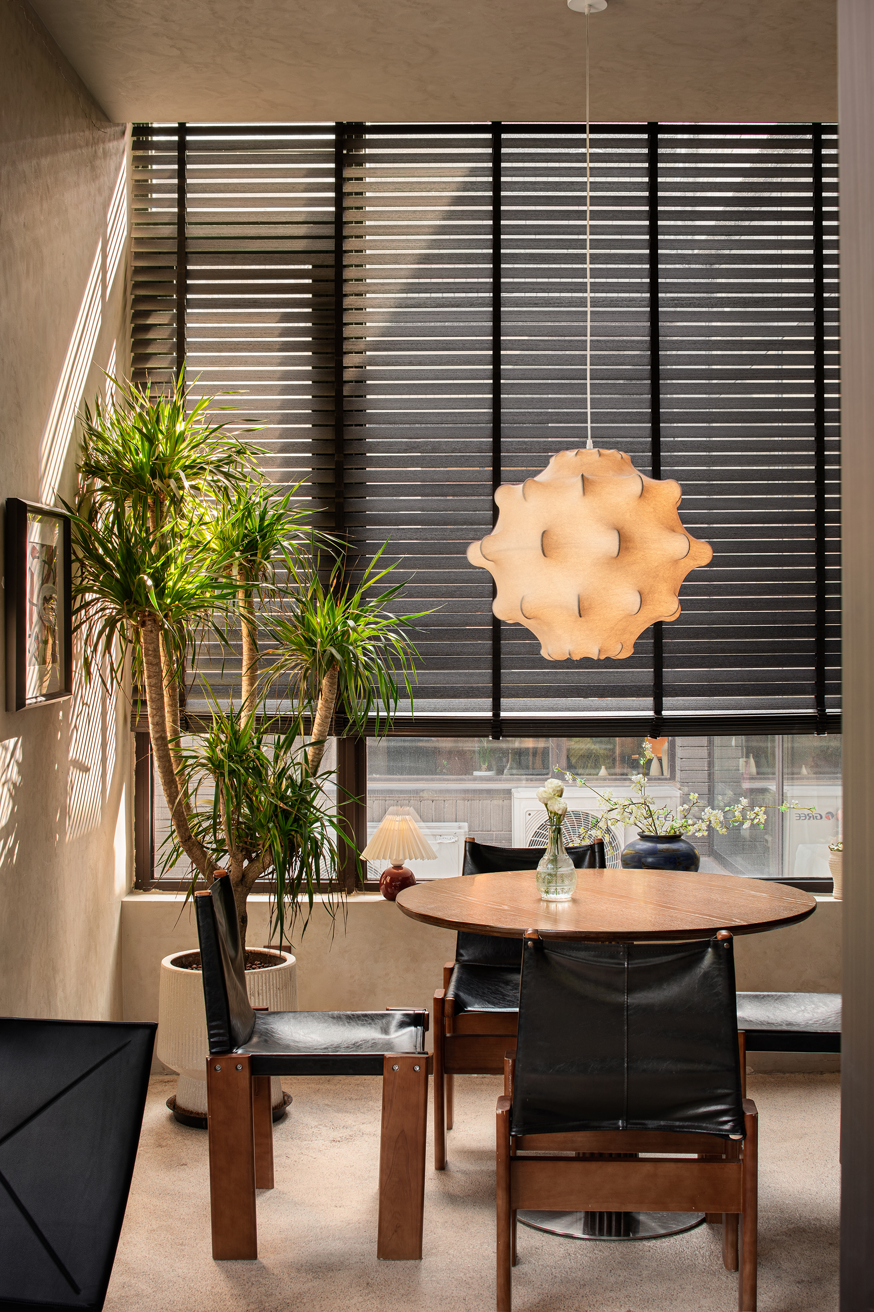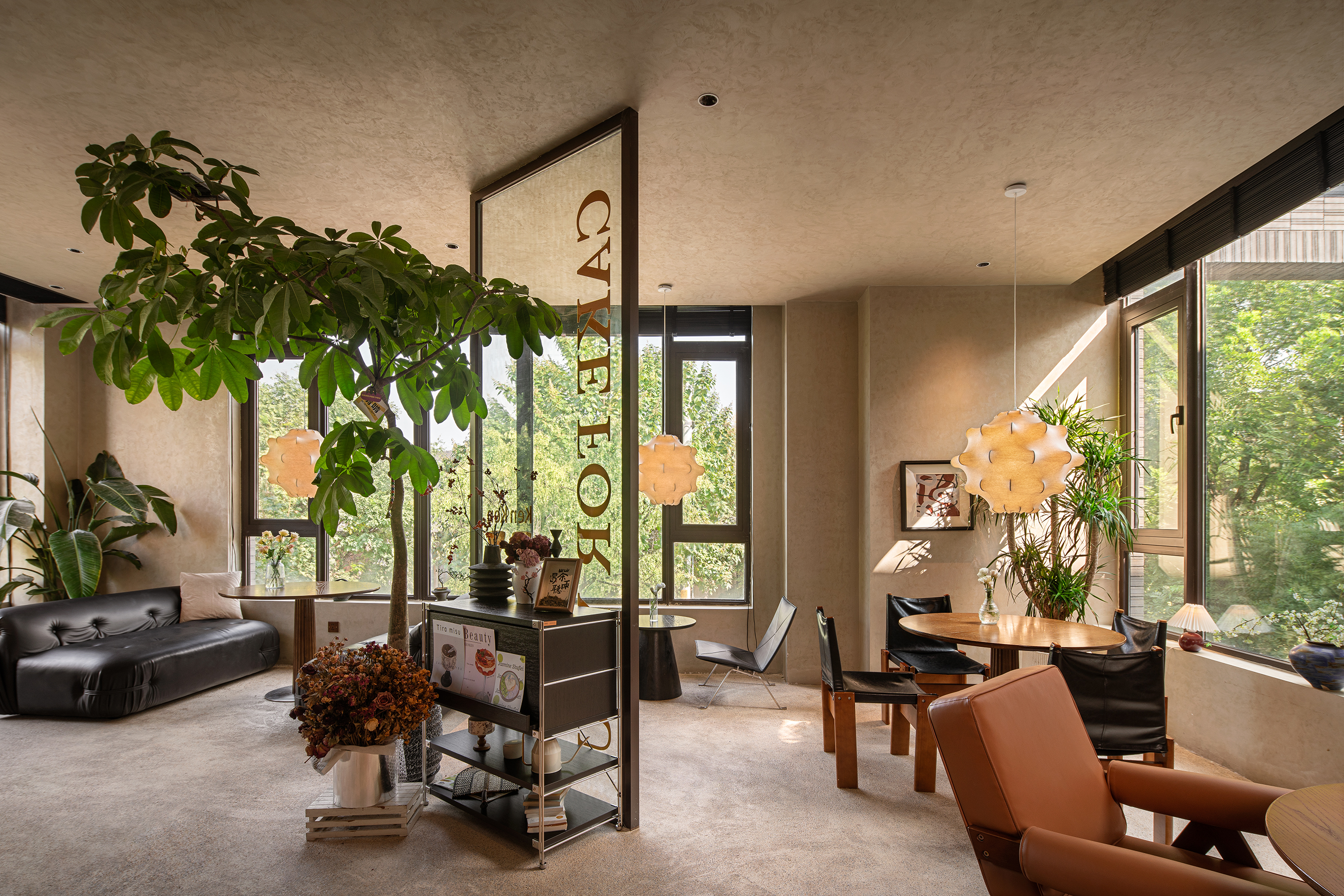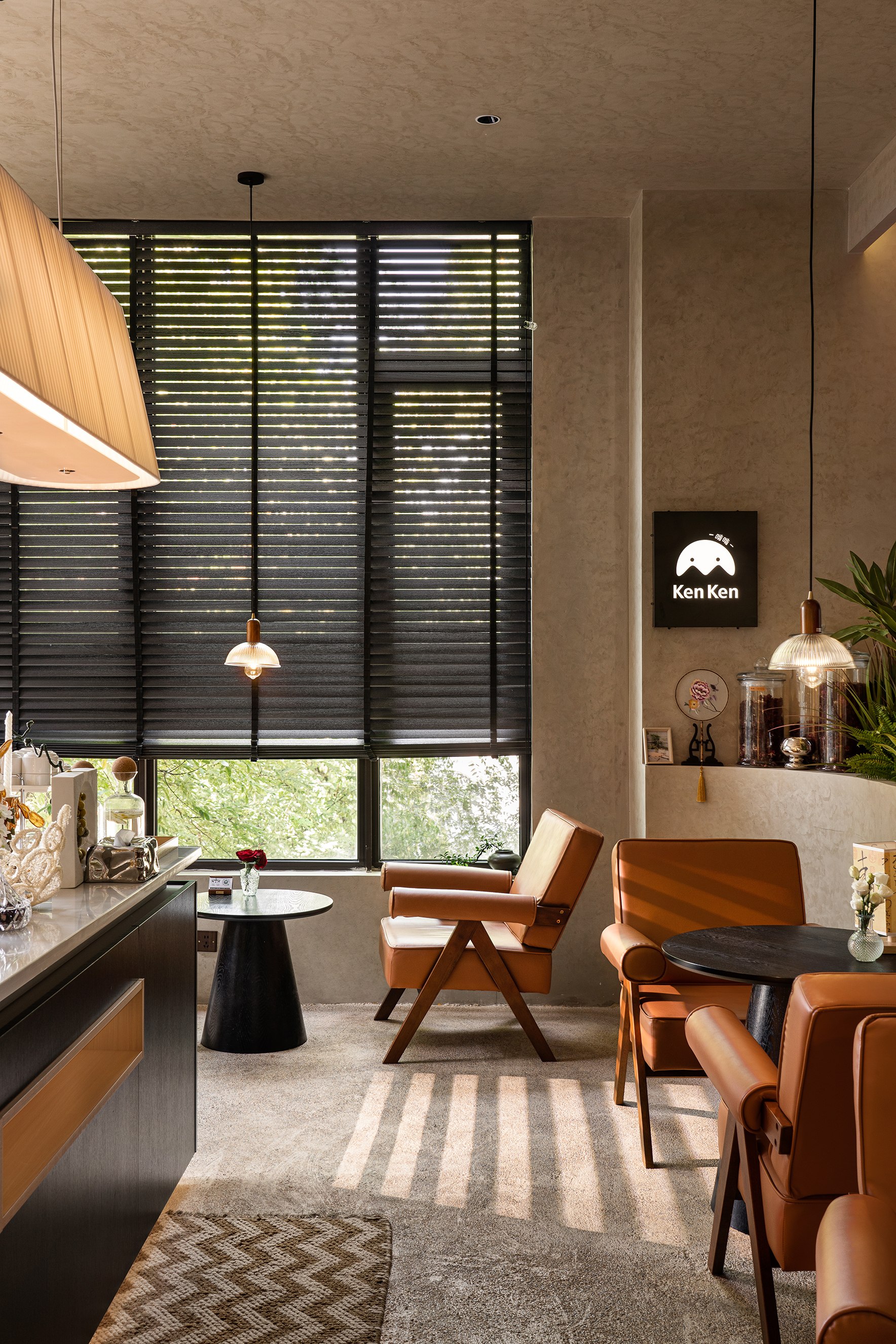 落地窗与百叶帘结合,斑驳的光影照亮宁静的午后。从窗外望去,满眼都是绿色。与好友说说笑笑,仿佛回到年少时光。