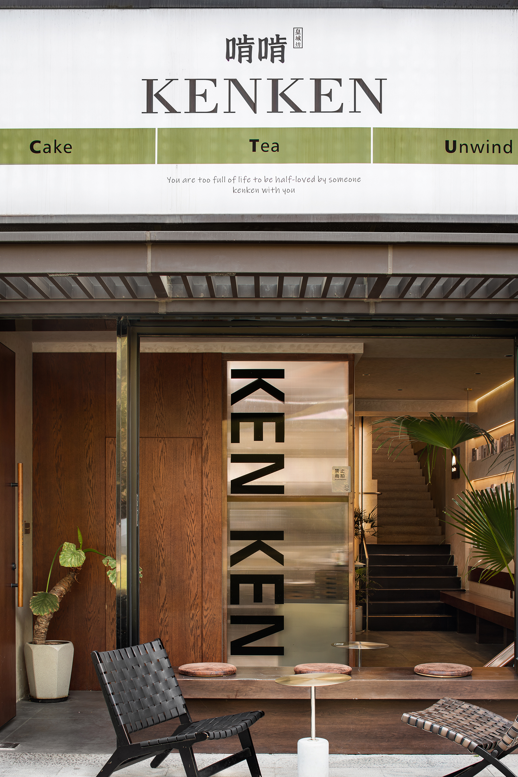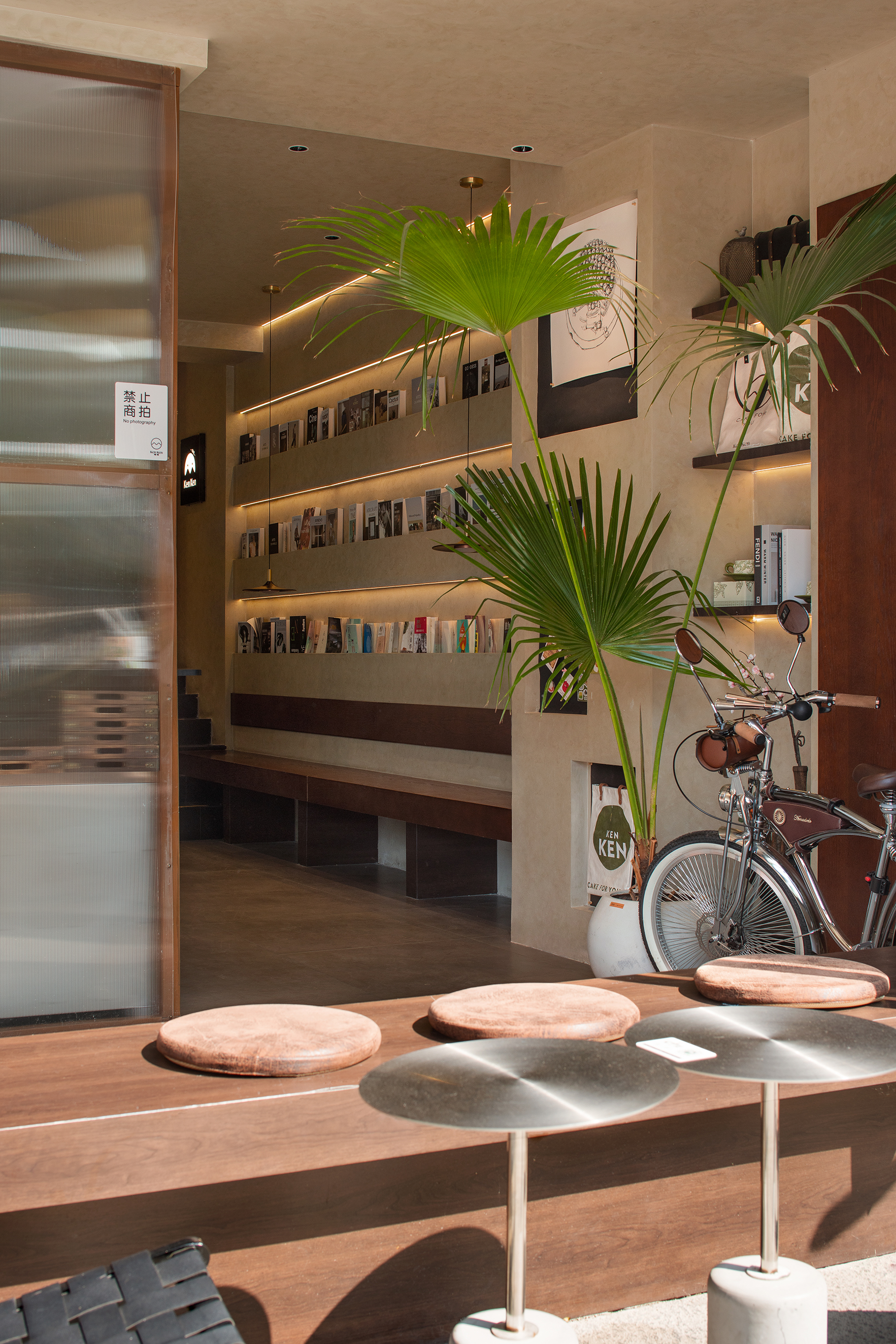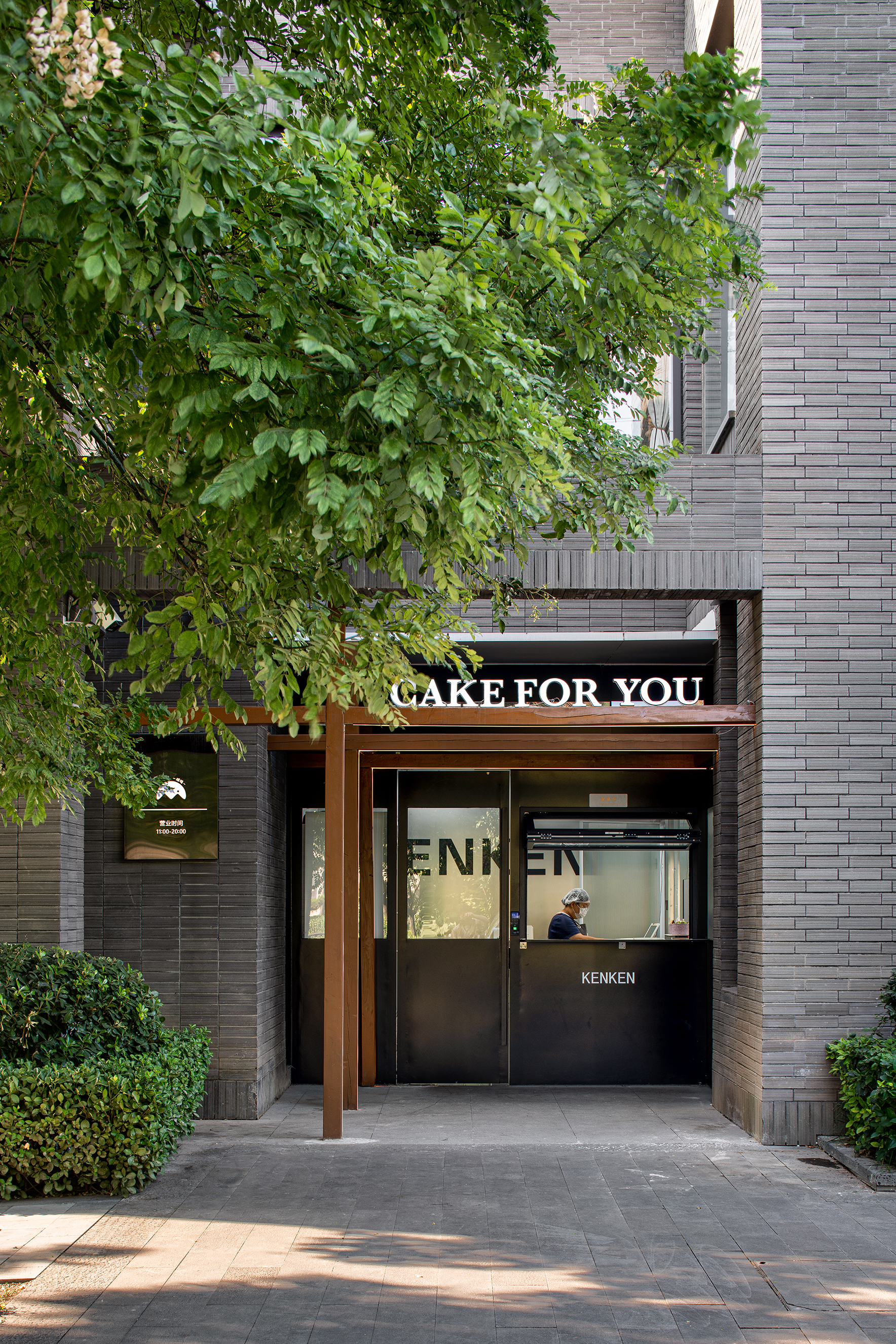 与城墙相呼应的水泥砖外立面,隐入自然环境,不同时节都有不同的风景,与附近居民的交融让啃啃更有人文气息。迎着风与花香,召唤人进入小憩的“魔力”。 外卖口以玻璃、原木做进入衔接,蛋糕从这里取走方便快捷。在这里远离尘嚣,感受发酵的魅力,拥抱每一刻惬意。