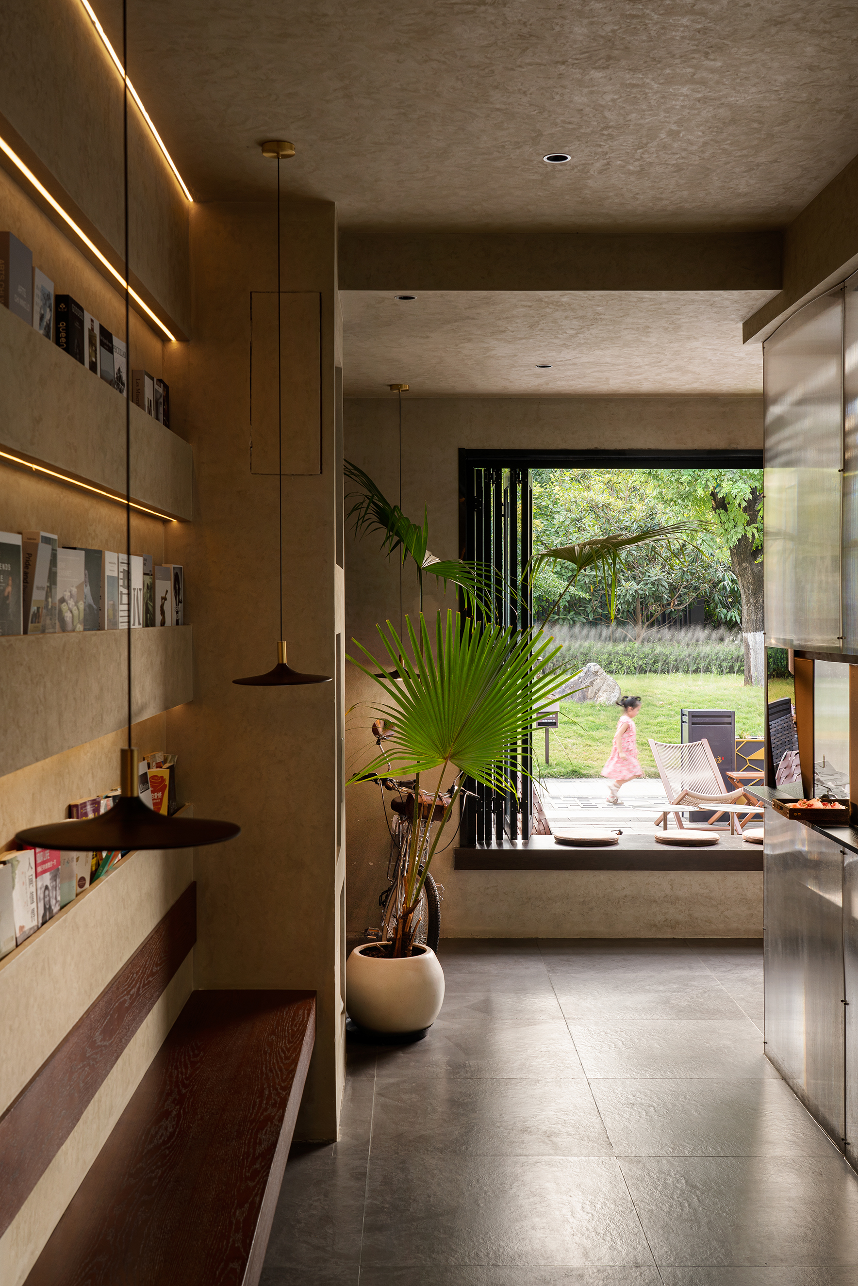 02 探索&交汇 入口设计融入了更多自然元素,让每一位到店的客人能够感受到空间里的治愈温暖,整面窗子可以打开推至一侧。 外摆自然过渡到室内,原木与金属结合出中古与现代之美。将室内与自然景观无缝融合在一起。