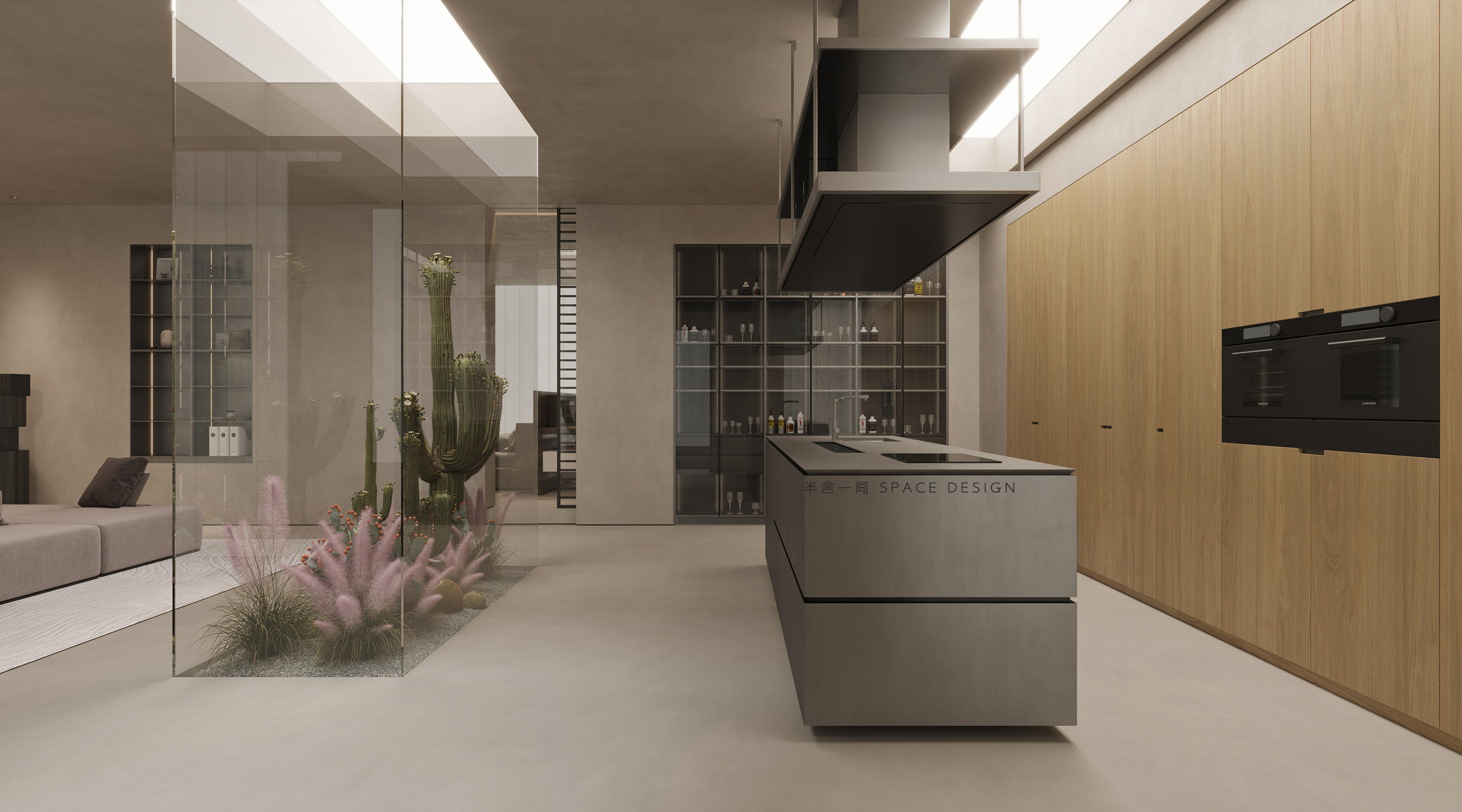 由玻璃盒子围绕的中庭式景观被放置在入口中心,透过灯光指引,形成回字形动线,让来者逗留时间加长,且可随意变换动作依靠交谈。展示产品的上方基本没做可见灯,采用暗藏灯膜的设计,希望营造光线像天窗一样进入的感觉,构建一种安静的氛围。