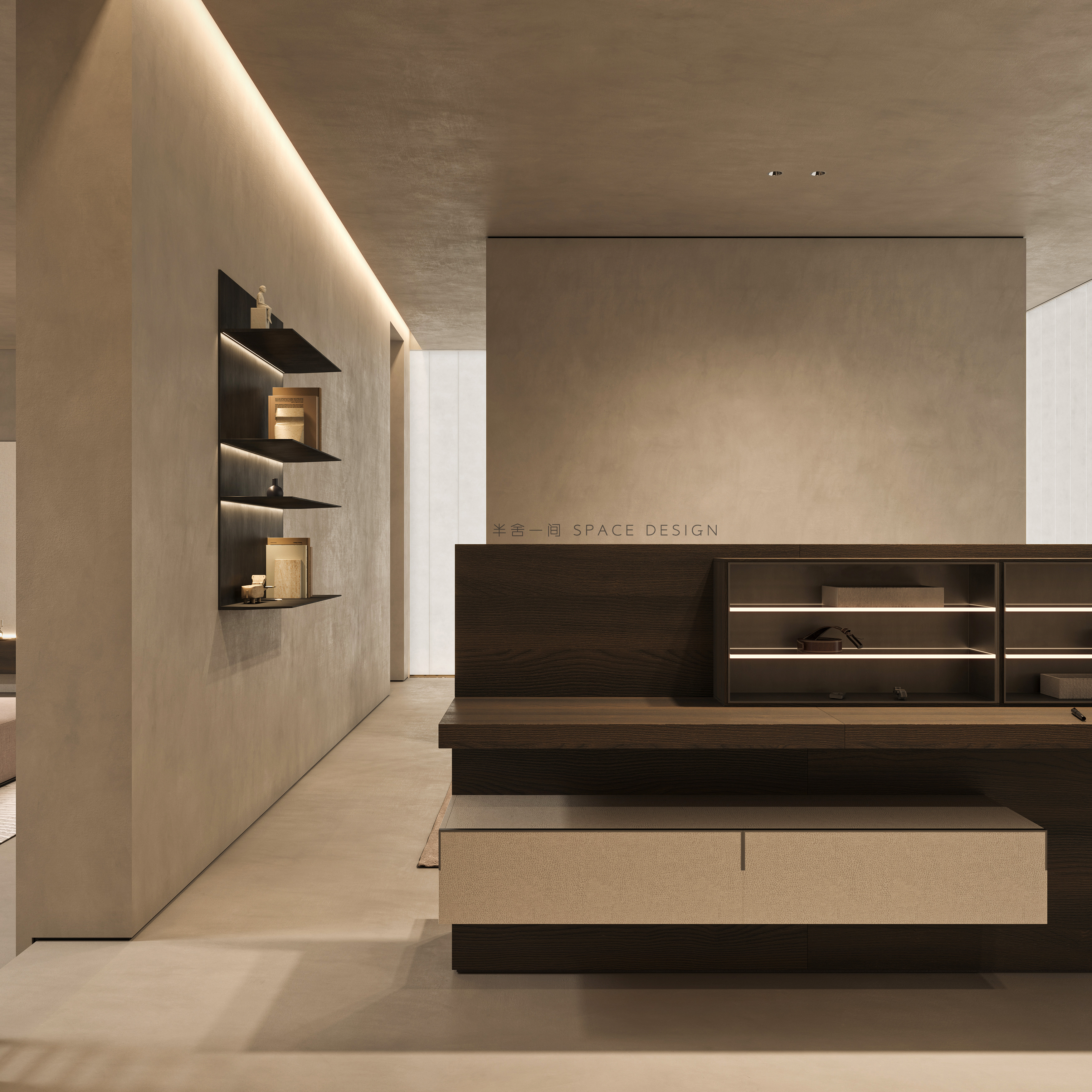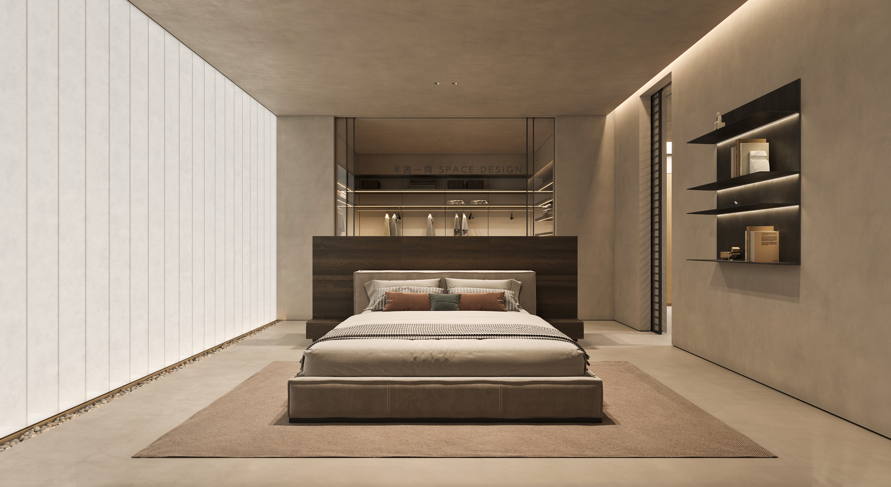 半高的床头背景造型不仅让产品的陈列更独立,同时空间又彼此相连