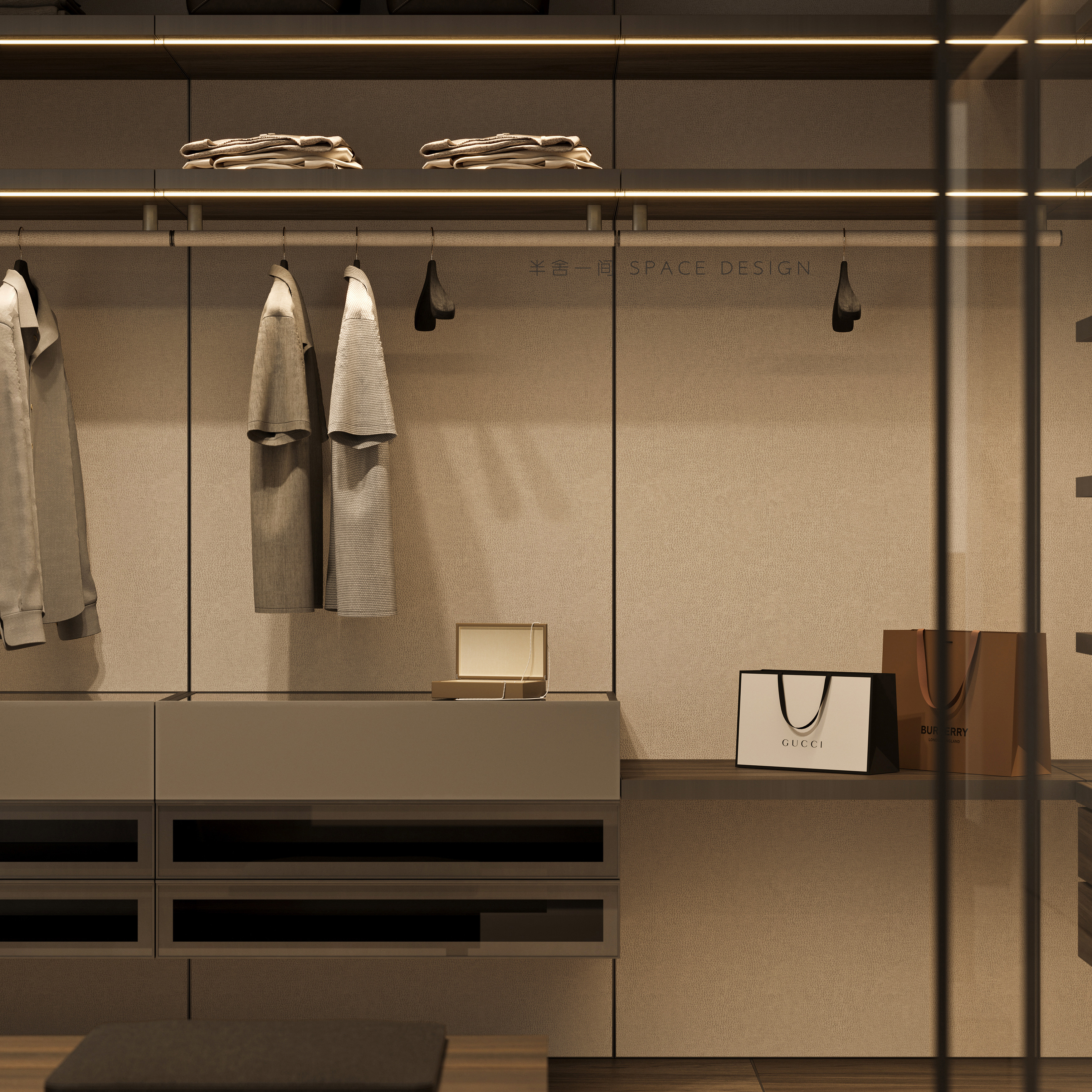 超越了实体元素的概念,提出了一个柔软的容器系统。各种尺寸的袋子都挂在带有滑动铝架的结构上,保证了完美的可塑性。因此,它们从内容中形成自己的形状:衬衫包、内衣包、腰带、手提包和鞋子等配饰,就像传统的裤架或裙子架和拉出式搁板一样。