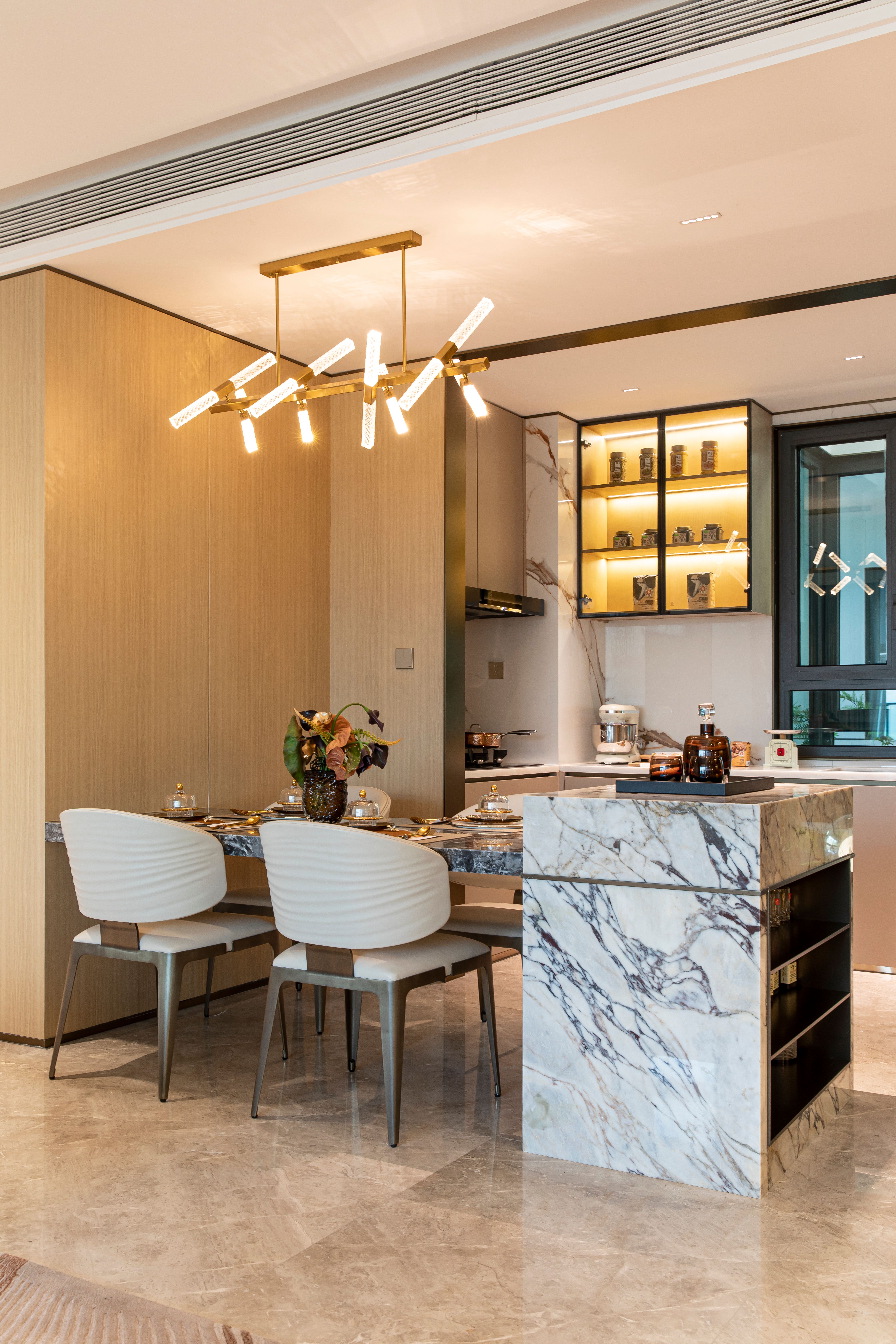 身居客厅,就会感受到阵阵温和的摇曳感。木质墙壁贴设大理石面板,质朴与现代打破宁静的平衡,重新调和出活络的视觉观感,令室内犹如微风拂过水面,荡起阵阵美学波澜。