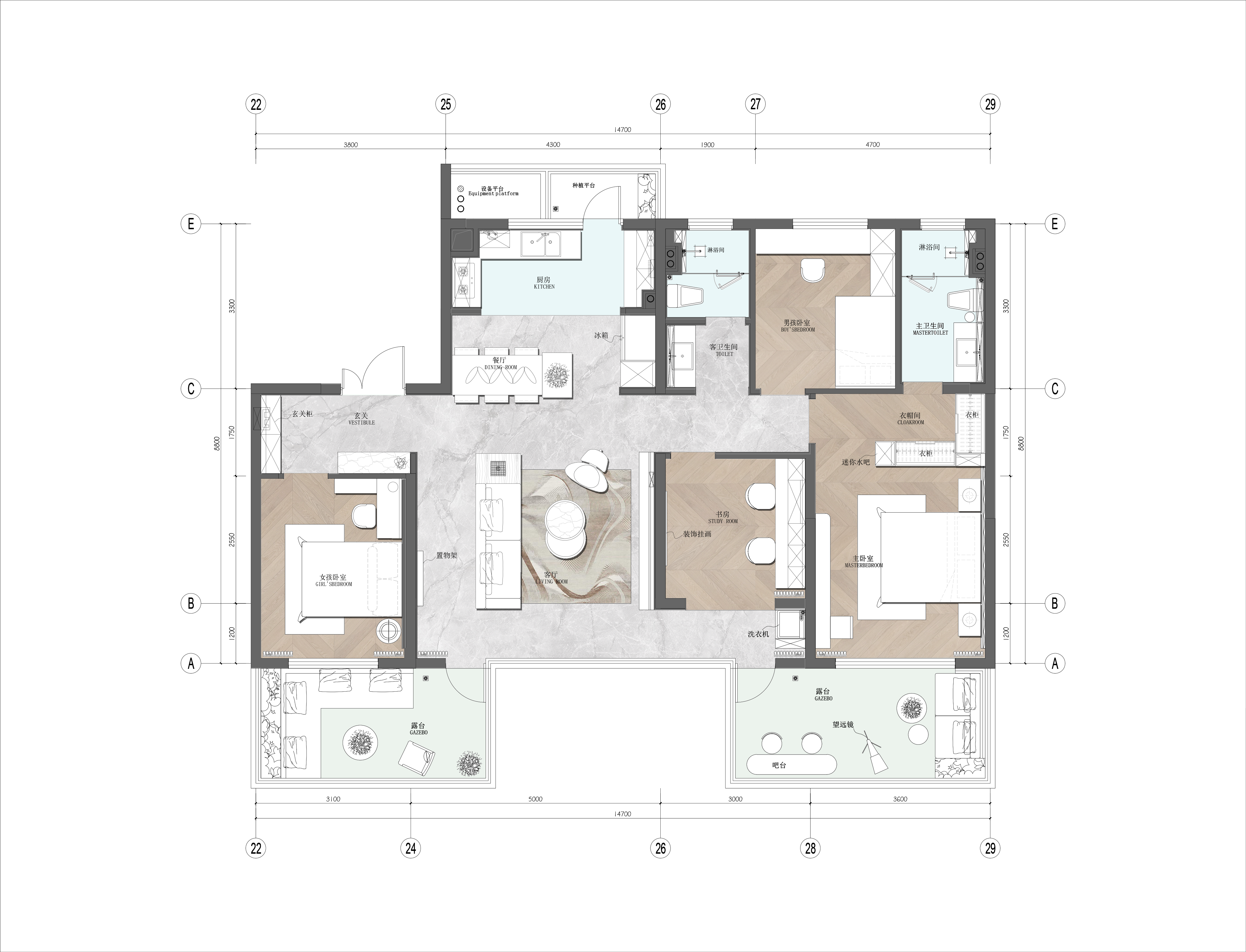 本案业主定位为一家四口,更多的是希望空间能够自然,温馨。居家空间希望尽量简洁、开阔,以浅色暖调为基础,风格定位为现代简约
