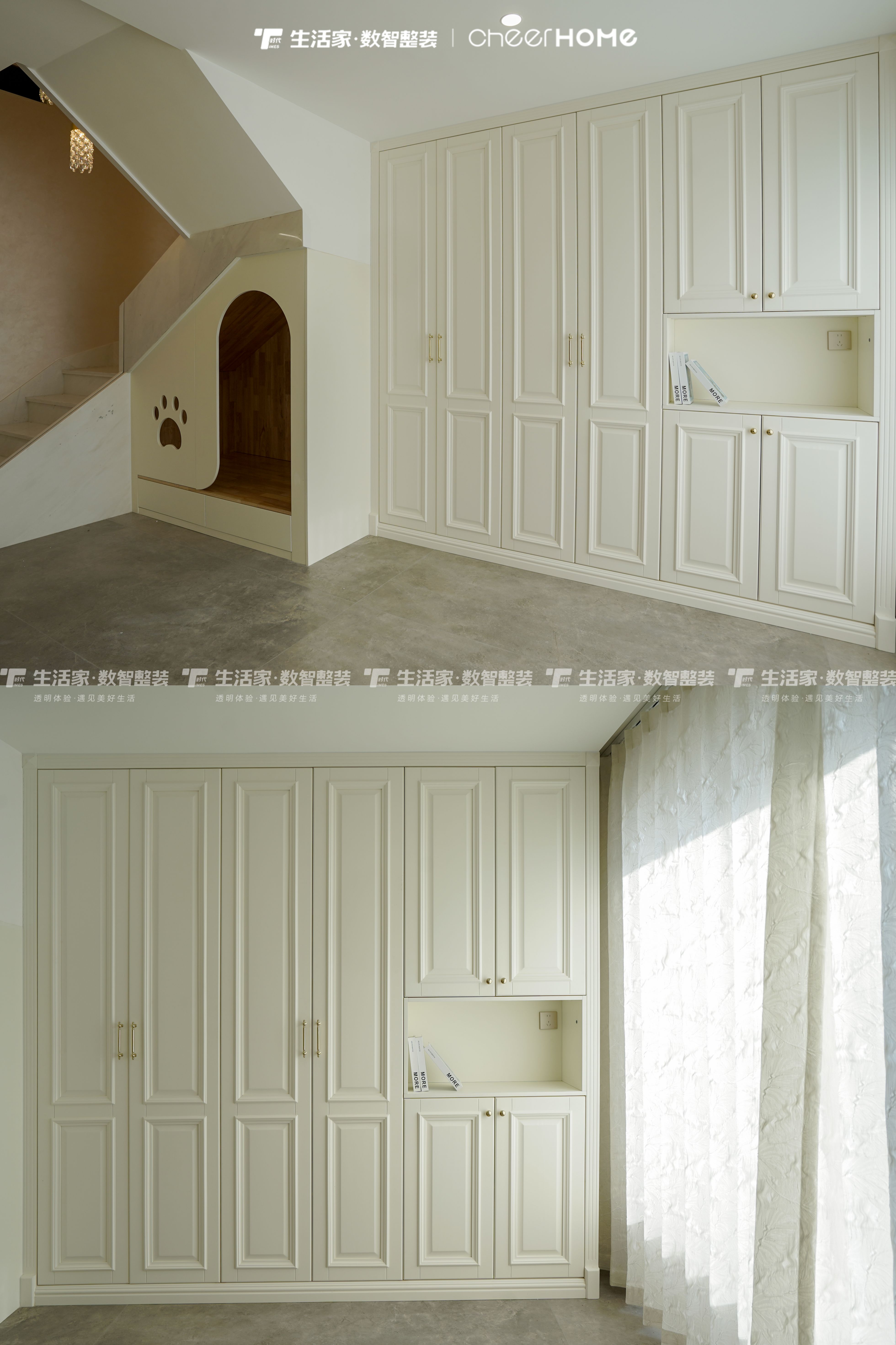 空间布局:原始的顶楼跃层+两露台改造为适合全家人居住的舒适空间,结构的重塑将空间布局合理化