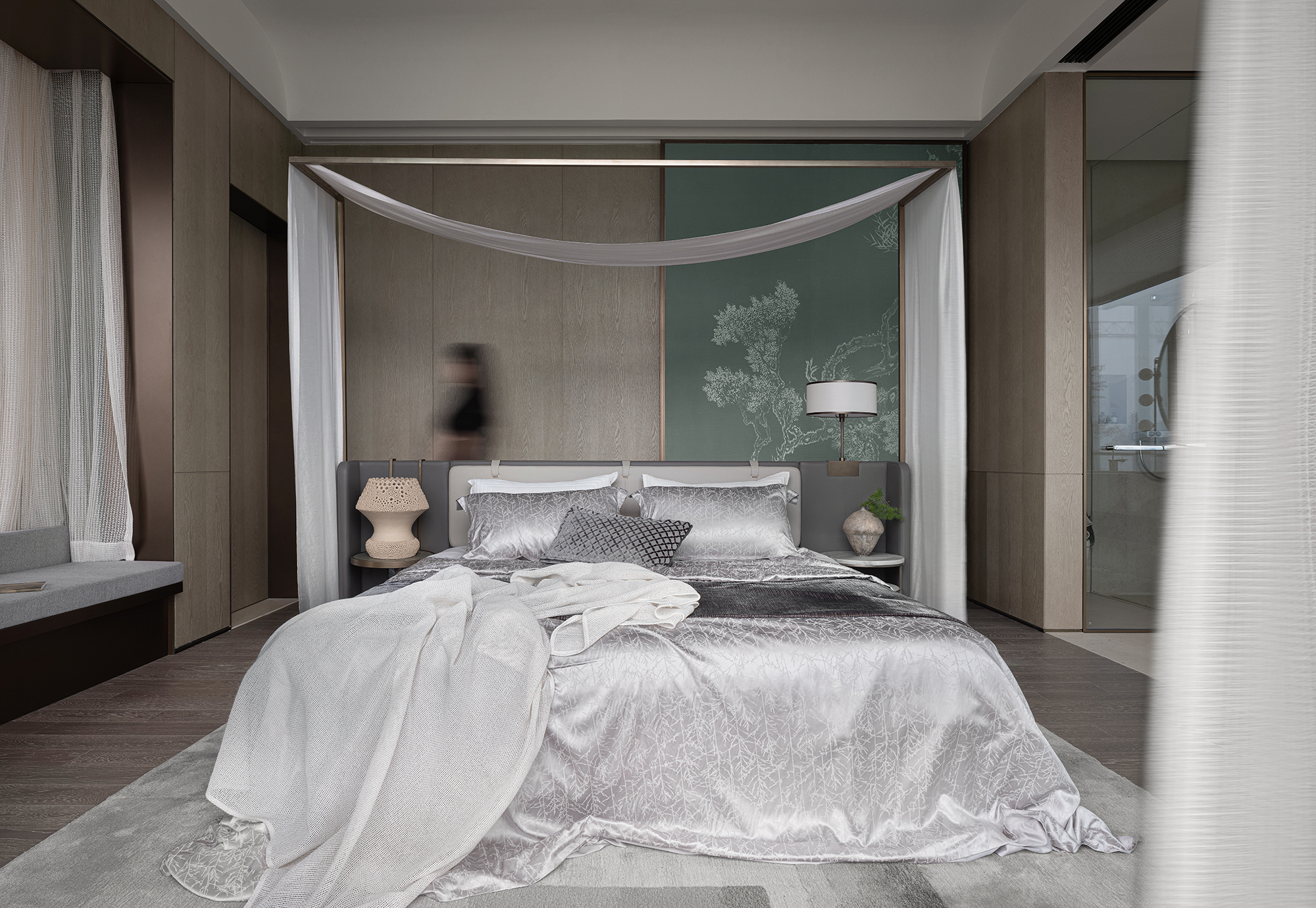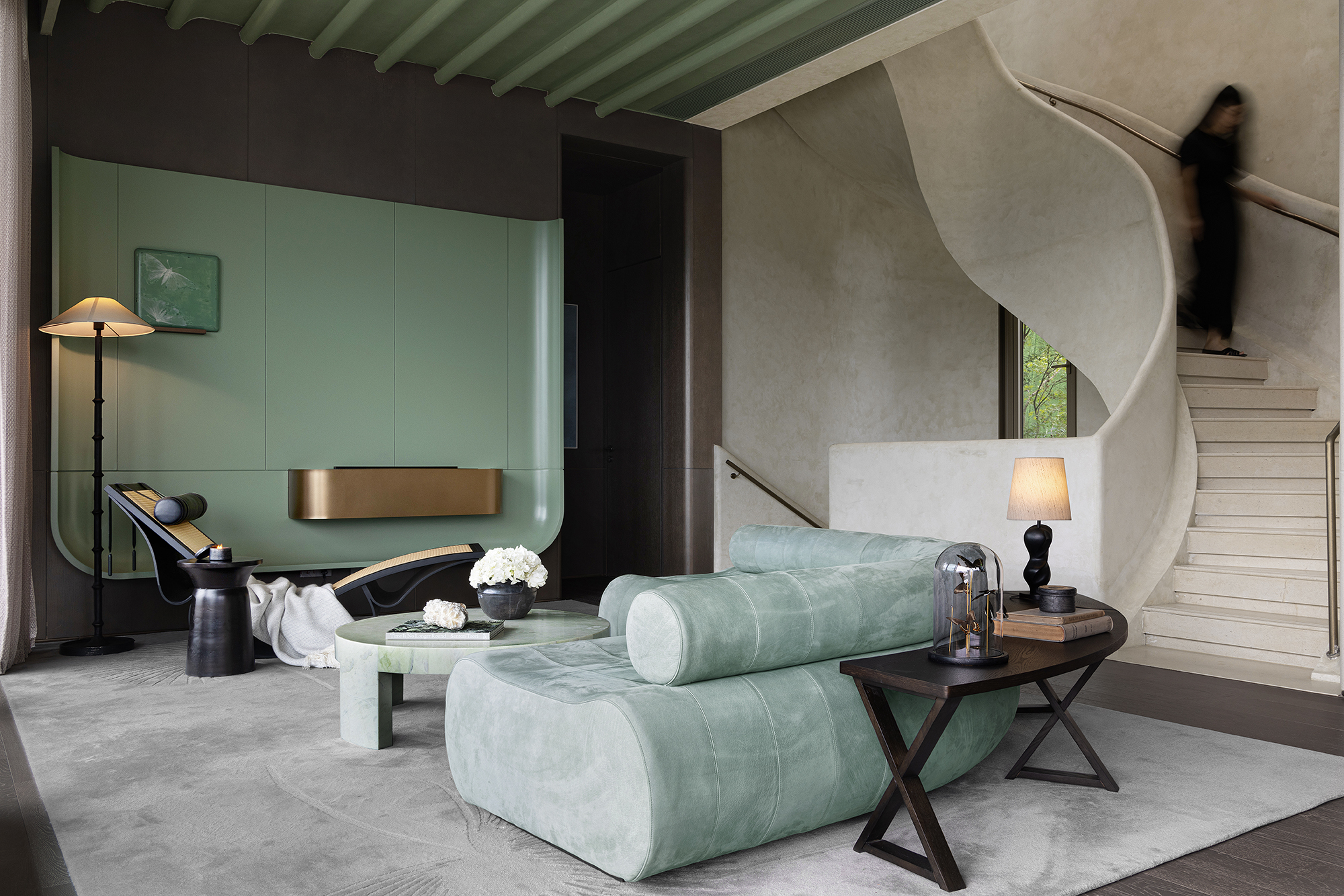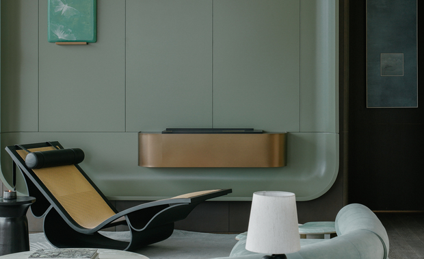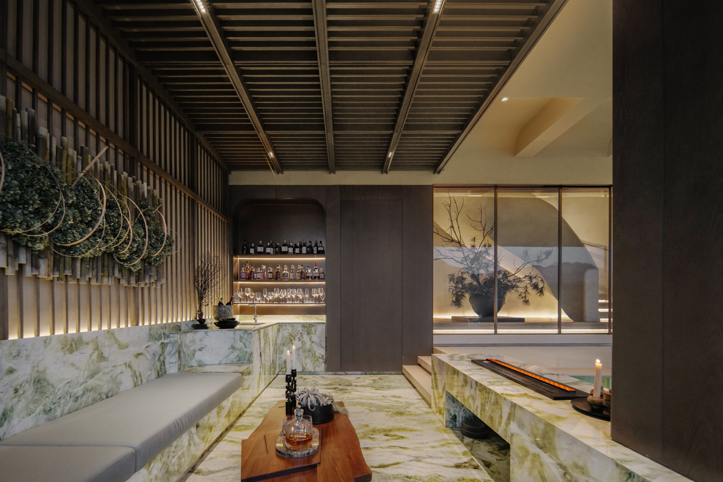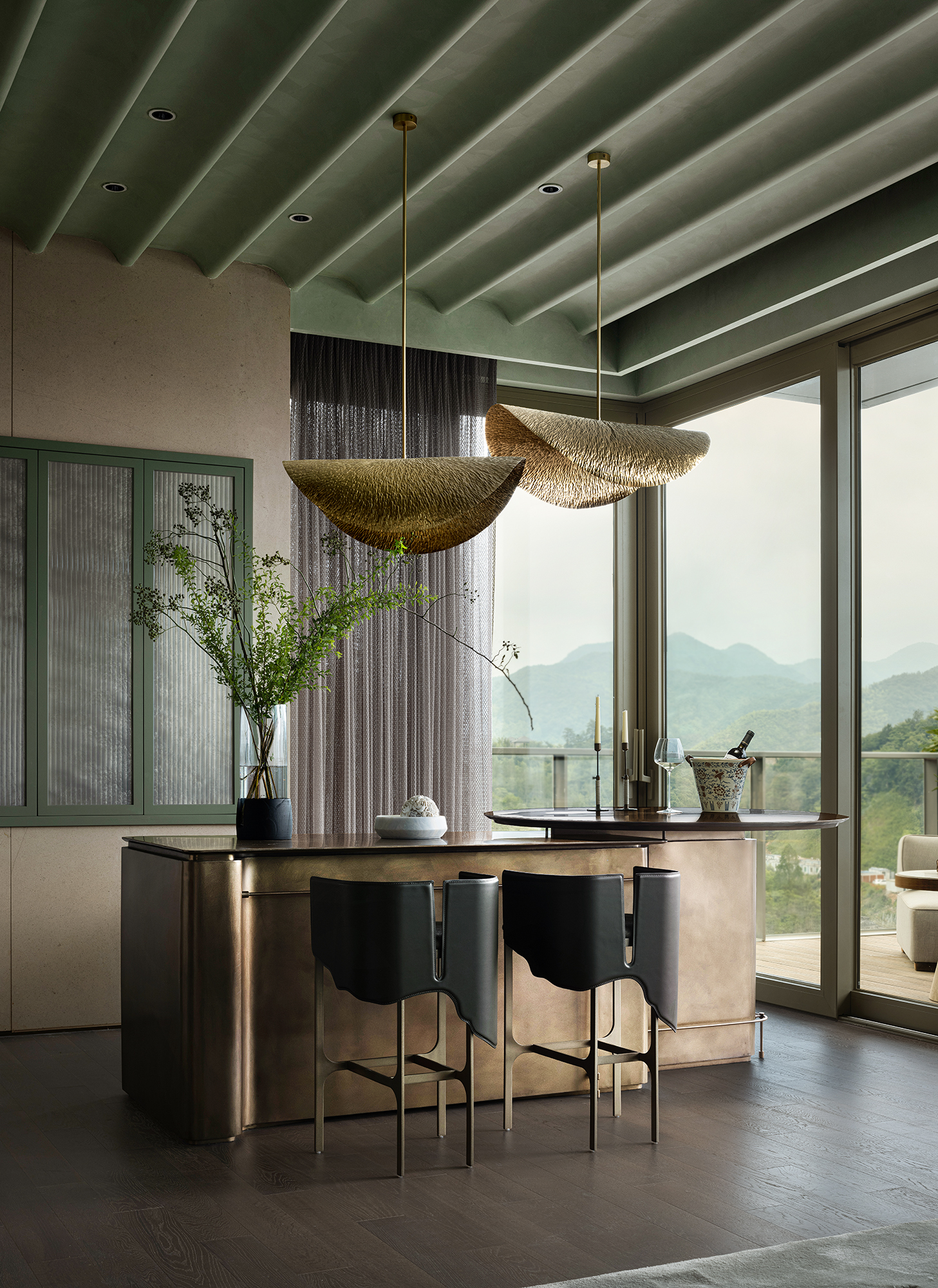 设计选材:金属材质和现代设计创设空间层次和质感,与远山青黛相融,令山居生活亦洋溢着高品质的现代之美。竹青大漆壁炉背景令生活的节奏沉静下来,卧于藤编躺椅,于清凉中小憩,随之进入度假的心境。主卧以青色竹纹与群山呼应、与安吉浪漫的东方元素契合,为整个空间的气质定格。次卧则以仿竹席装饰墙壁,更增添传统山居的清凉意趣。休闲区域尽用青黛纹路石材铺就,背景则以竹节呼应。东方文人惯于放野山林,在自然山水中寻找答案。在此处欢聚小酌,便有坐卧山林、曲水雅集之意。有竹林松风相伴,且饮且谈,找寻那个属于自我的答案。