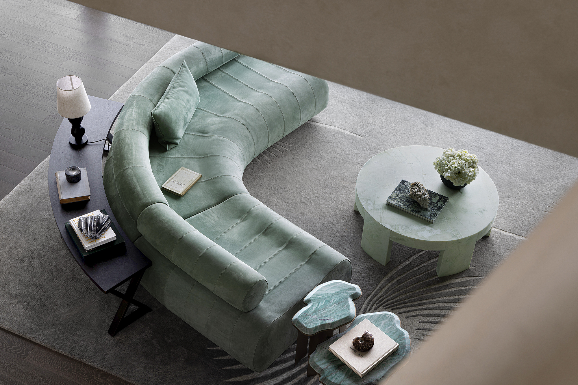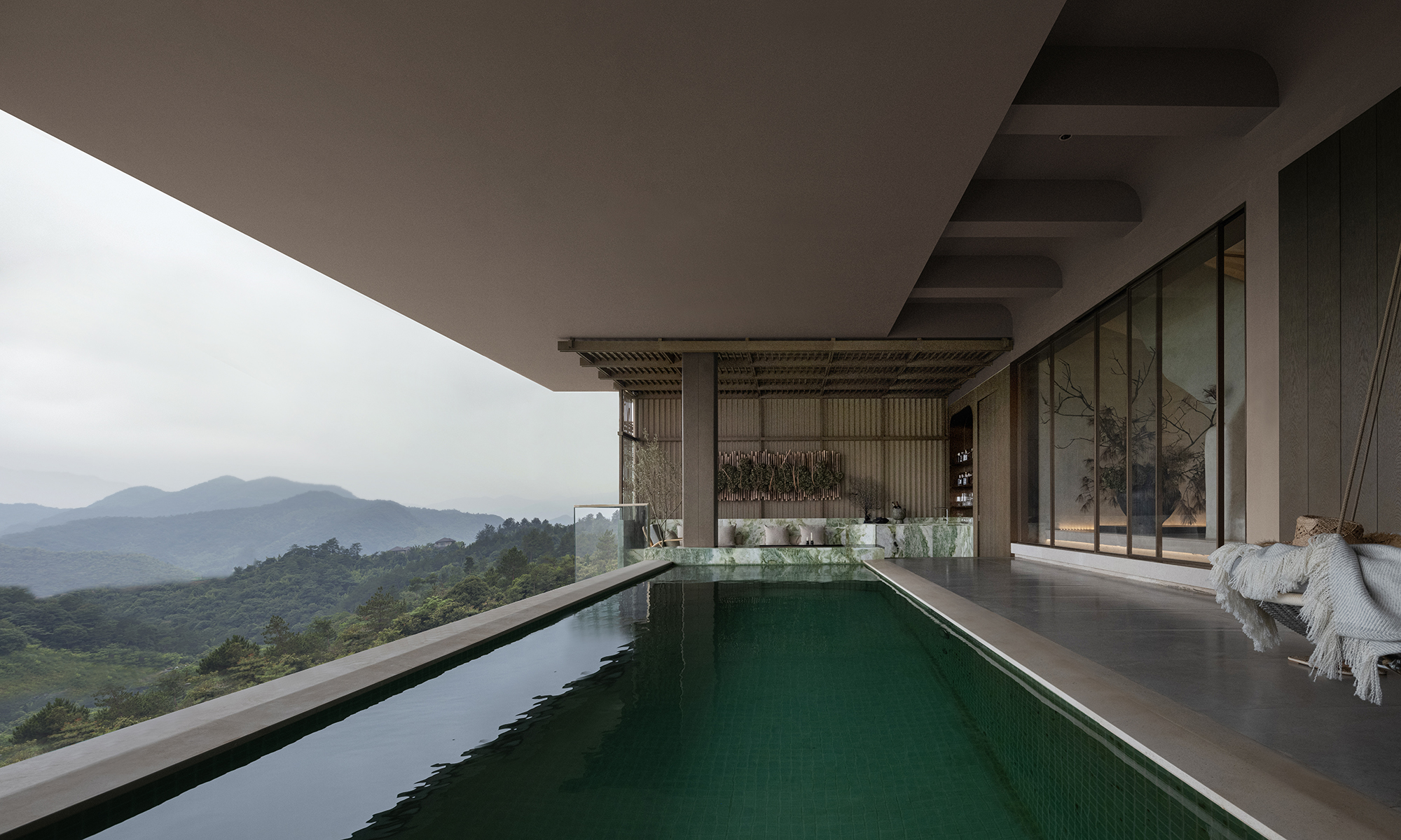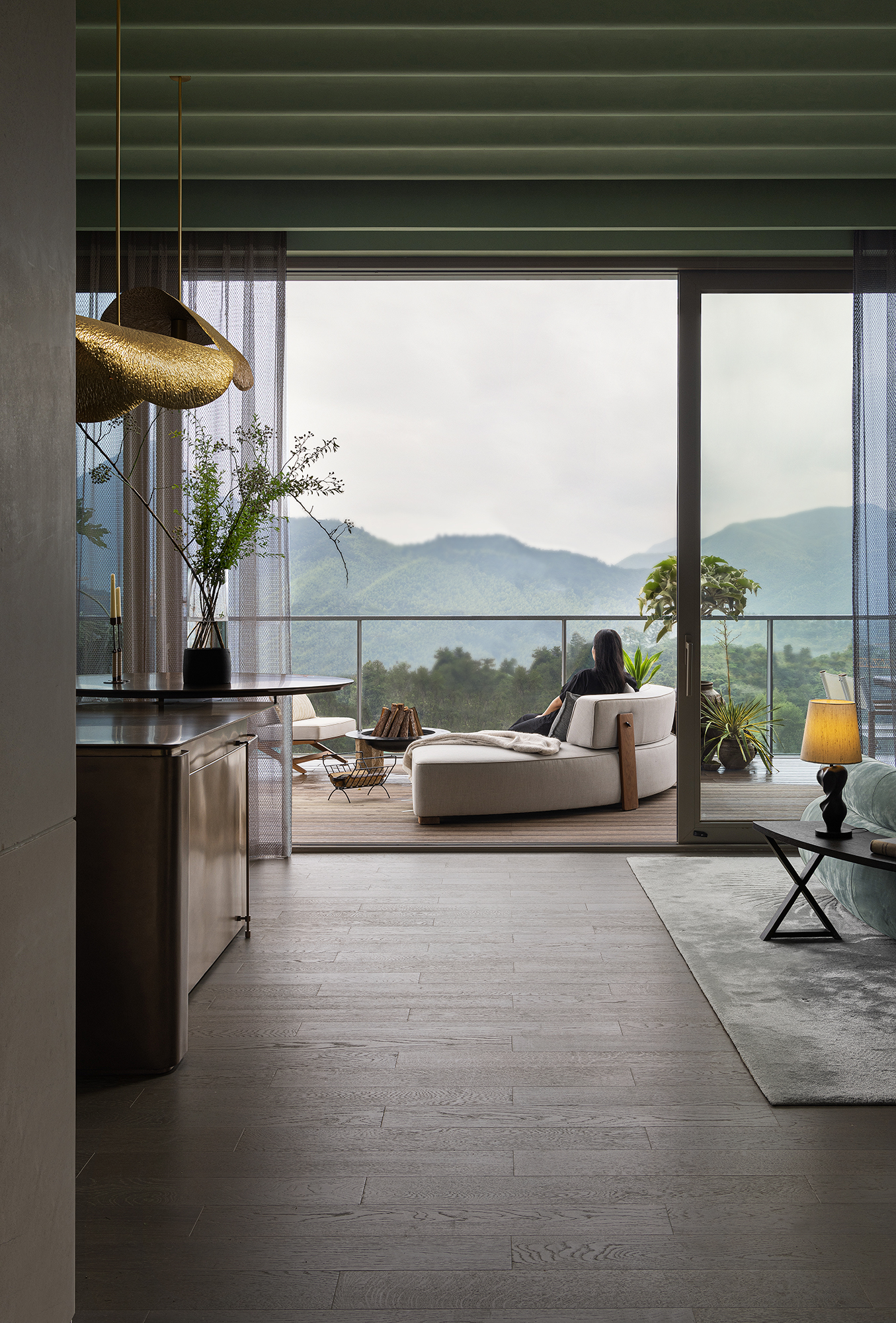空间布局:南陌高山碧,东方晓气青。青,生命之色,东方之色。若翠山叠嶂,若层云涌现,源远流长之中蕴含了东方独特的传统美学意蕴。只此一色,其意无穷尽。西边涧野,东边厅堂。可望远山一抹青黛,心中怡然。东方泛白,之后为青,从清微淡远逐渐至光芒四射,这便是每日天空中的第一抹色彩。将青在室内延展,仿若缔造一场东方美学与现代设计的碰撞。远,可与群山呼应,营造山居意远、放旷无涯的意境。近,可得“苔痕阶上绿,草色入帘青”的野趣。俯仰之间,悠然自得。安吉是竹的故乡,竹连着山,山连着竹。提出竹节的纹理和形态之美引入室内,契合的正是传统文人“不可居无竹”的山居调性。
