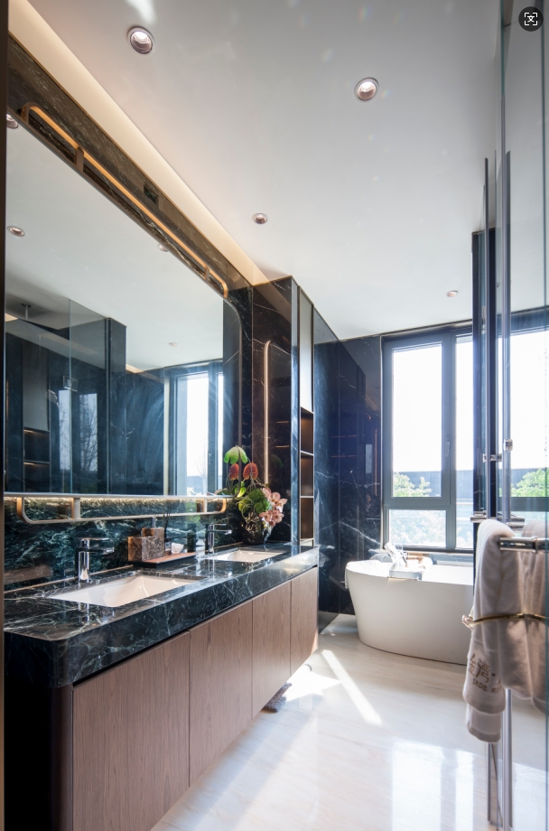 主卫的纹理与质感,尽显典雅与大方的气质。台盆等细节穿插了不同肌理的大理石,整体细节丰富,精致美观,卫浴间也带来极致的品质。
