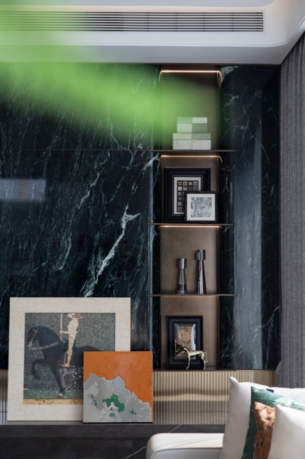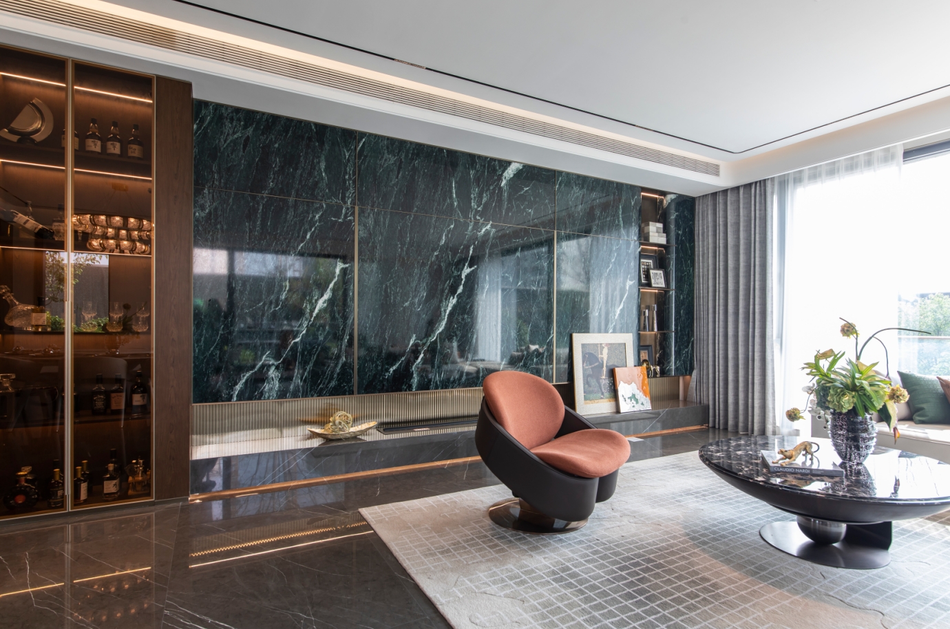 贴合设计风格和设计主题,主材选用普拉达绿石材、黑胡桃木饰面、米色壁布、米白色皮革硬包;既有大平层具有的奢华,又不失稳重;