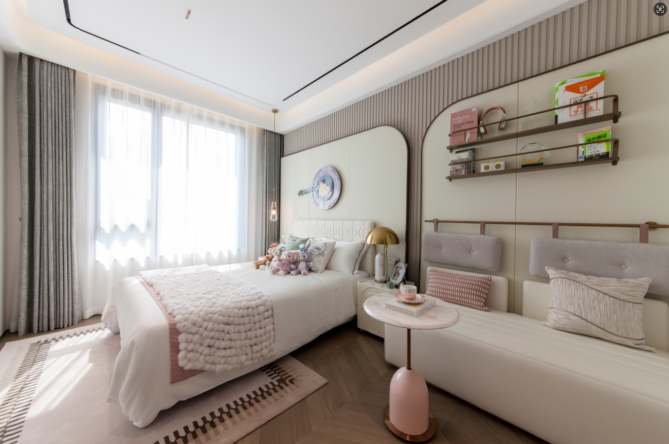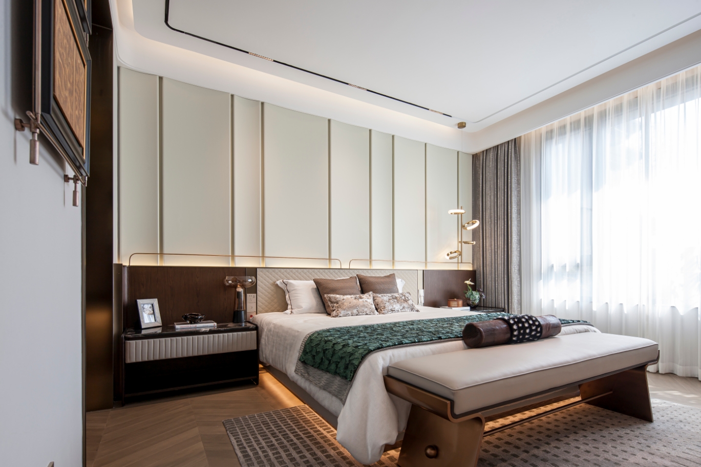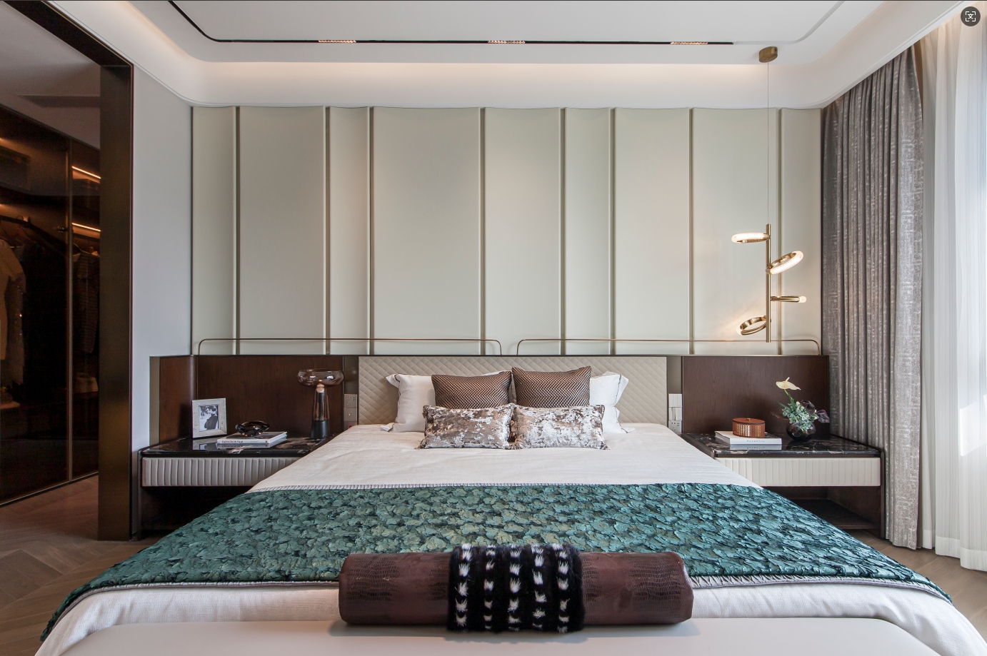 主卧套房尺寸为6.5m*6.1m,奢阔尺度,可营造一个极致享受的卧室。背景墙以围合式造型构成亲密的包裹感,为休憩空间创造细腻温和的氛围。