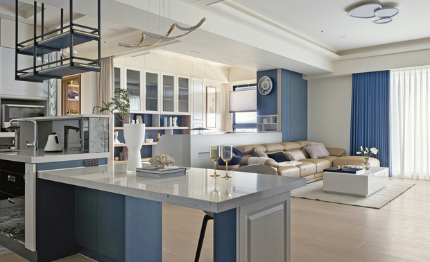 空间意境:原建商規劃的天花板高度較低,且多根大樑貫穿空間,對空間的開放性與舒適感造成一定影響,因此本案的設計重點之一便是有效地弱化樑柱的存在感。設計師透過流暢的曲線和高低變化,不僅化解了空間的結構巧妙地將樑柱隱藏於設計之中,還增加了空間的柔和感與視覺層次,使樑柱與整體空間融為一體,從而達到視覺上的和諧與統一。