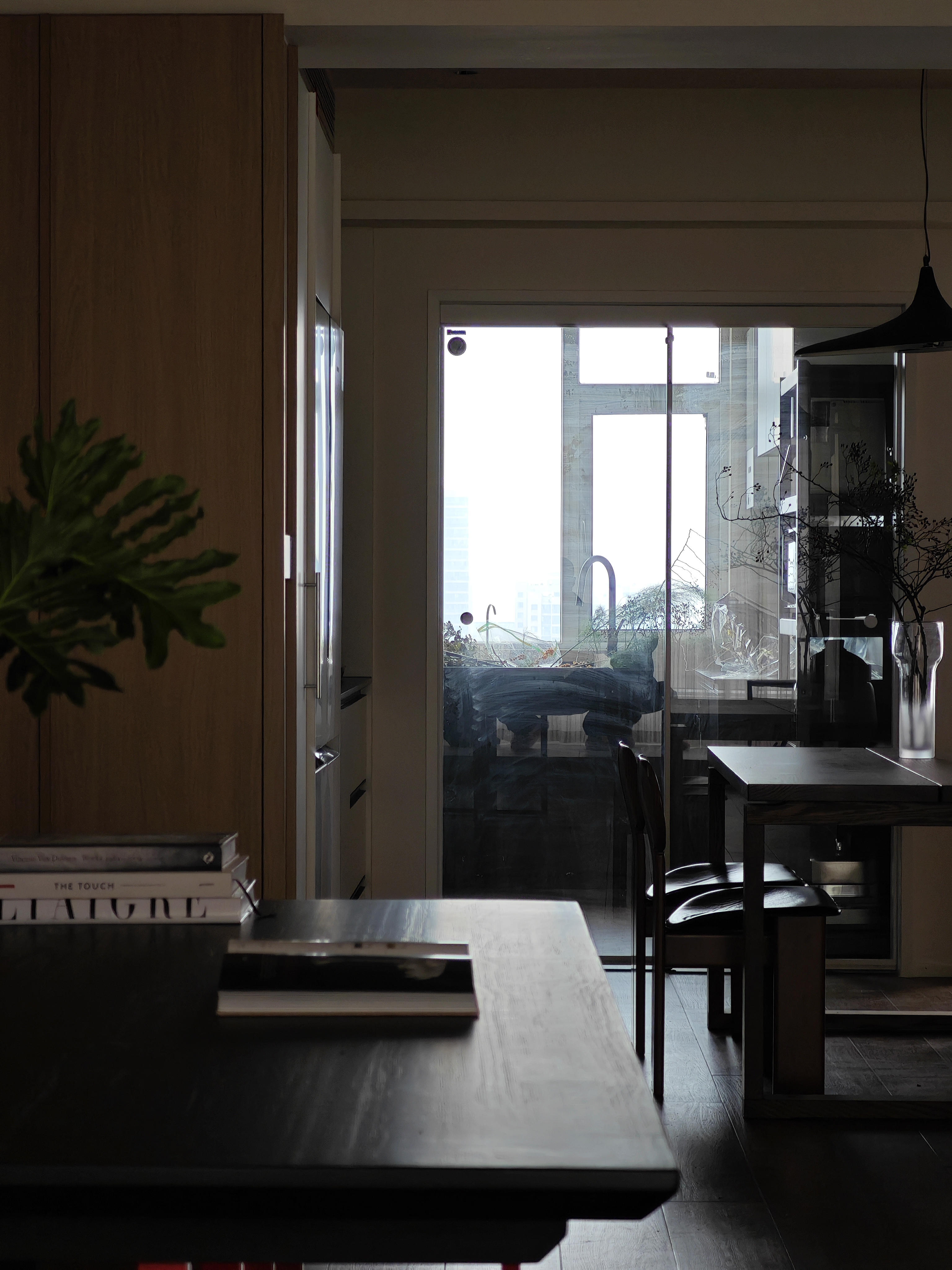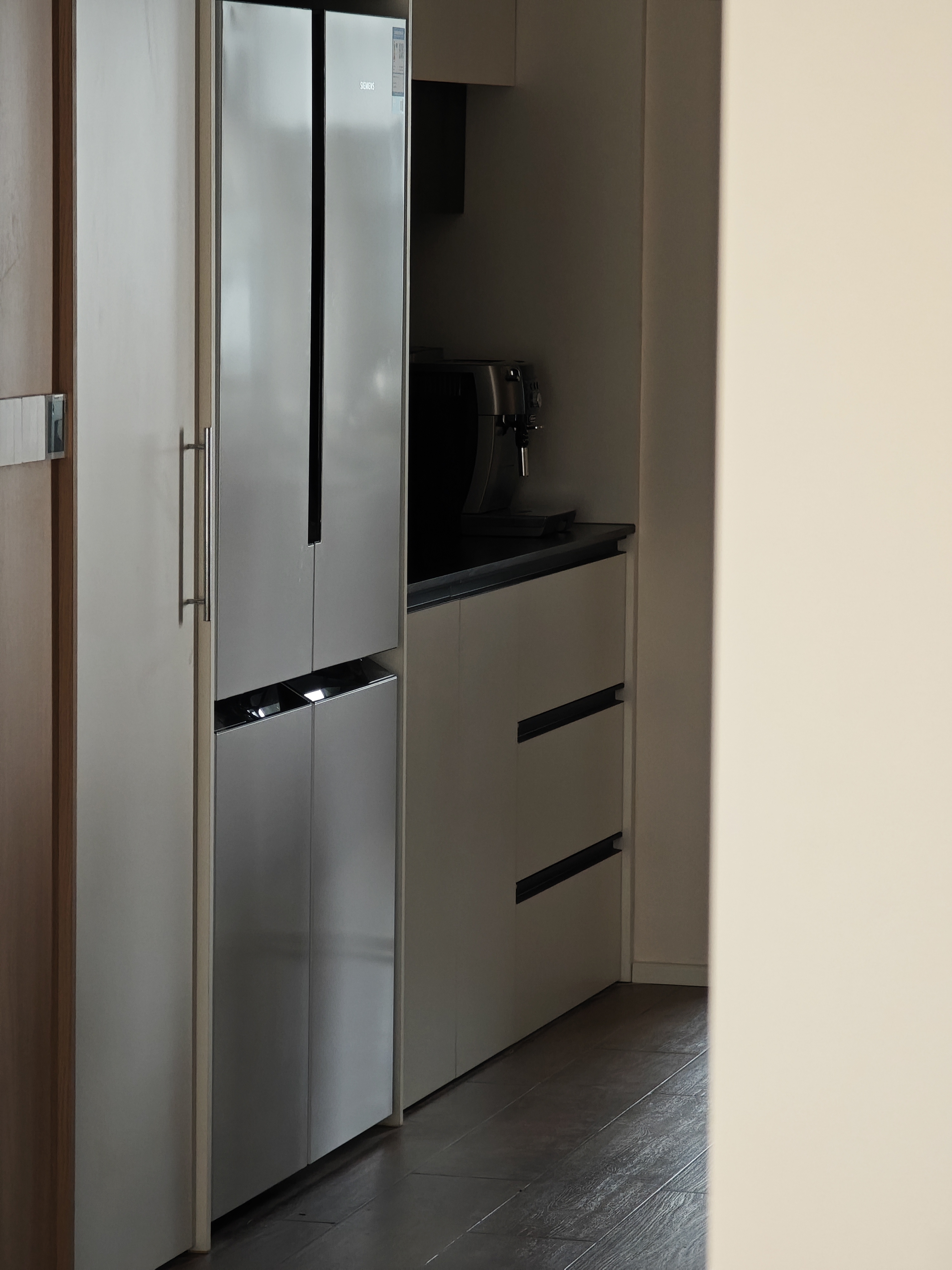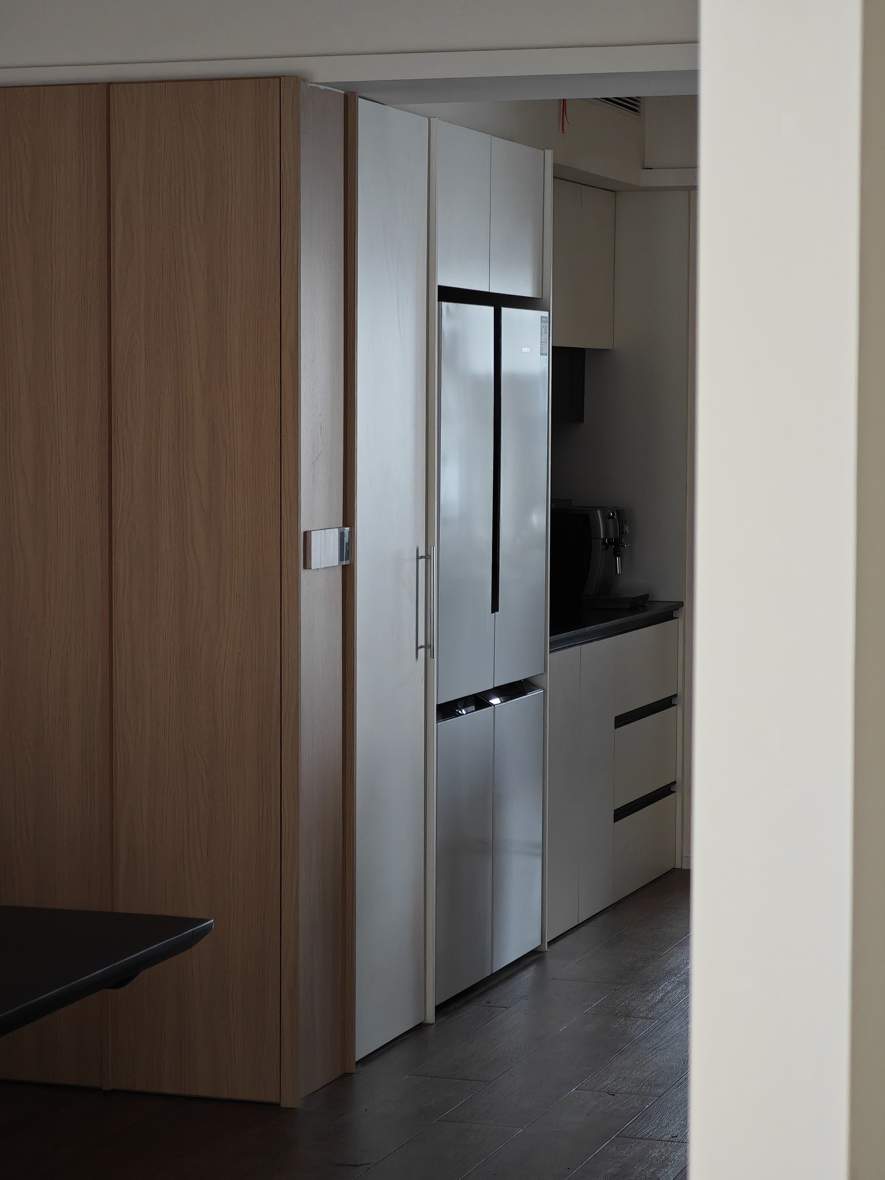 空间运用了多种材质,形成丰富的质感对比。木质推拉门带来自然的温暖感,不锈钢的冰箱则体现出冷硬的现代感,地面的深色地板沉稳而大气,厨房区域的浅色柜体则显得干净整洁。 能分区明确。从图中可以看到,左侧的木质推拉门可能是通往另一个房间或储物空间,既节省空间又具有美观性。右侧的厨房区域,冰箱、橱柜等电器和家具摆放整齐,形成一个紧凑而高效的工作区。