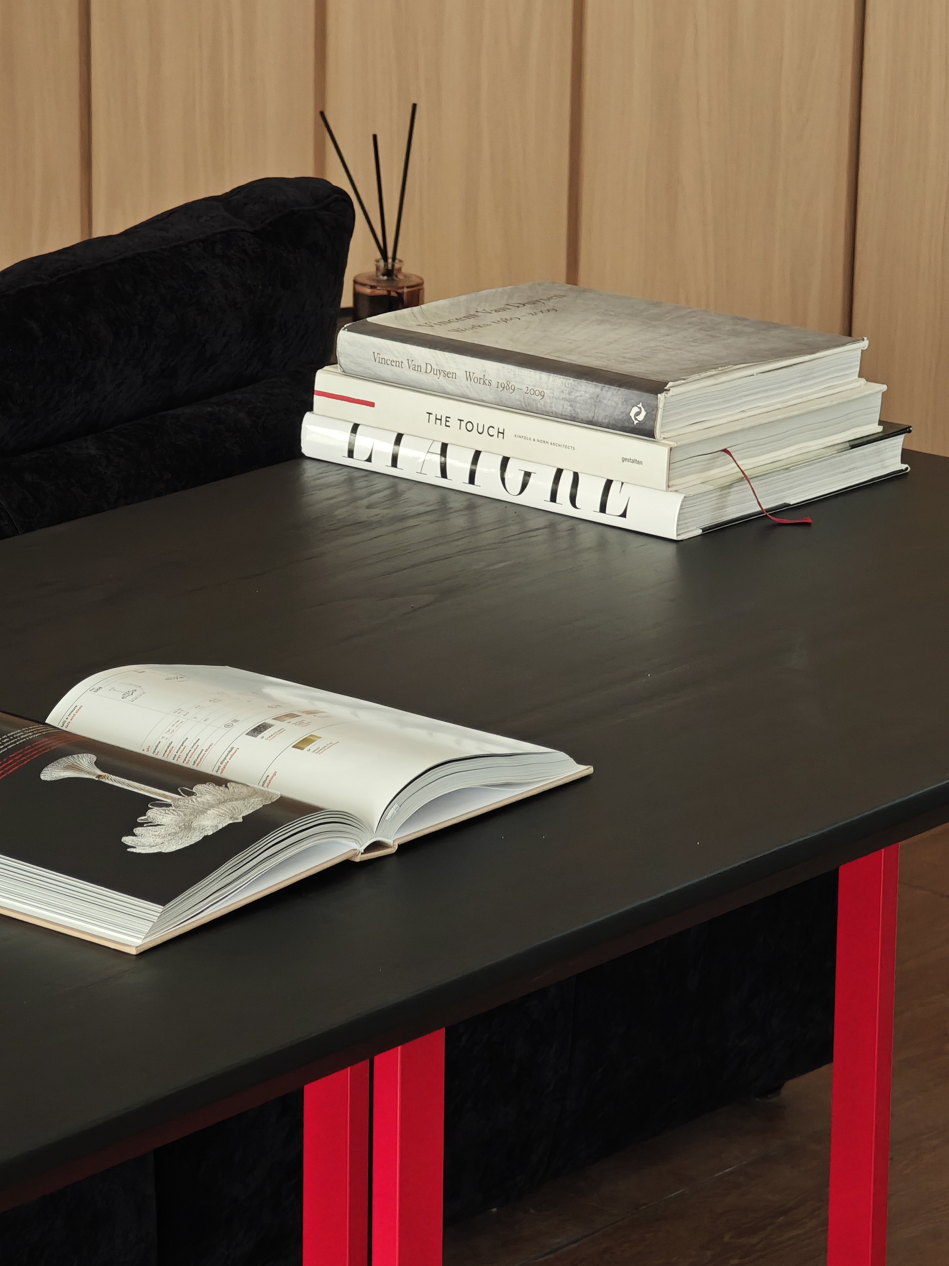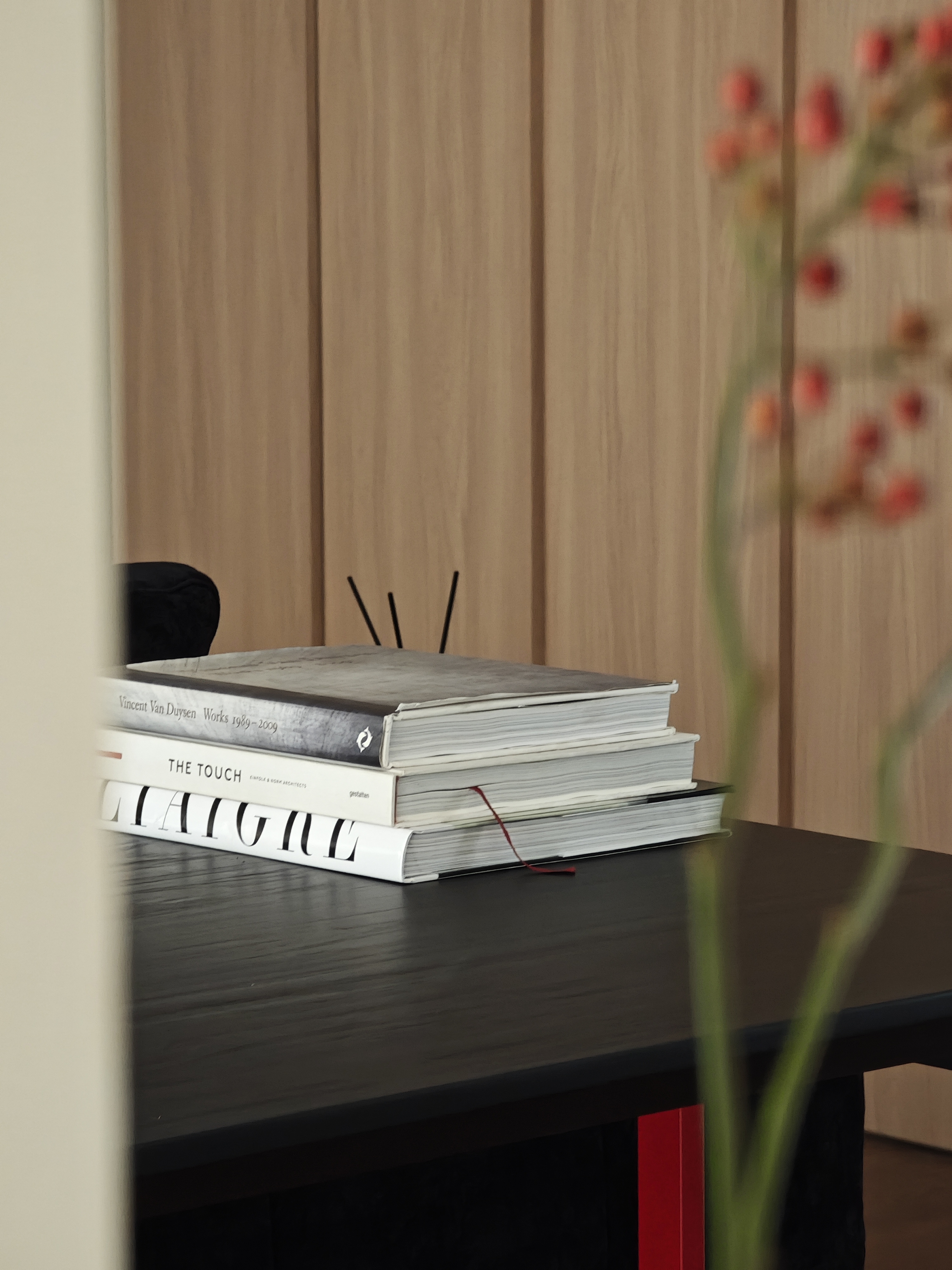 黑色的家具不仅显得沉稳大气,还与周围的环境形成了鲜明的对比,突出了空间的焦点。 书籍旁边,有几根黑色的装饰棒插在一个白色的容器中,这种简约的装饰元素增加了空间的现代感。