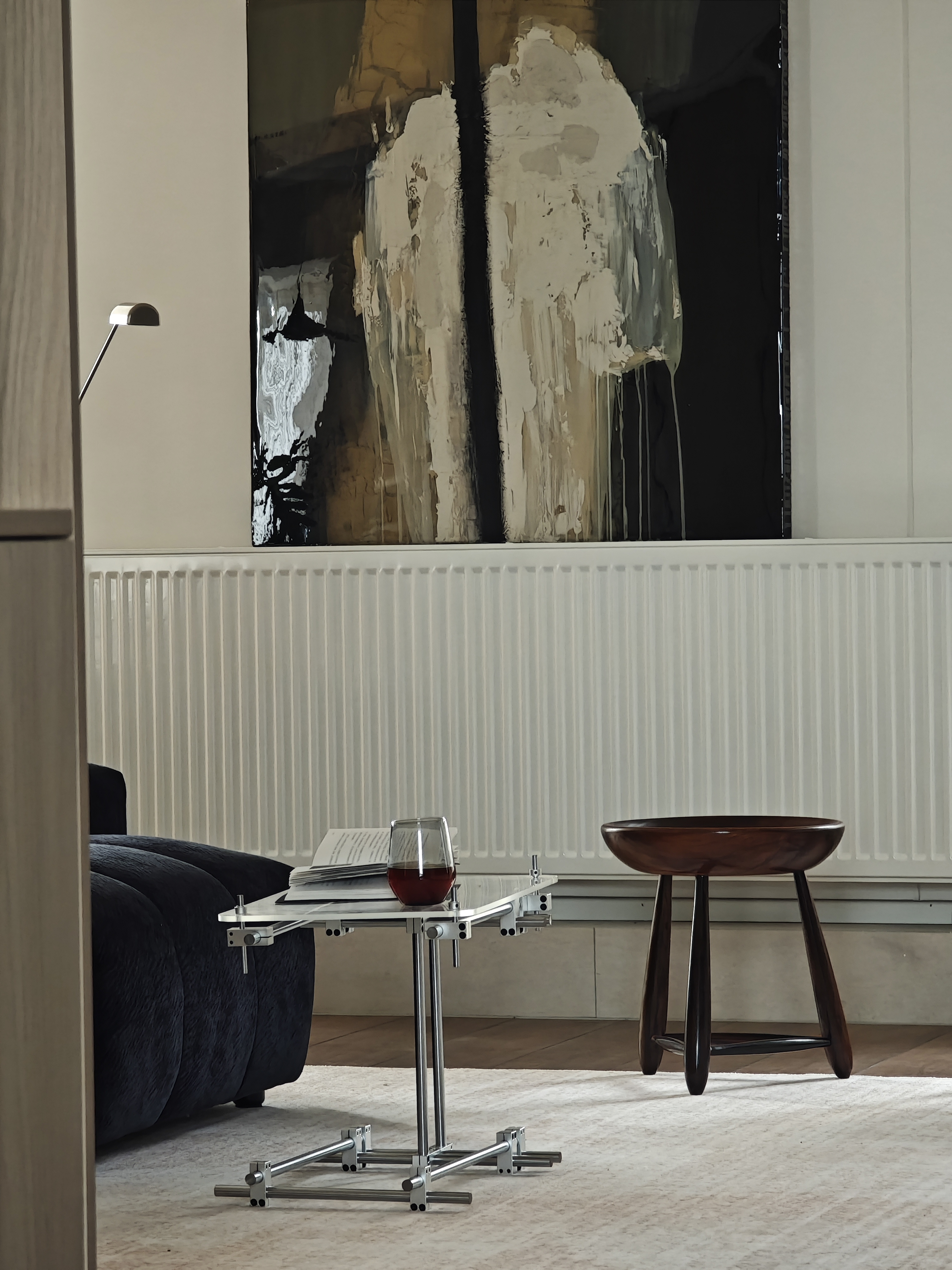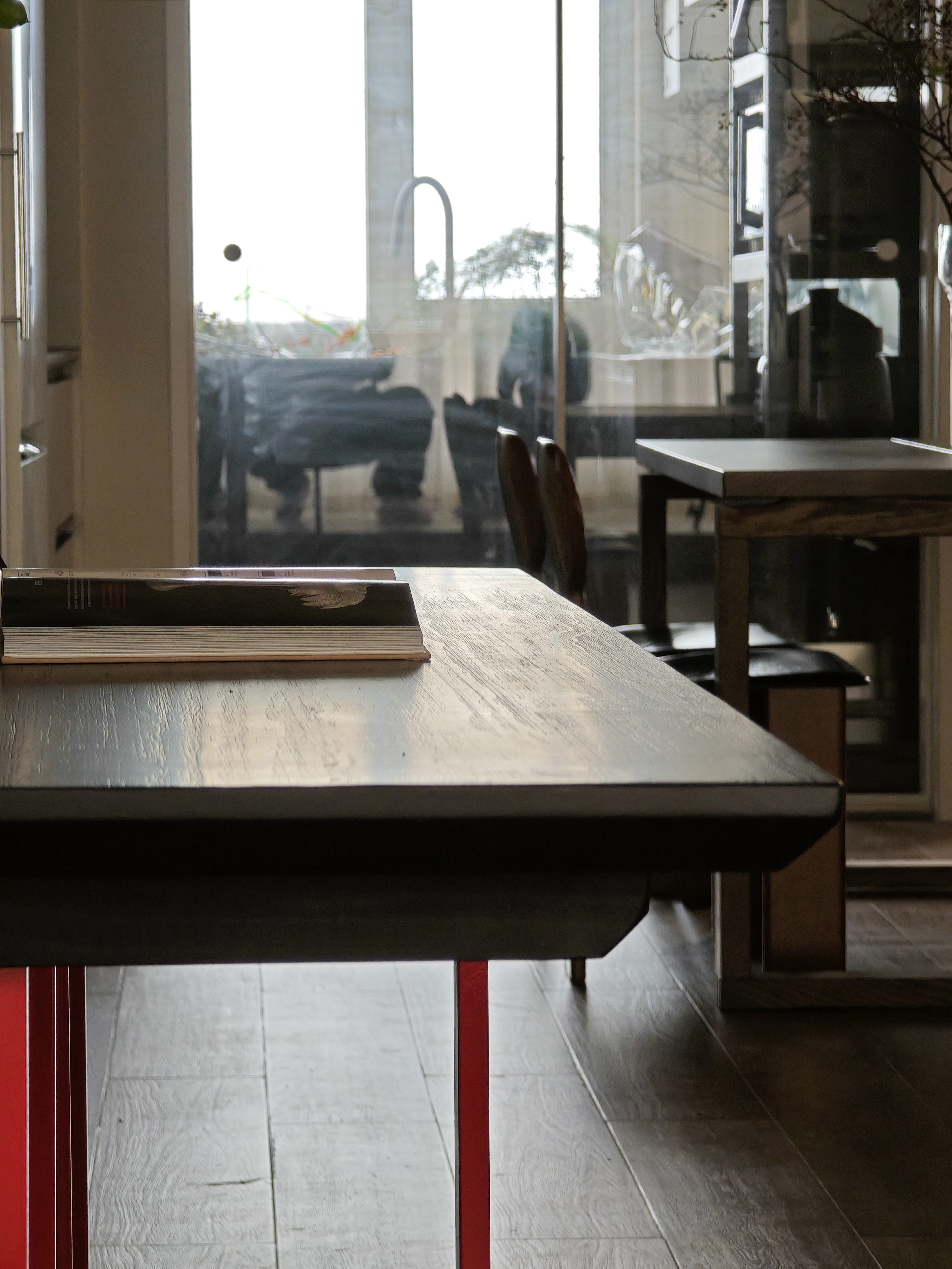 空间意境:首先,红色桌腿和白色墙面的组合打破了传统家具设计中中性色的单调性,给人一种视觉上的冲击和艺术感。这种设计选择体现了当代艺术中对于色彩和视觉效果的重视。