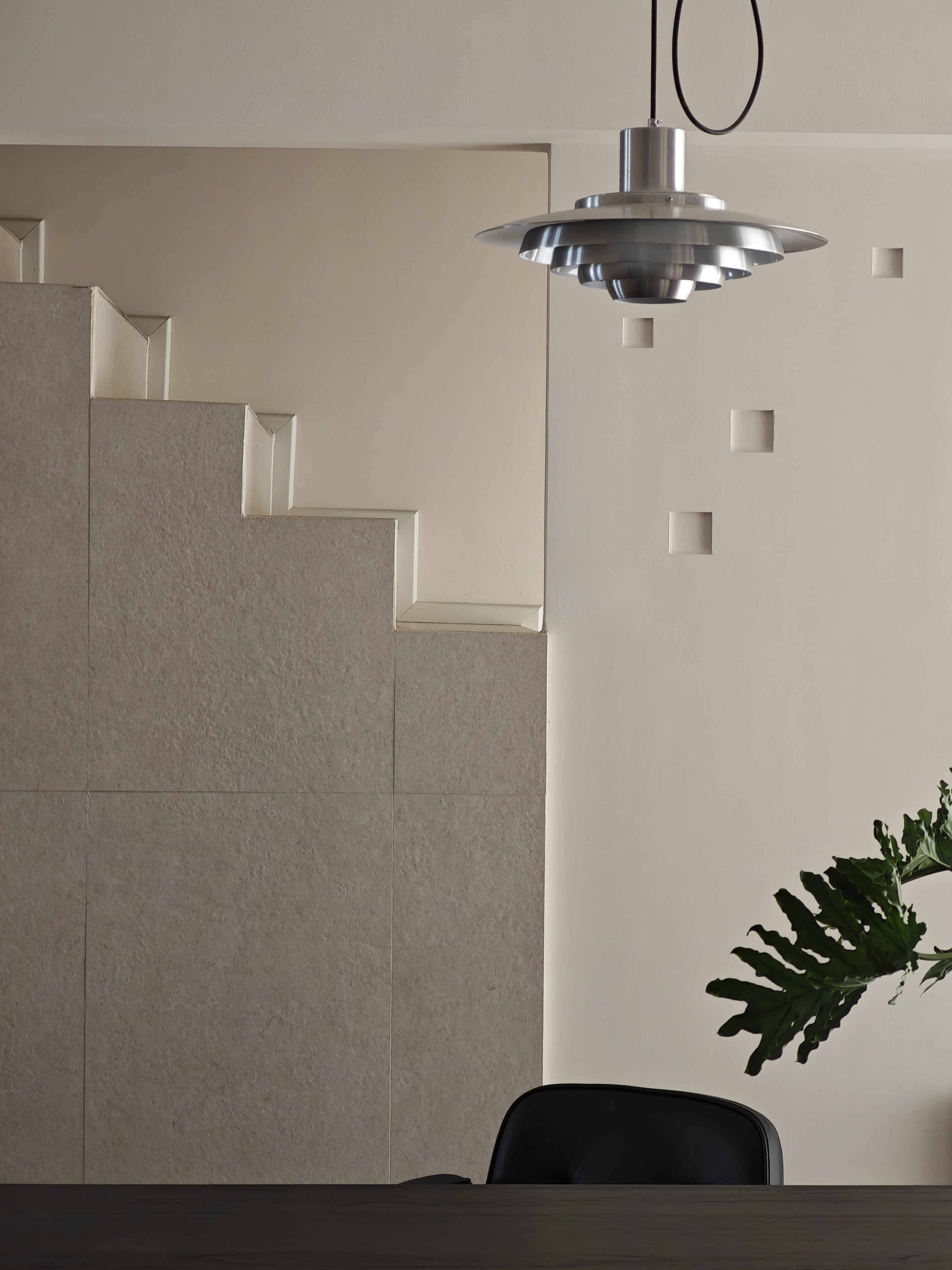 空间动线流畅,从长桌到楼梯的通道宽敞,方便人员走动。家具的摆放考虑到了日常活动的便利性,确保在空间内活动自如。背景中可以看到一个楼梯,楼梯的设计简洁,台阶整齐,旁边的墙面有规则排列的方形镂空,增加了空间的层次感和现代感。