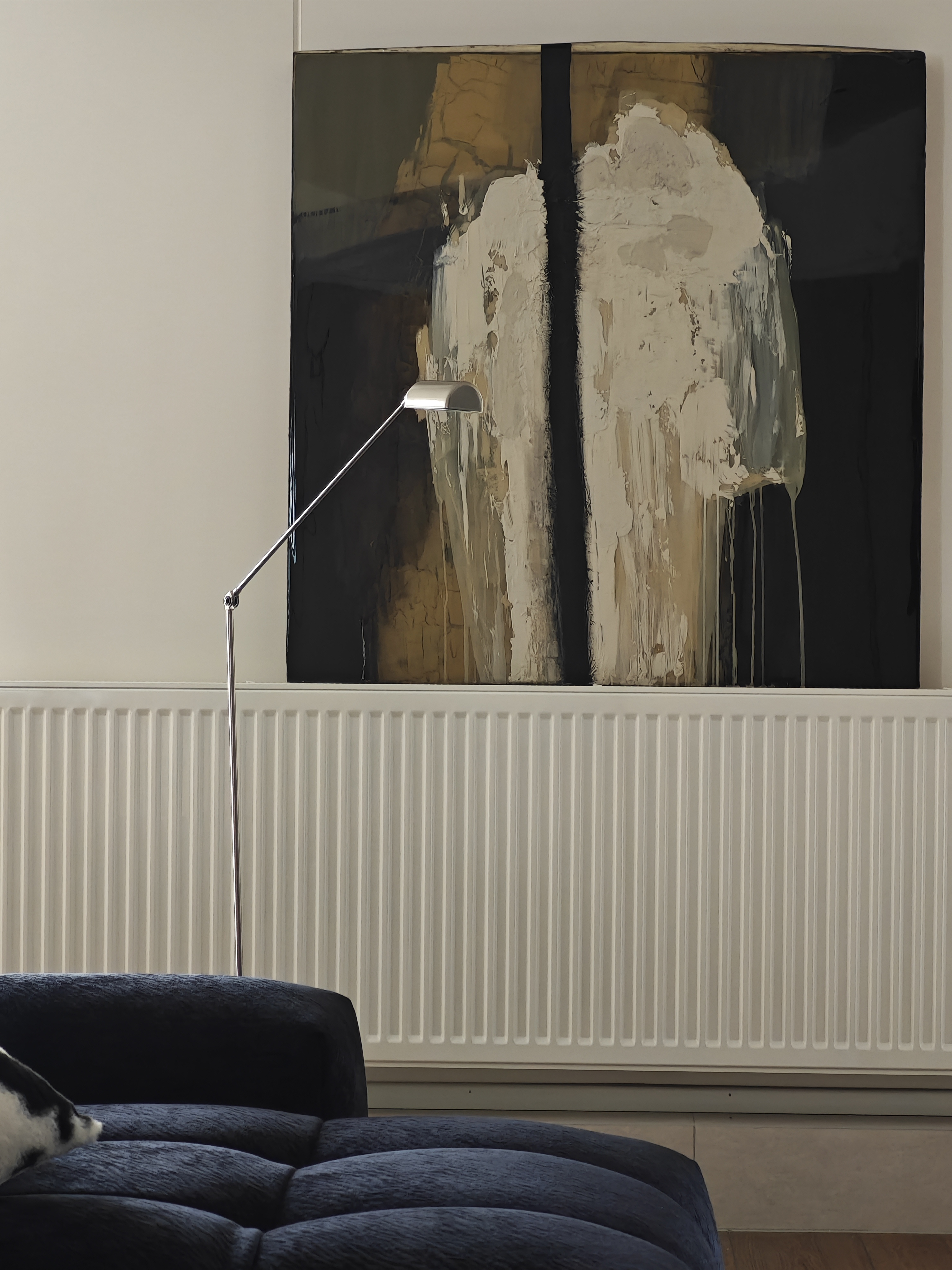 空间采用了开放式布局,显得宽敞且通透。家具的摆放简洁有序,避免了空间的拥挤感。电热片位于左侧墙壁,既不影响整体美观,又能有效地发挥其功能。