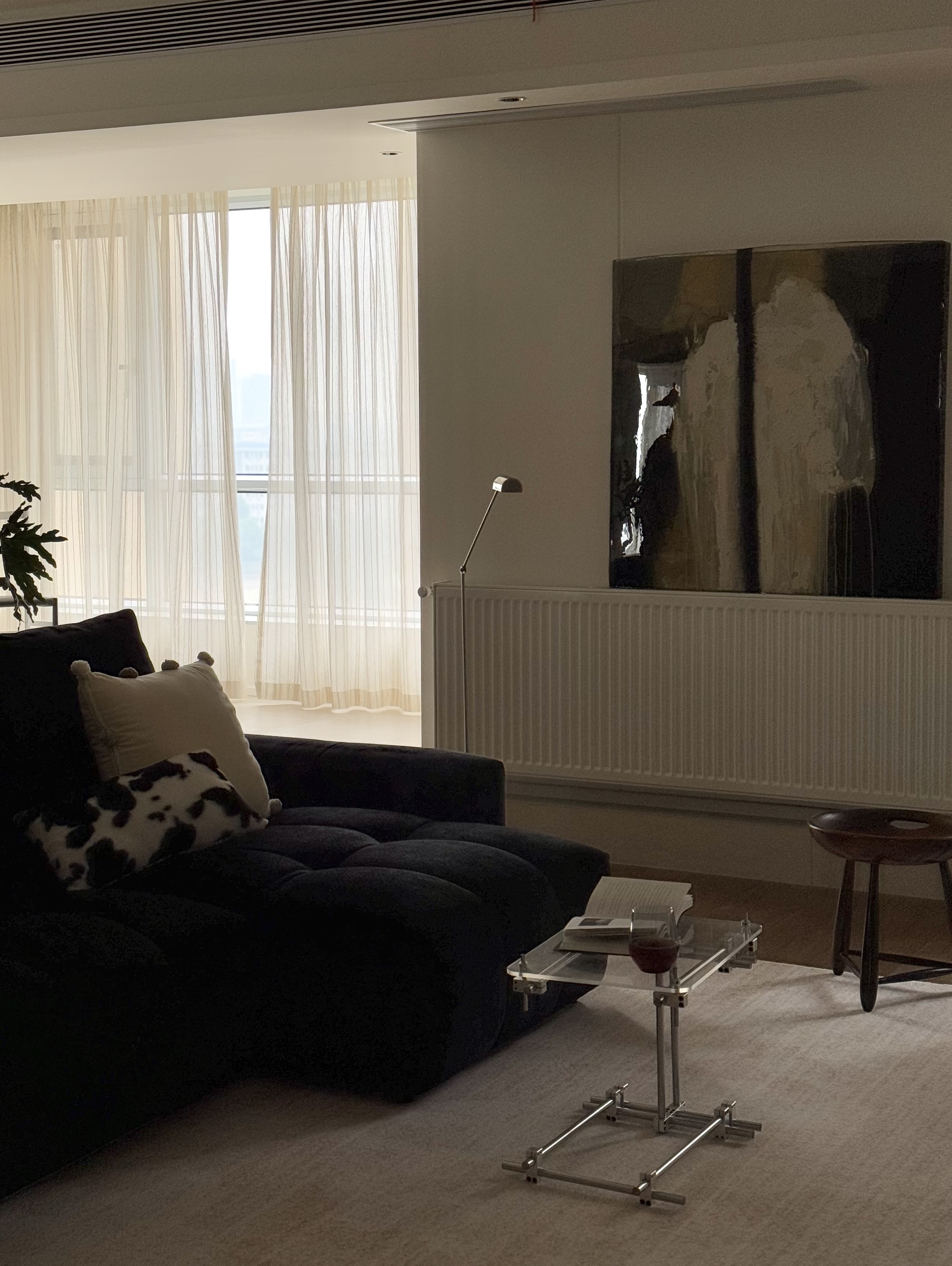纱帘的柔和质感与现代风格的硬朗线条形成对比,增添了空间的温馨感。