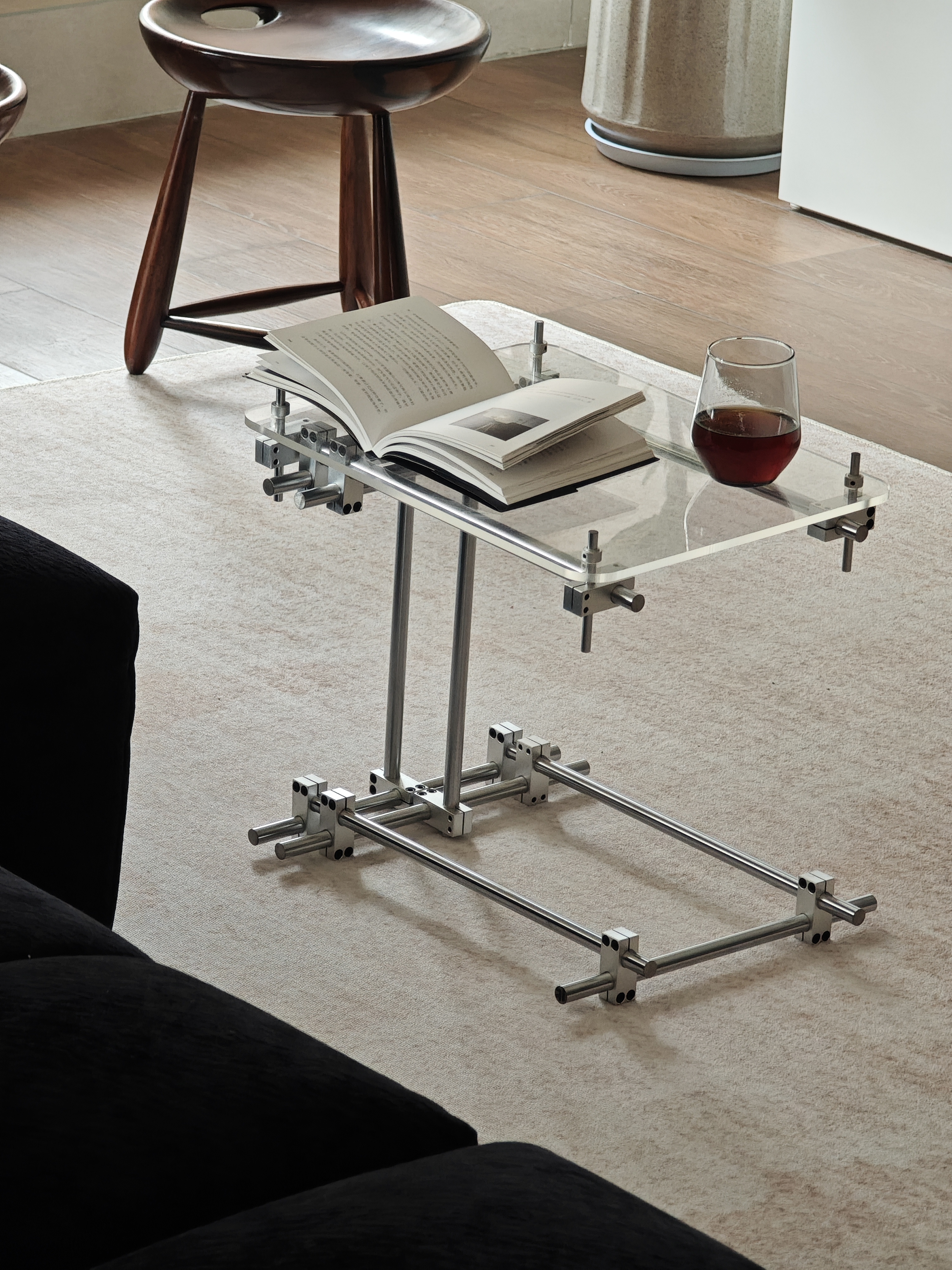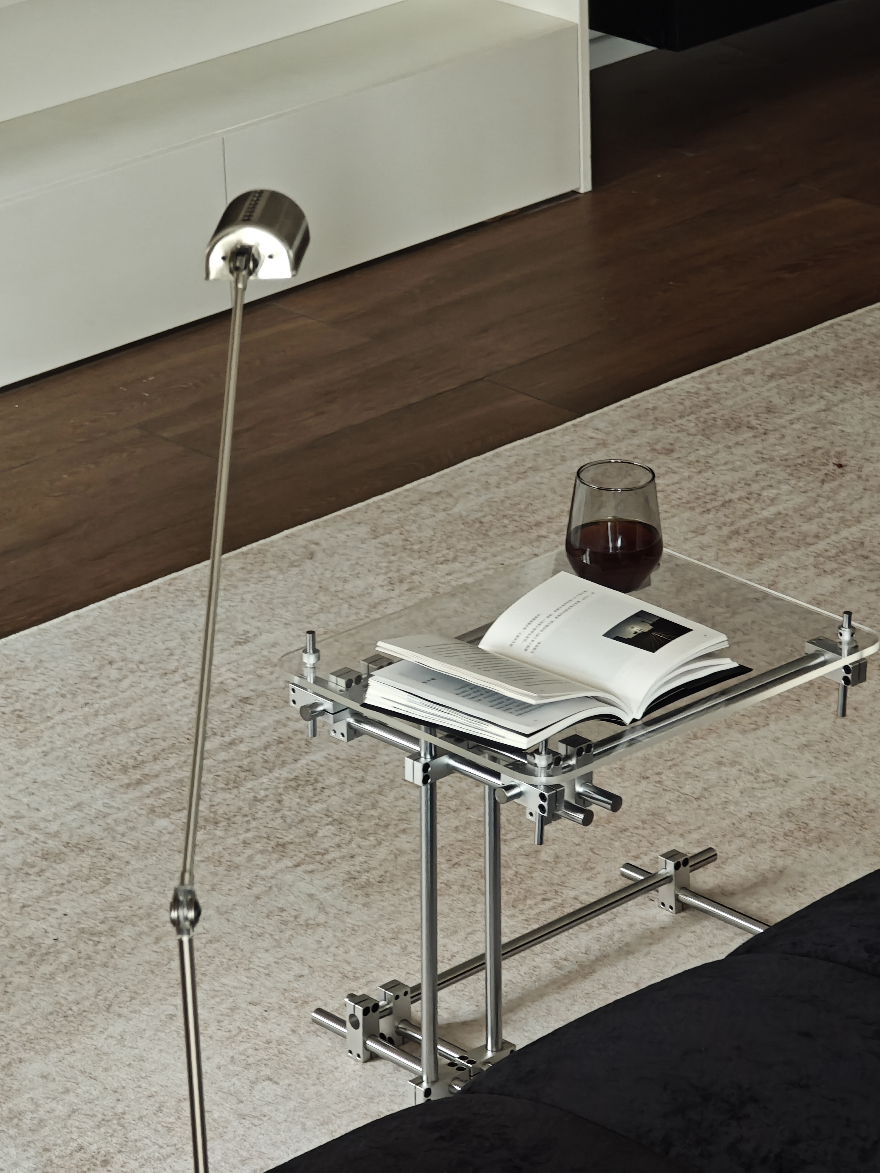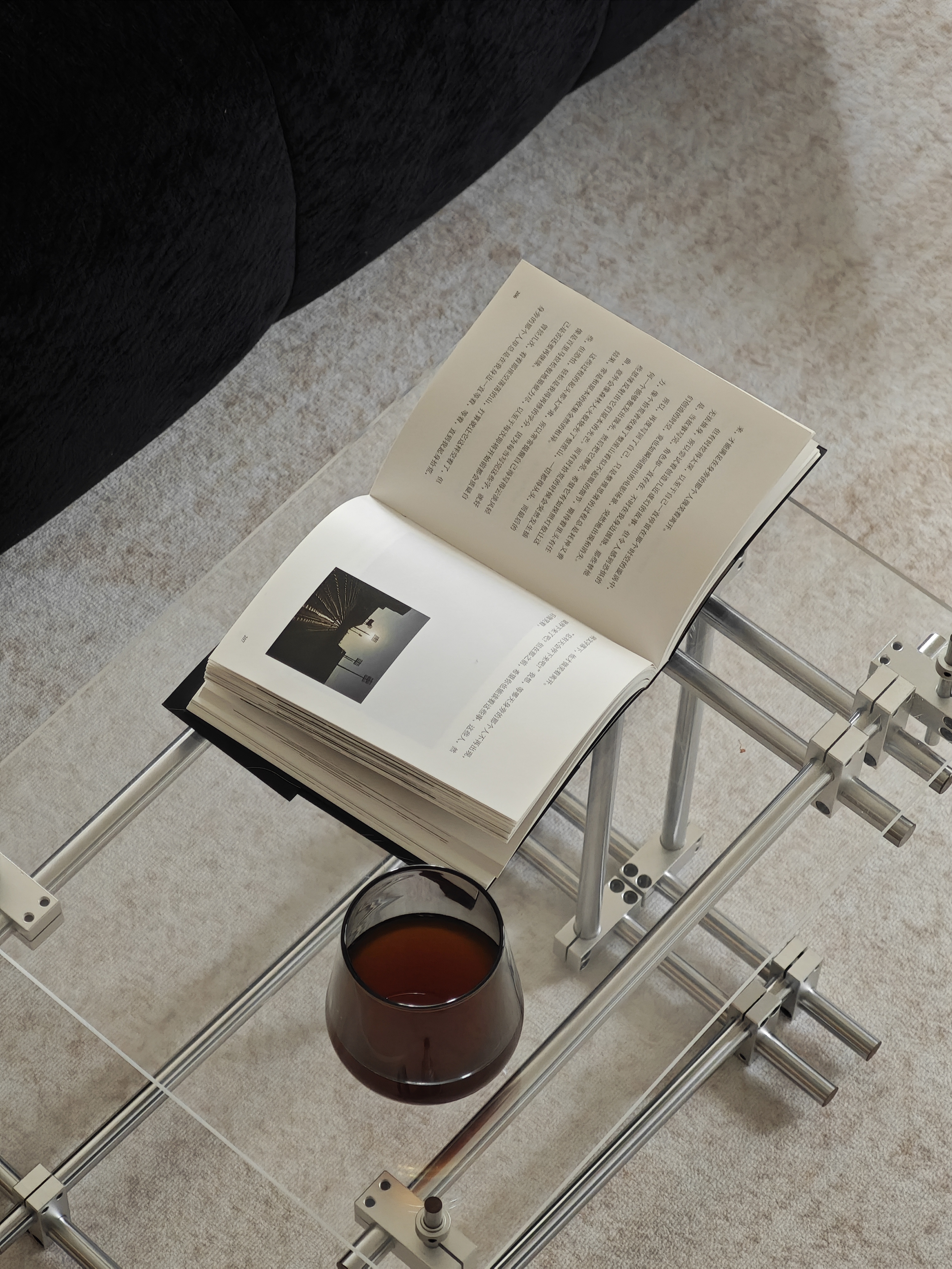 茶几的设计极具现代感,金属支架结构使其显得轻盈且时尚。