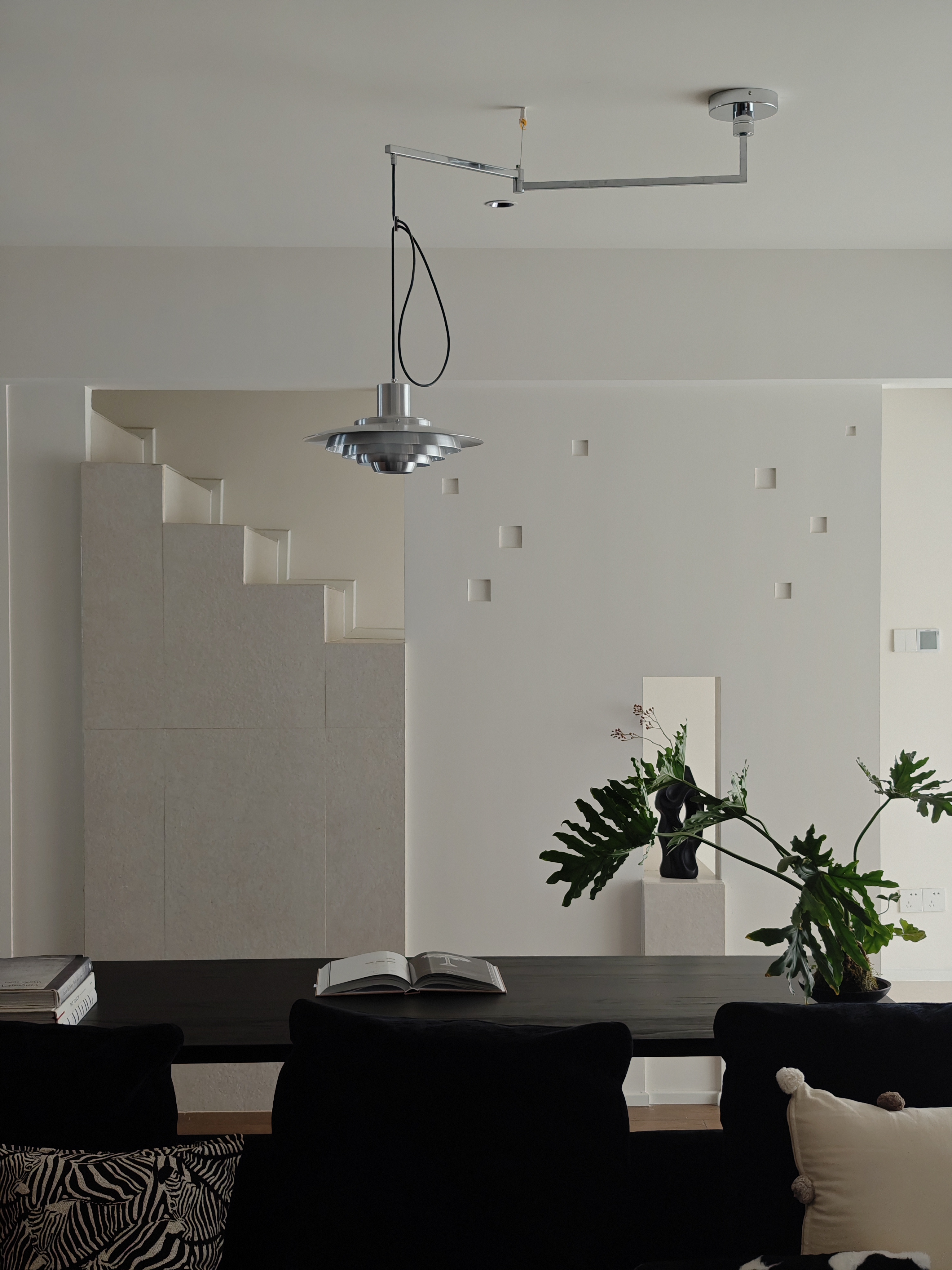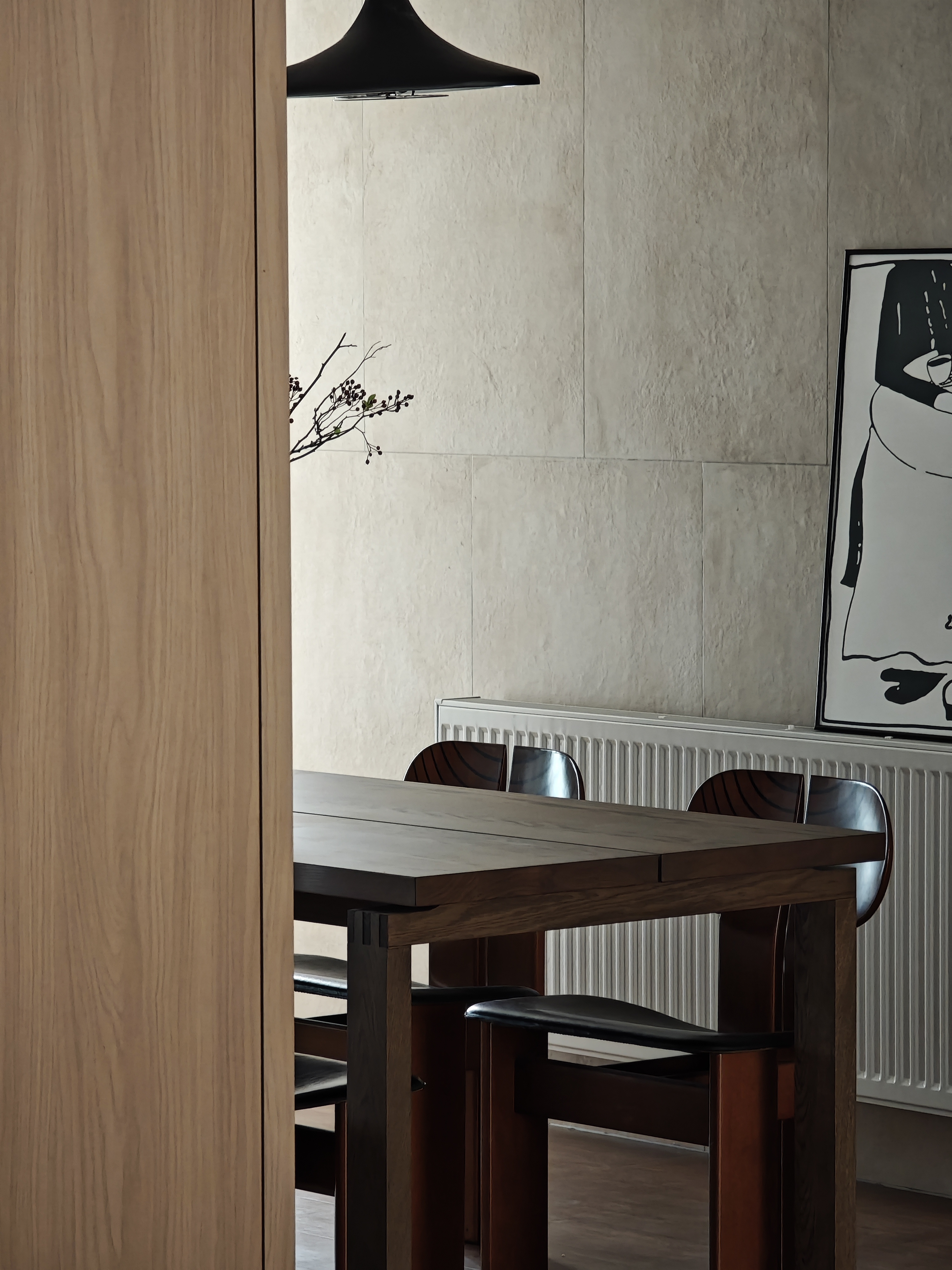 餐厅的布局简洁明了,餐桌椅位于画面的中央位置,形成视觉焦点。餐桌椅的摆放整齐,留有足够的活动空间,方便用餐者进出。背景墙采用了浅色的瓷砖或石材,纹理自然,给人一种干净、简约的感觉。墙面上挂有一幅黑白艺术画,画中的抽象图案为空间增添了一份艺术气息。餐厅上方悬挂着一盏黑色的吊灯,其独特的锥形设计与整体现代风格相呼应,提供了集中的照明效果,同时也成为空间中的一个视觉亮点。