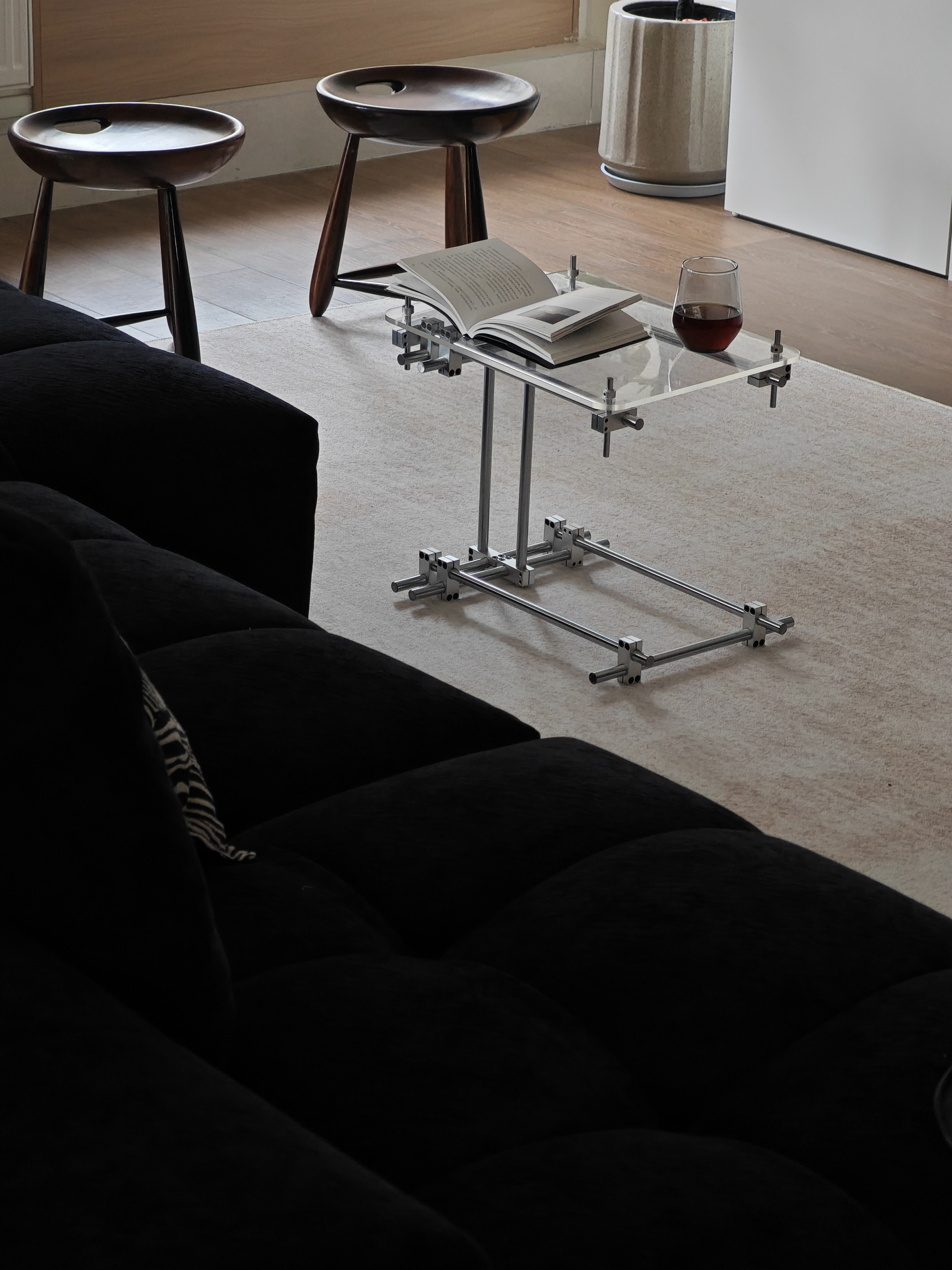 这个角落的布局简洁明了,以功能性为导向。一张透明玻璃茶几位于画面的中央偏右位置,成为视觉焦点