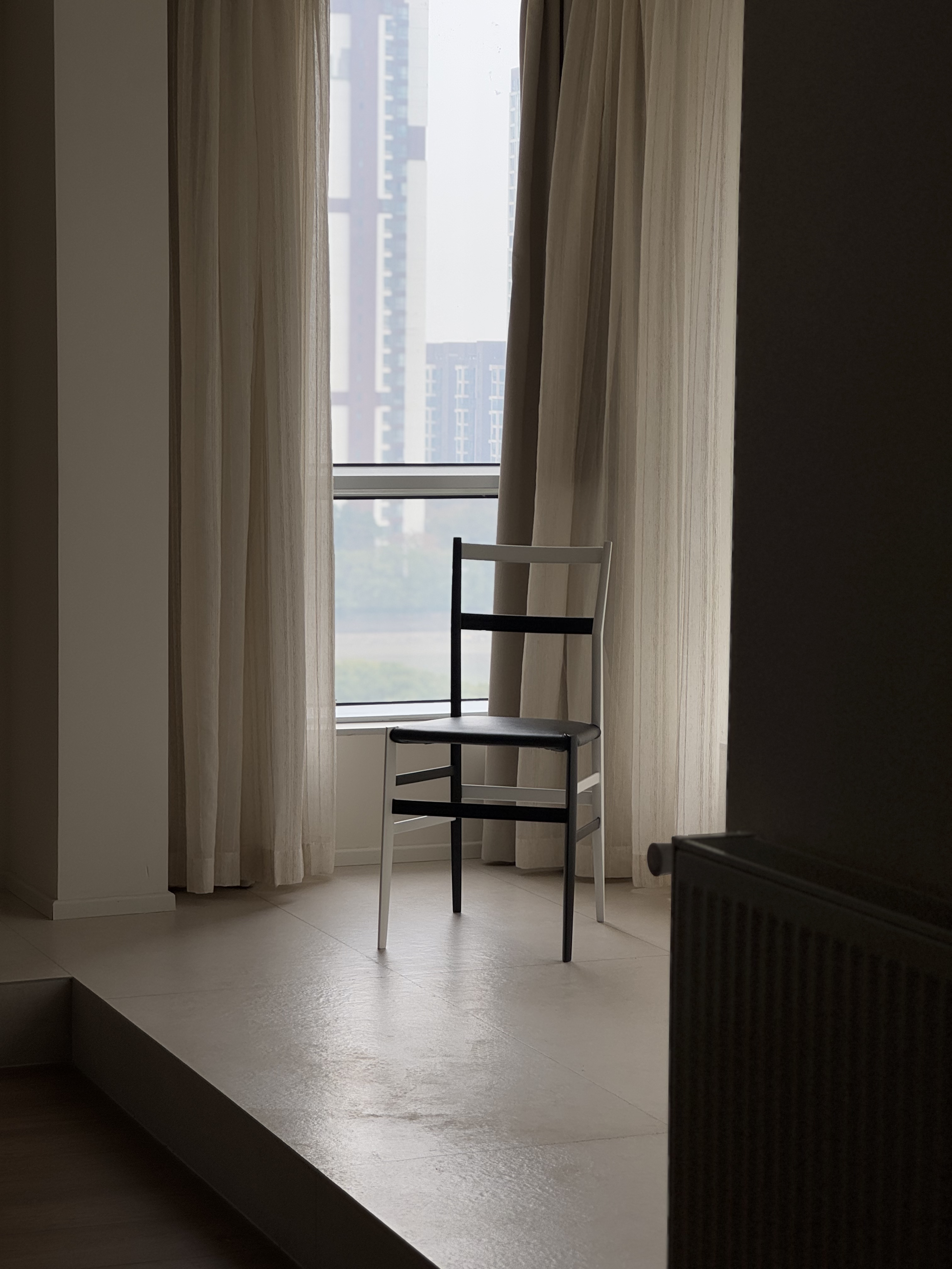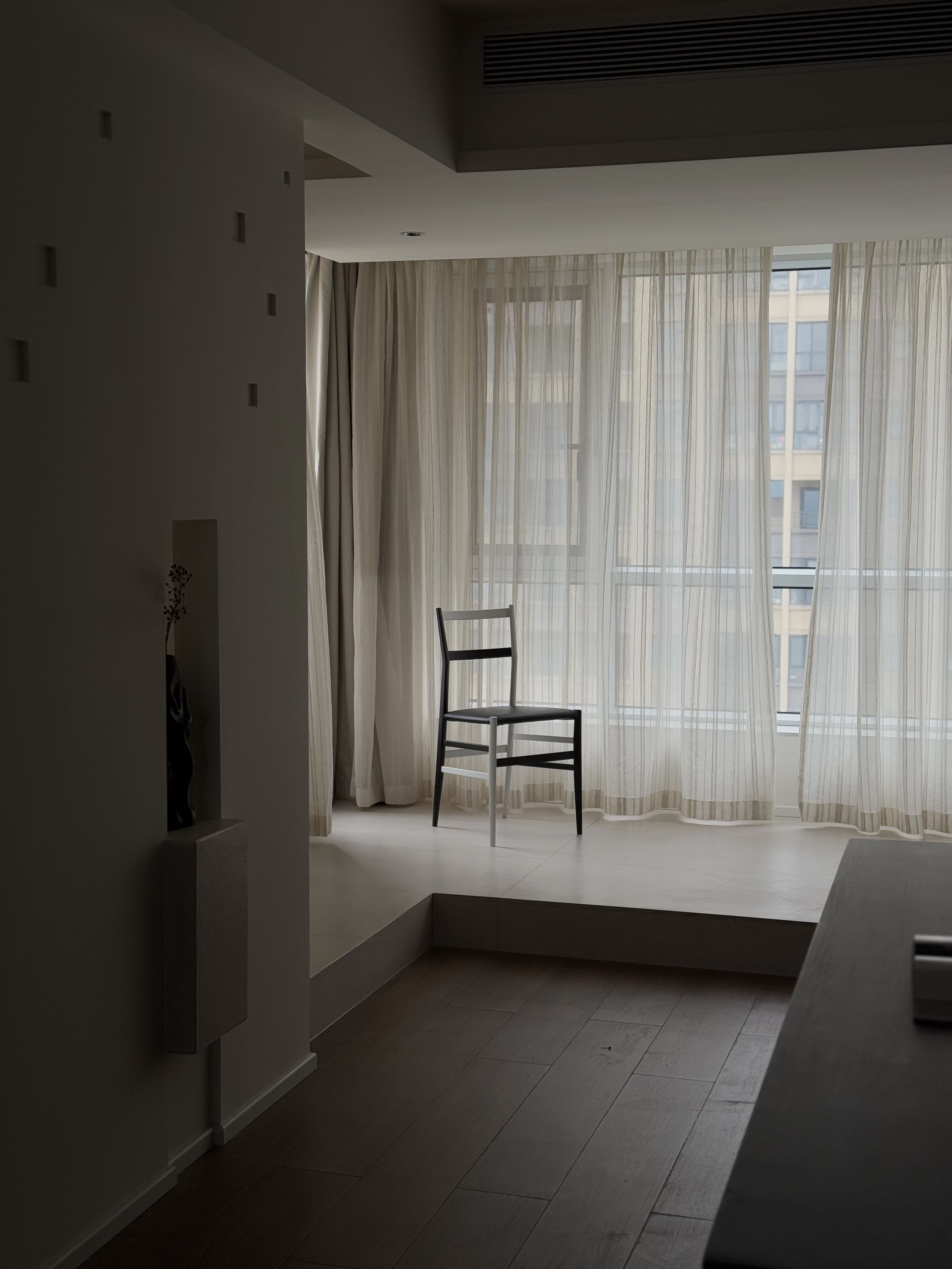 空间布局简洁明了,功能分区清晰。从图中可以看到,靠窗的位置有一个抬高的地台,地台上放置了一把设计简约的椅子,形成了一个独立的休闲或阅读区域。
