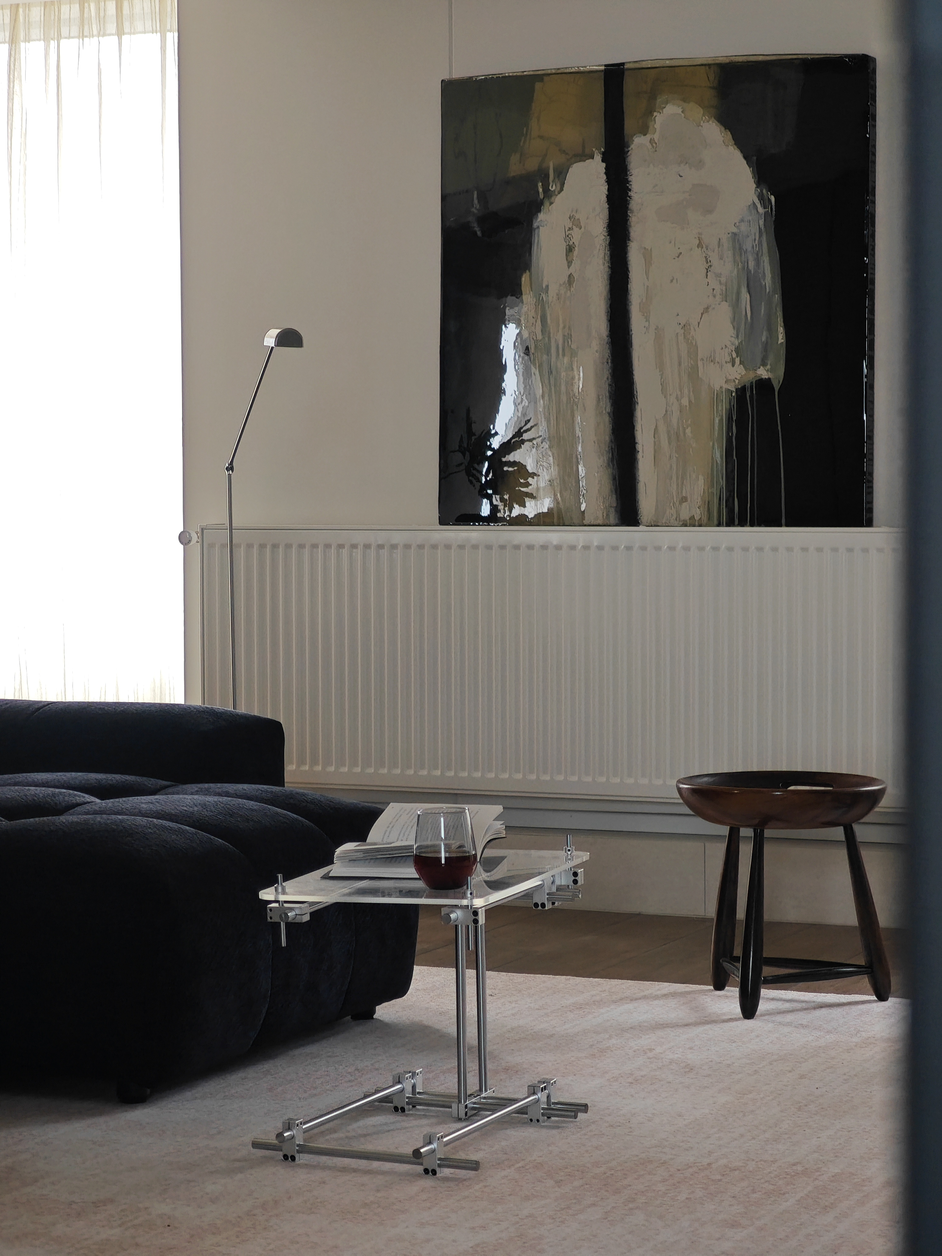 明的茶几和灰色的地毯构成了主要色调。茶几上的红酒和书籍封面的颜色为空间增添了一些点缀色,使整个角落显得更加生动。