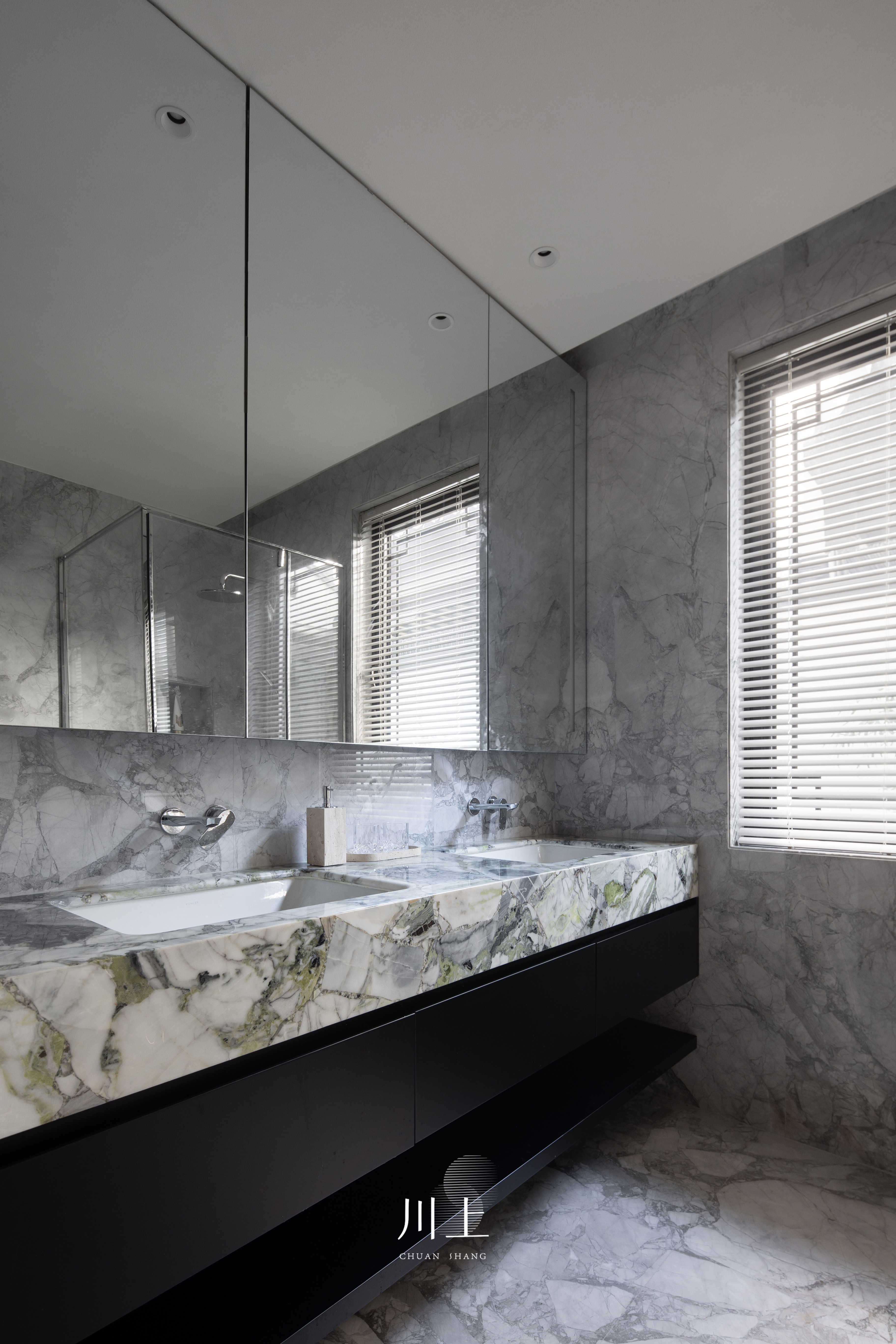 空间布局:入户门厅,一整块的大理石墙静中生趣、自然天成,以时间酿造纹理。经典的黑与白,演绎无声的奢华。石材、格栅、影木......不同的材质、适当的比例,将视觉提升至最佳状态,主家高雅的品味展露无遗。通透大扇的落地窗,好似镶嵌在墙上的一幅画,无须赘笔,自有天然去雕饰。朝夕晨昏,风雪雨霁,四季的流动之美尽数收于眼底,消弭着室内外的空间界限。