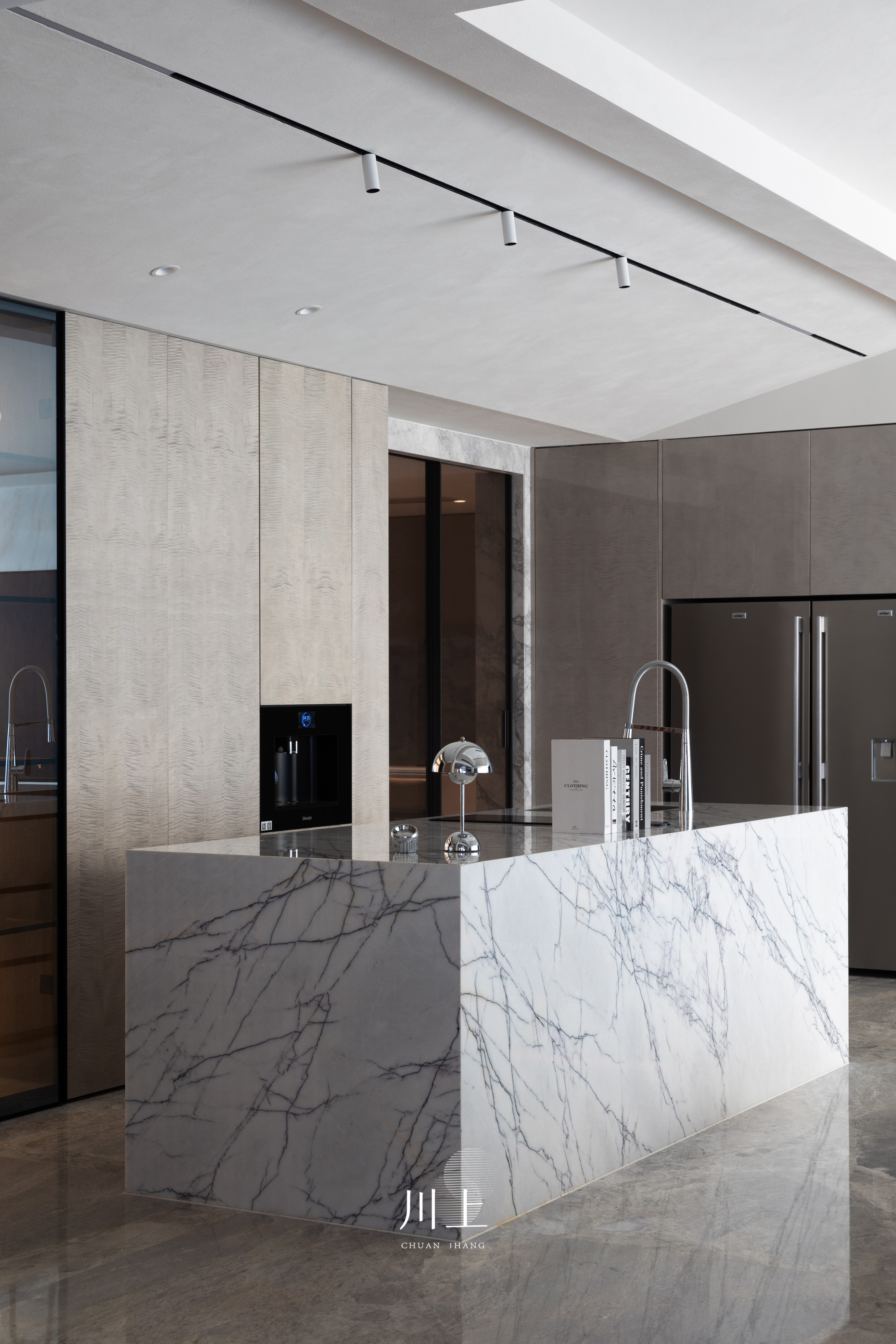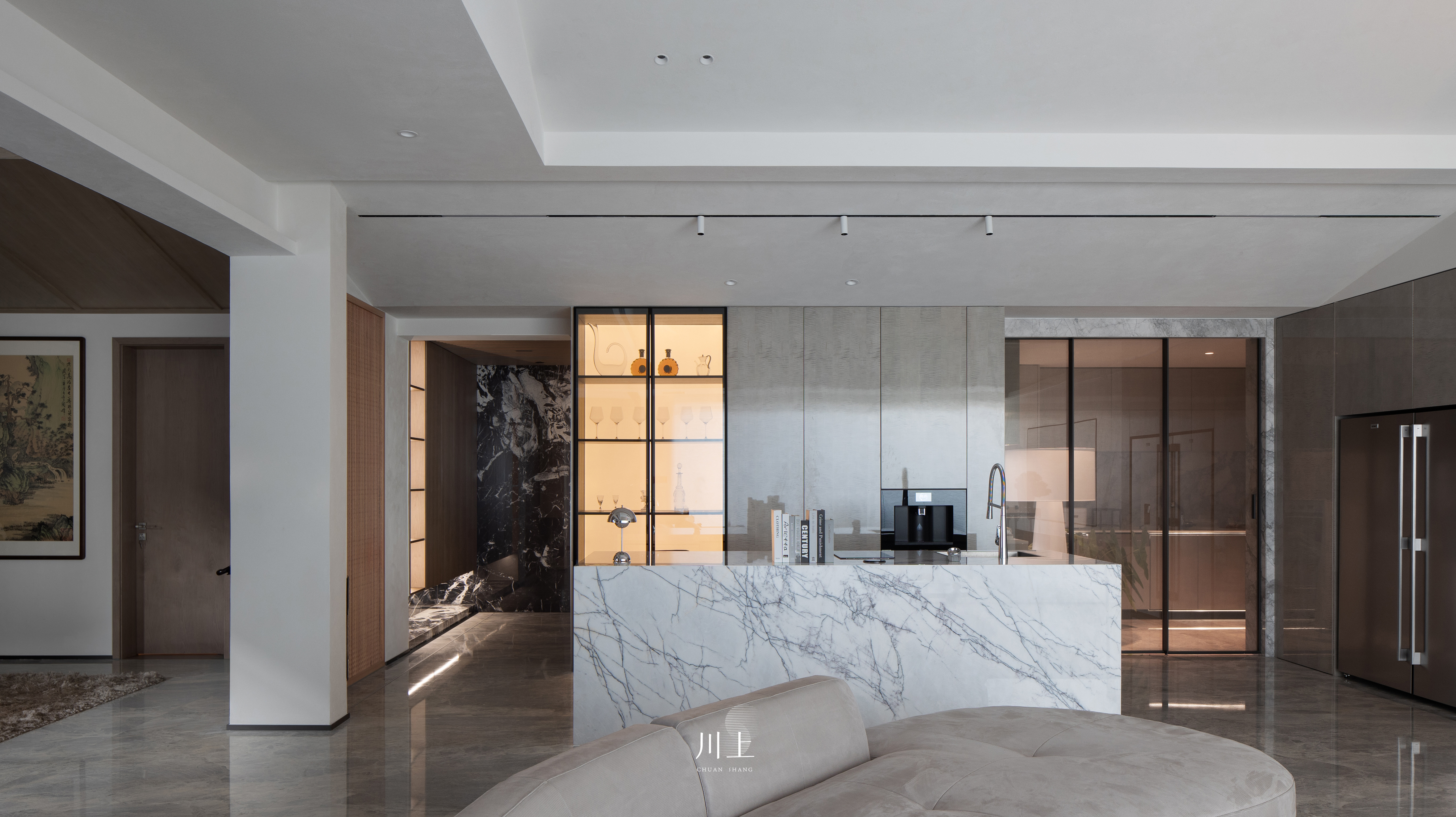 设计选材:大理石、奢皮、影木、金属、艺术漆、金砖,意式轻奢的质感,与悠长的中式气韵相互交织,形成独属此间的设计语汇,展现出别具一格的魅力。
