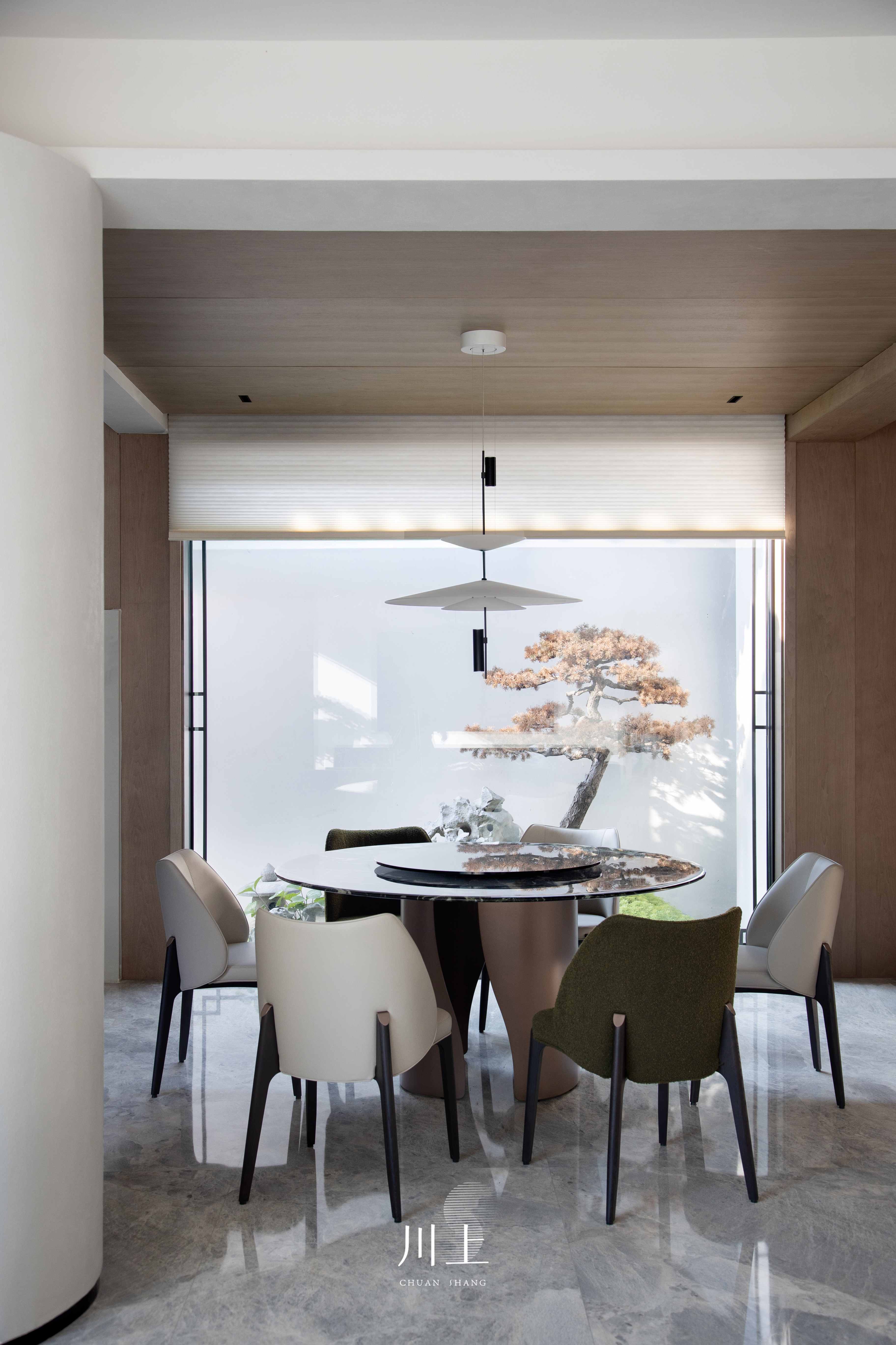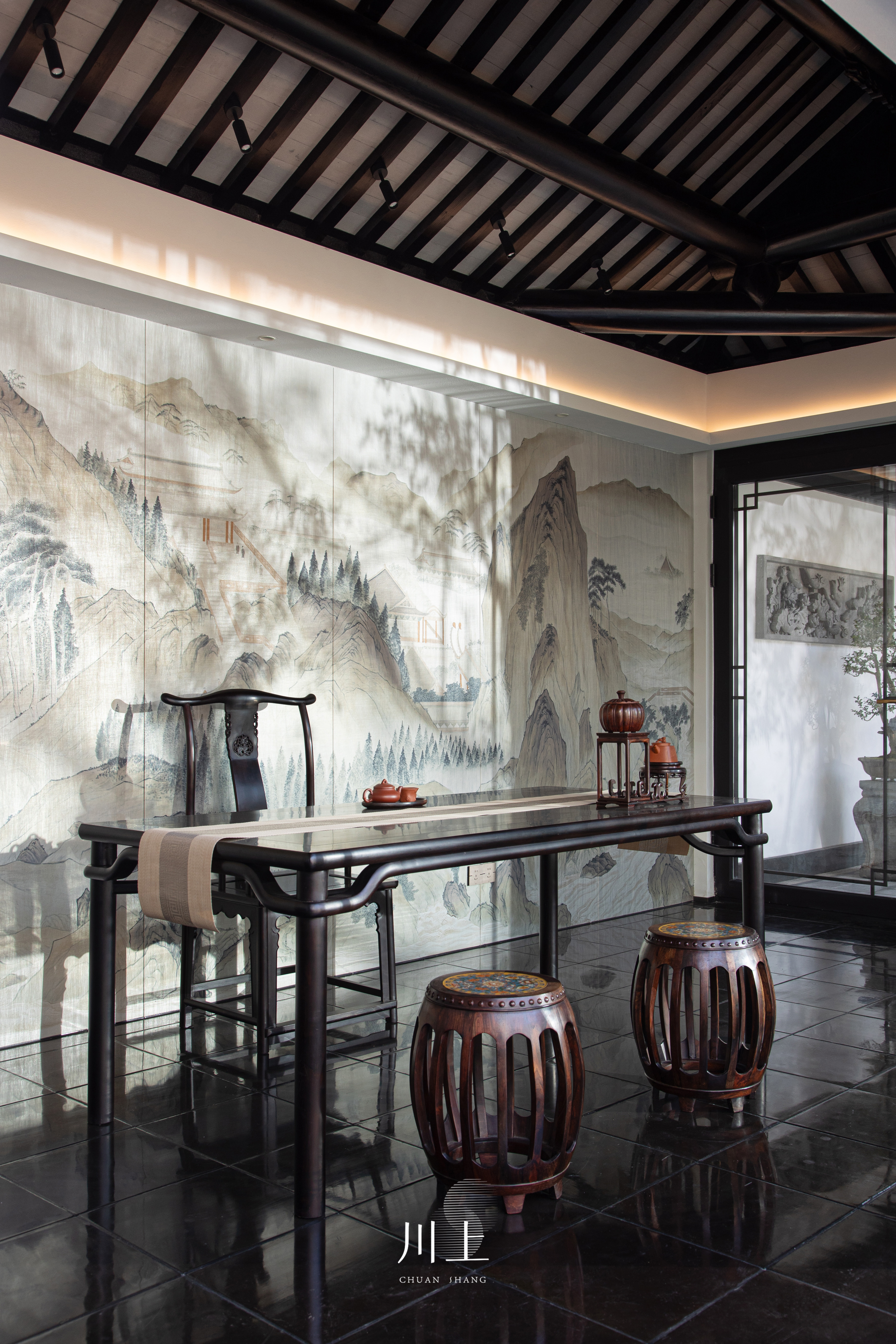 伫立于客厅的两个承重柱,设计师分别做了不同的处理。一侧外包成圆柱形涂刷艺术漆,与墙面涂料保持一致,弱化存在感。另一侧的承重柱,则与格栅一起打造成玄关造型,同时通过石材和吊灯的点缀,强化它的造型感和设计感。独立中厨,满足中式烹饪的全面性与高效性,隔绝油烟,居于一隅。开放西厨与岛台,满足无烟蒸烤、烘焙,强调互动性与情调。中西结合的配置,不仅丰富了饮食体验,提升了生活品质,更是日益迭代的家居智慧的体现。意式属性强烈的餐桌,与中式意蕴的窗景,在温润木作的包裹中相互对望。“山中习静观朝槿,松下清斋折露葵”。中式造景与现代气息碰撞出的静奢感与隐逸的诗意,充斥满整个空间。潺潺流水,氤氲茶香。穿过园子的石桥便来到茶室厢房。设计师保留了原始建筑的顶面结构,与山水壁画、中式茶桌椅、地面金砖等相互呼应,更显古色古香。