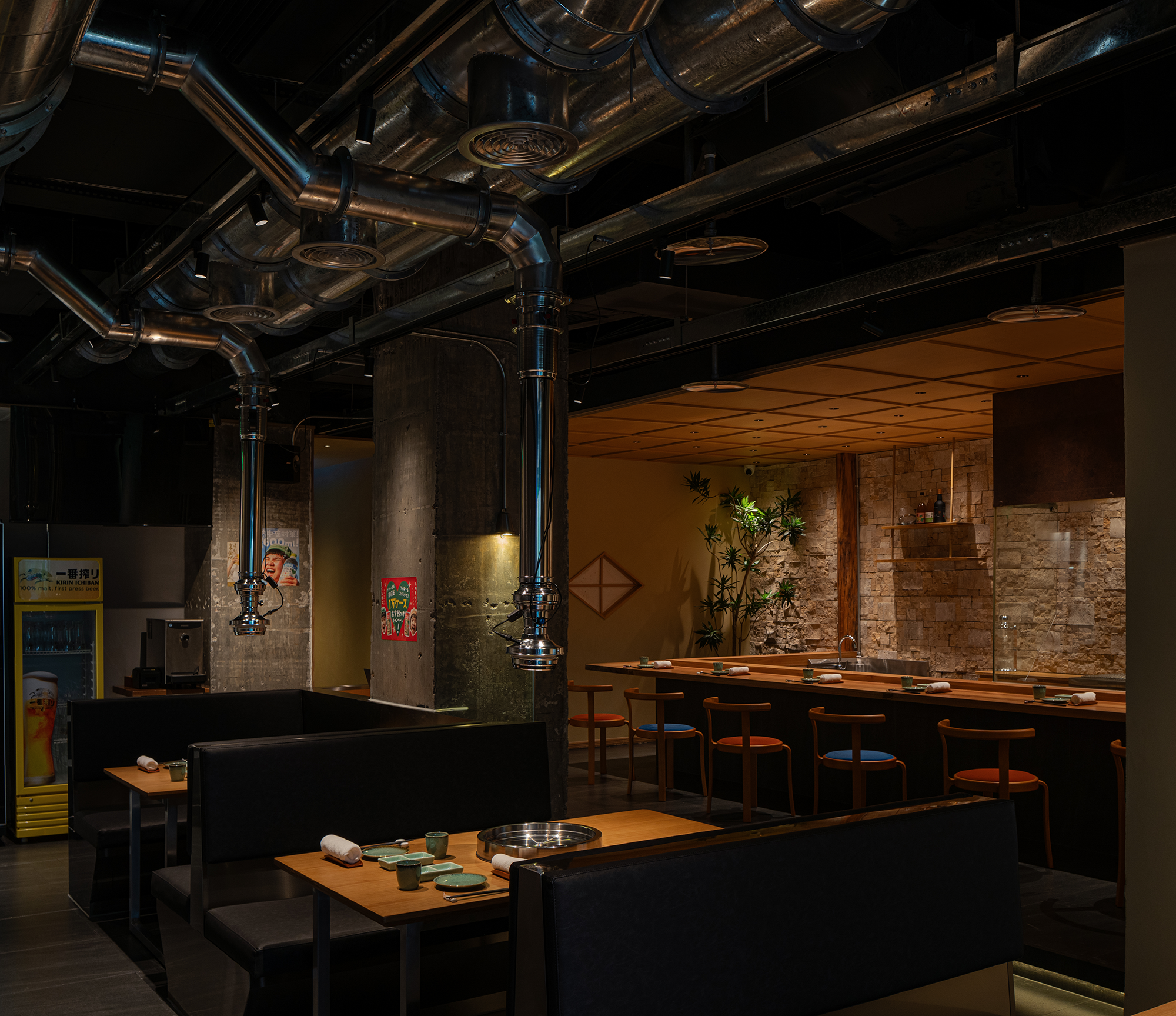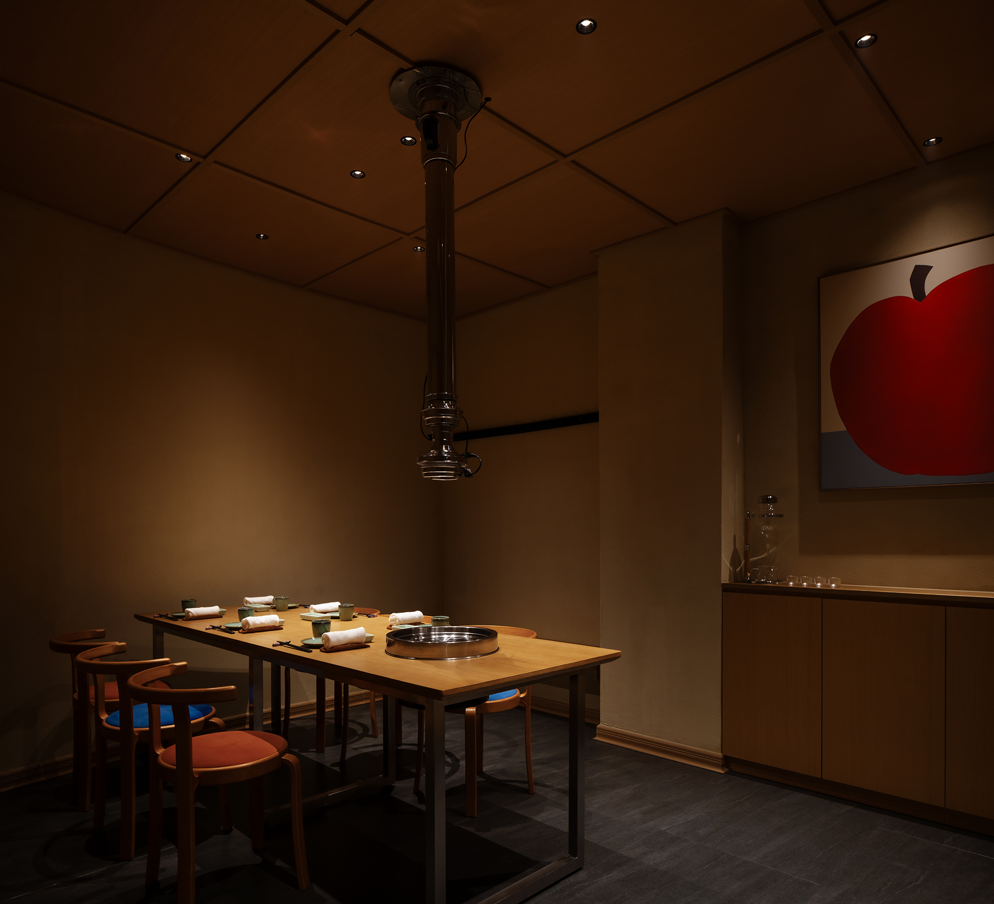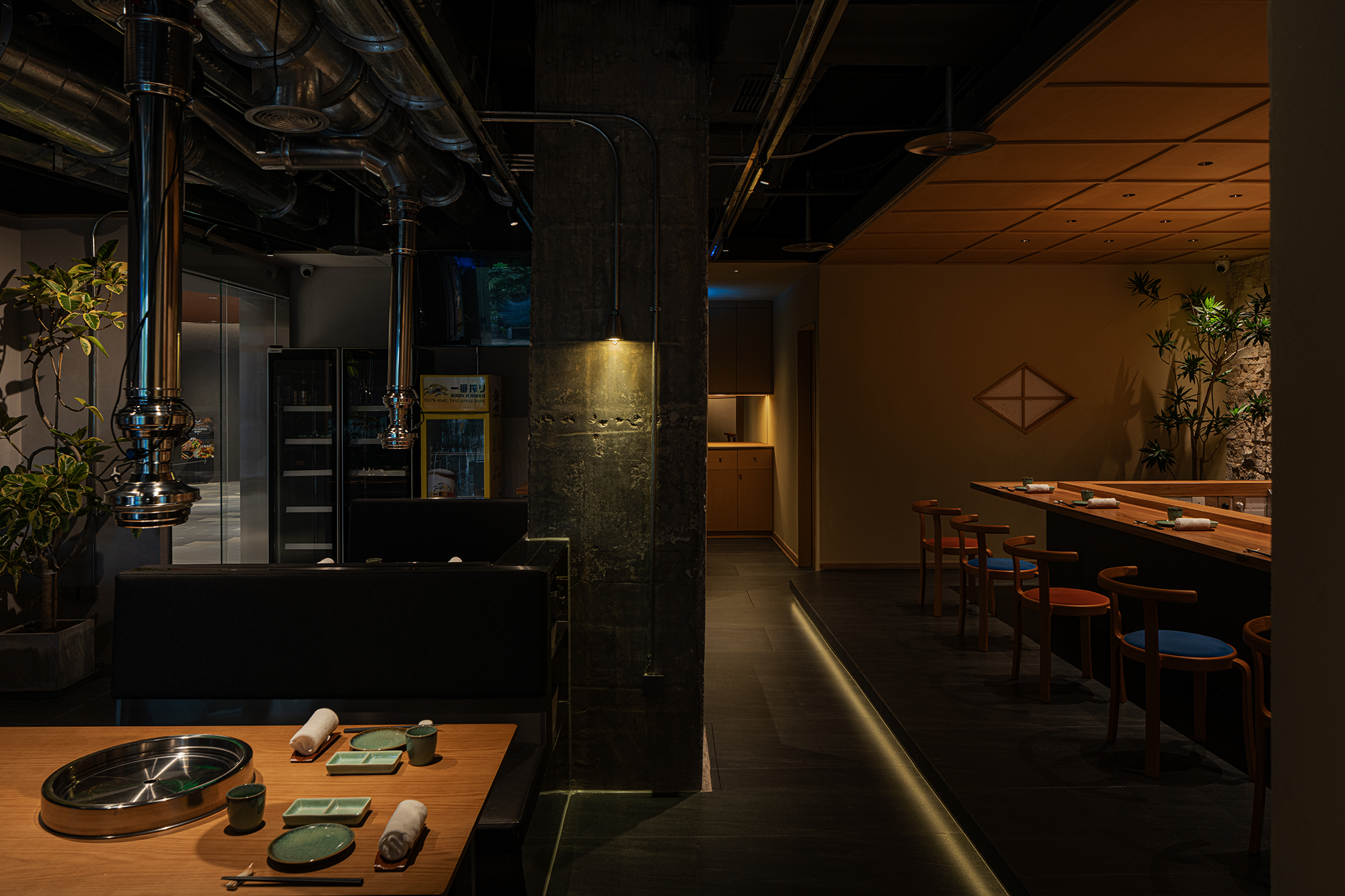 在布局中,我们保留了日式餐饮文化中的板前。吧台內主要为简餐的备餐与出品,这样一是可以更大化就餐位置,二是可以避免单人吃烤肉的尴尬,感受烤肉的omakase,提升食客的用餐体验感。大厅整体以4-6人位为主,也设计了8-10人的独立包房,方便聚会宴请。