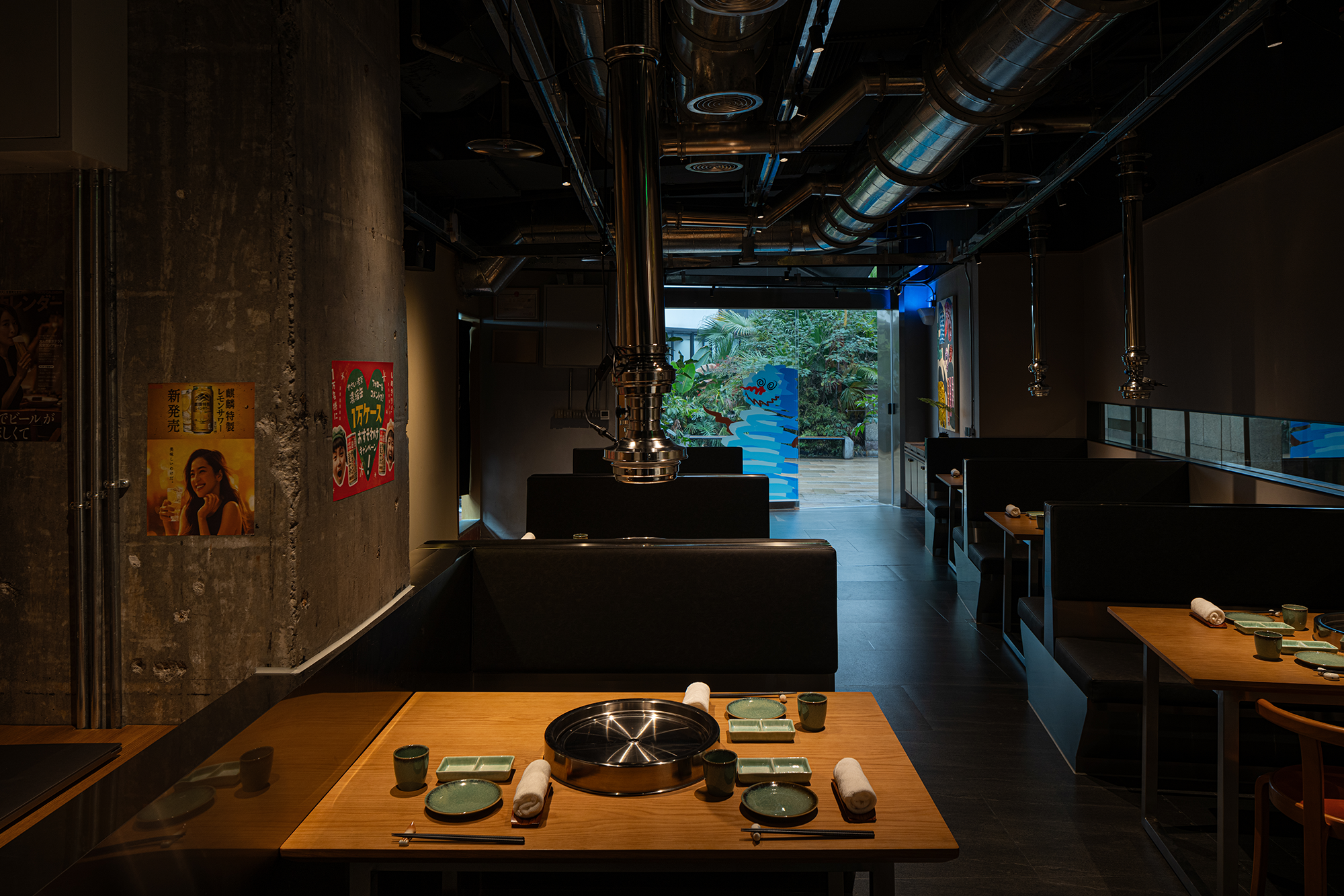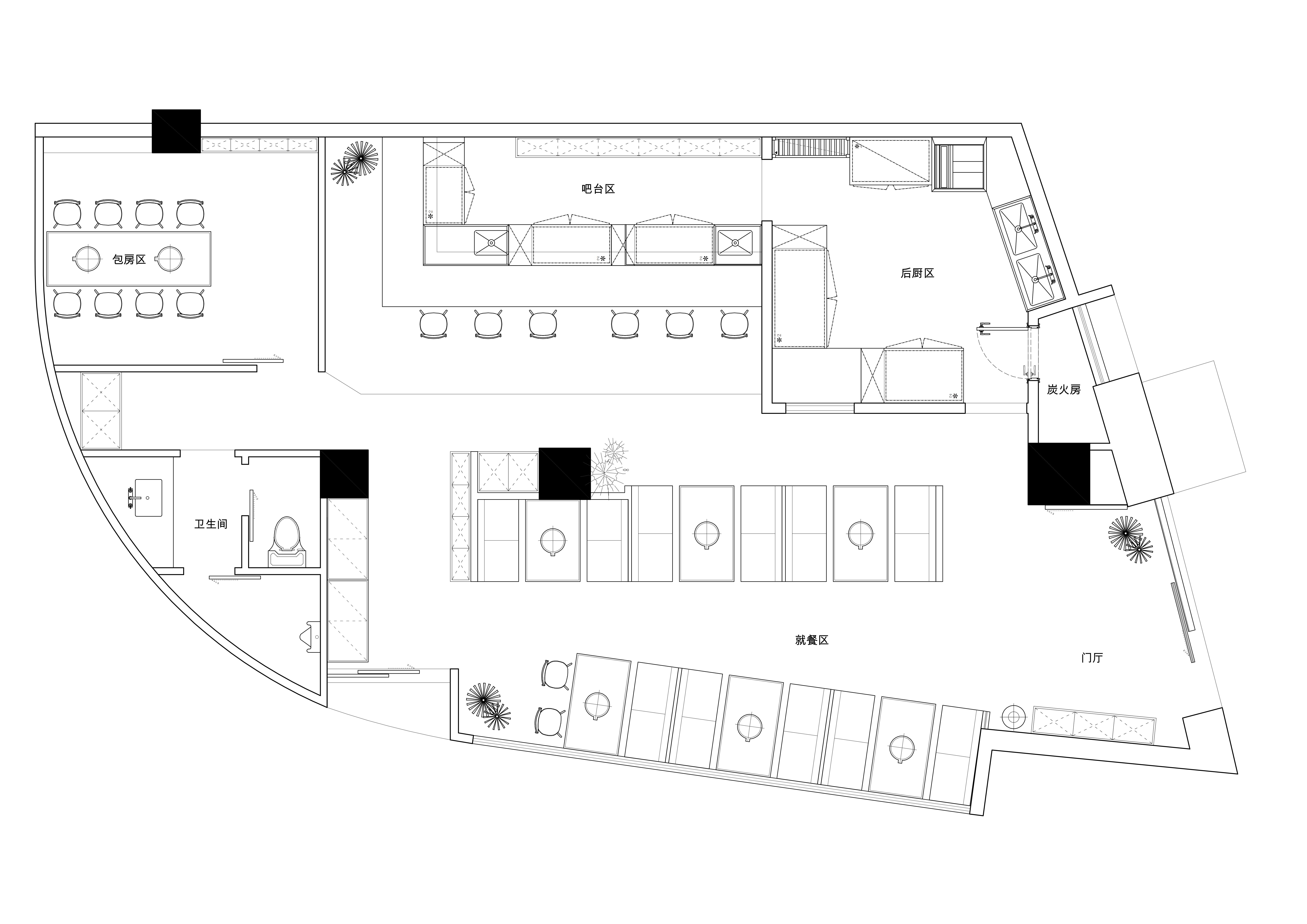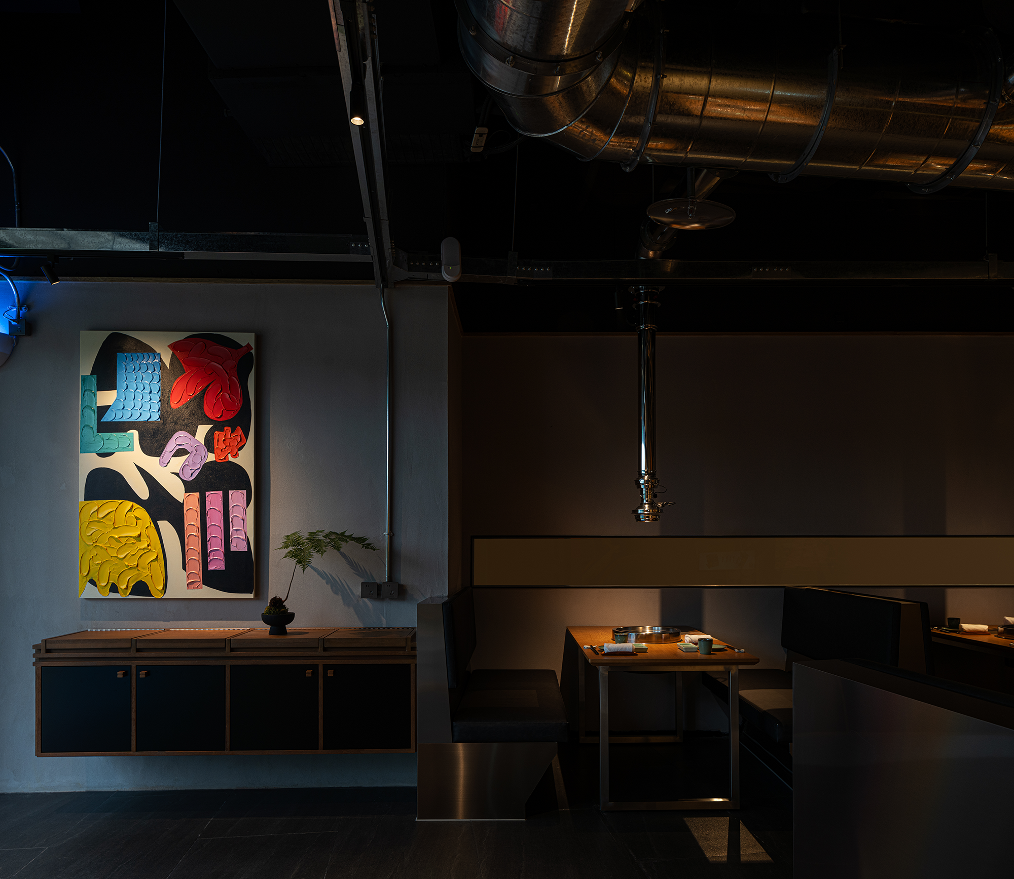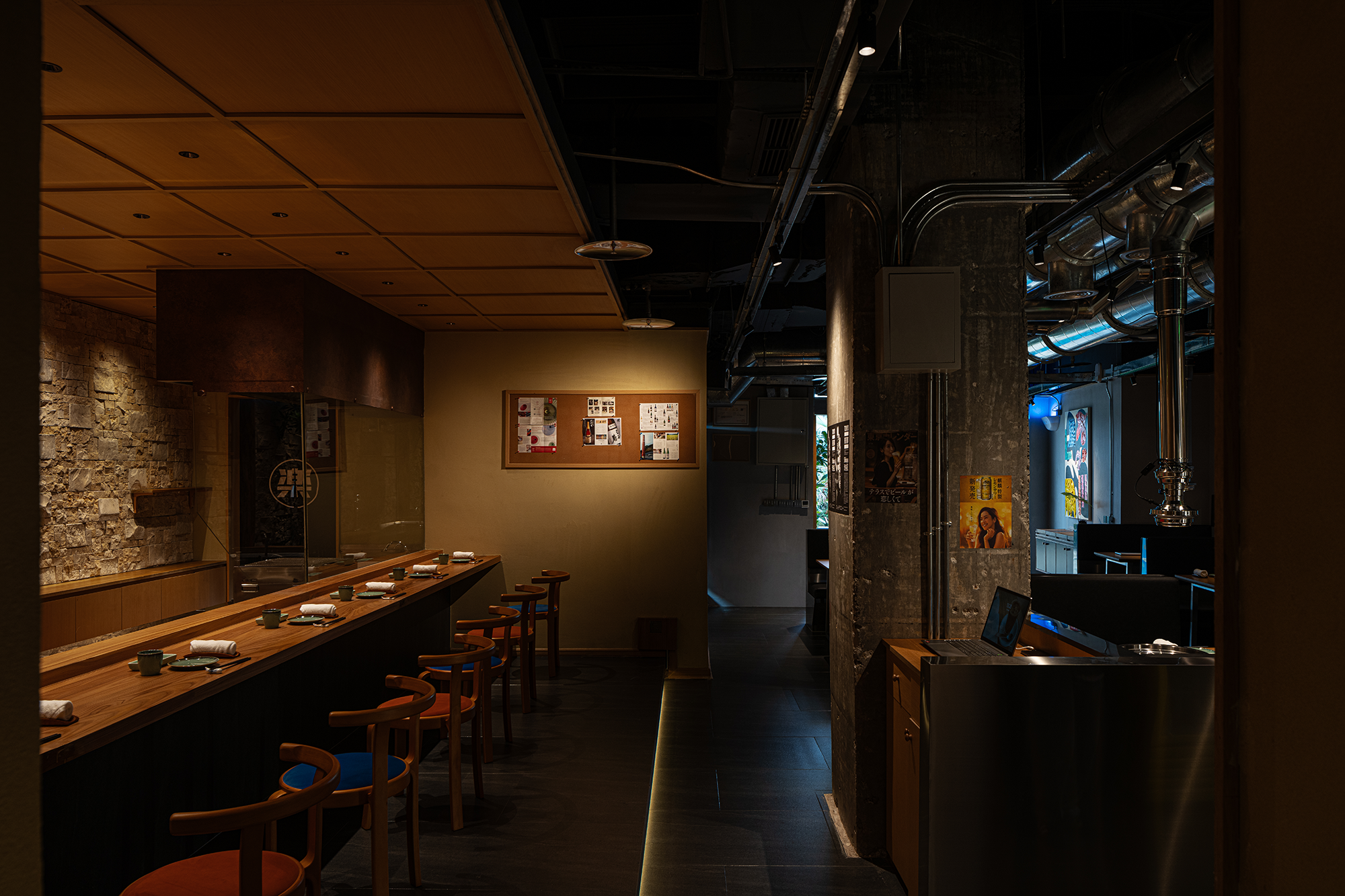 在布局中,我们保留了日式餐饮文化中的板前。吧台內主要为简餐的备餐与出品,这样一是可以更大化就餐位置,二是可以避免单人吃烤肉的尴尬,感受烤肉的omakase,提升食客的用餐体验感。大厅整体以4-6人位为主,也设计了8-10人的独立包房,方便聚会宴请。