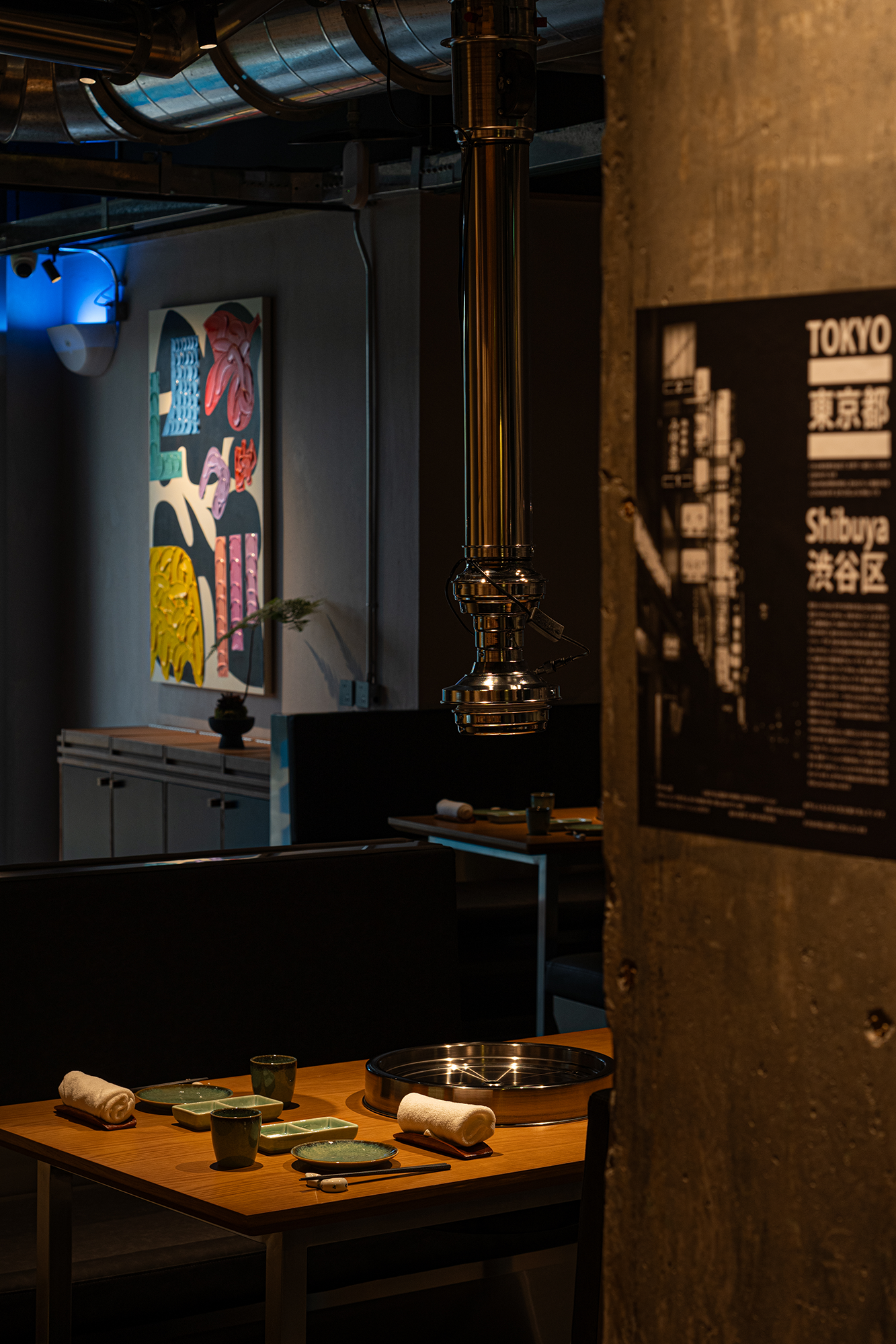 这是一家以日本关西烤肉风味为主的和牛焼肉酒场,我们在设计时希望跳出传统日式烤肉店设计的传统做法,以更年轻化的风格来呈现他,同时尽可能的节约成本。在设计中,我们保留了部分日式风格元素,包括原木,板前,吊牌等,加入了工业风的水泥,金属,植物,色彩,灯光等,让整个空间不再是千篇一律的灰调,它更有温度,也更有态度!